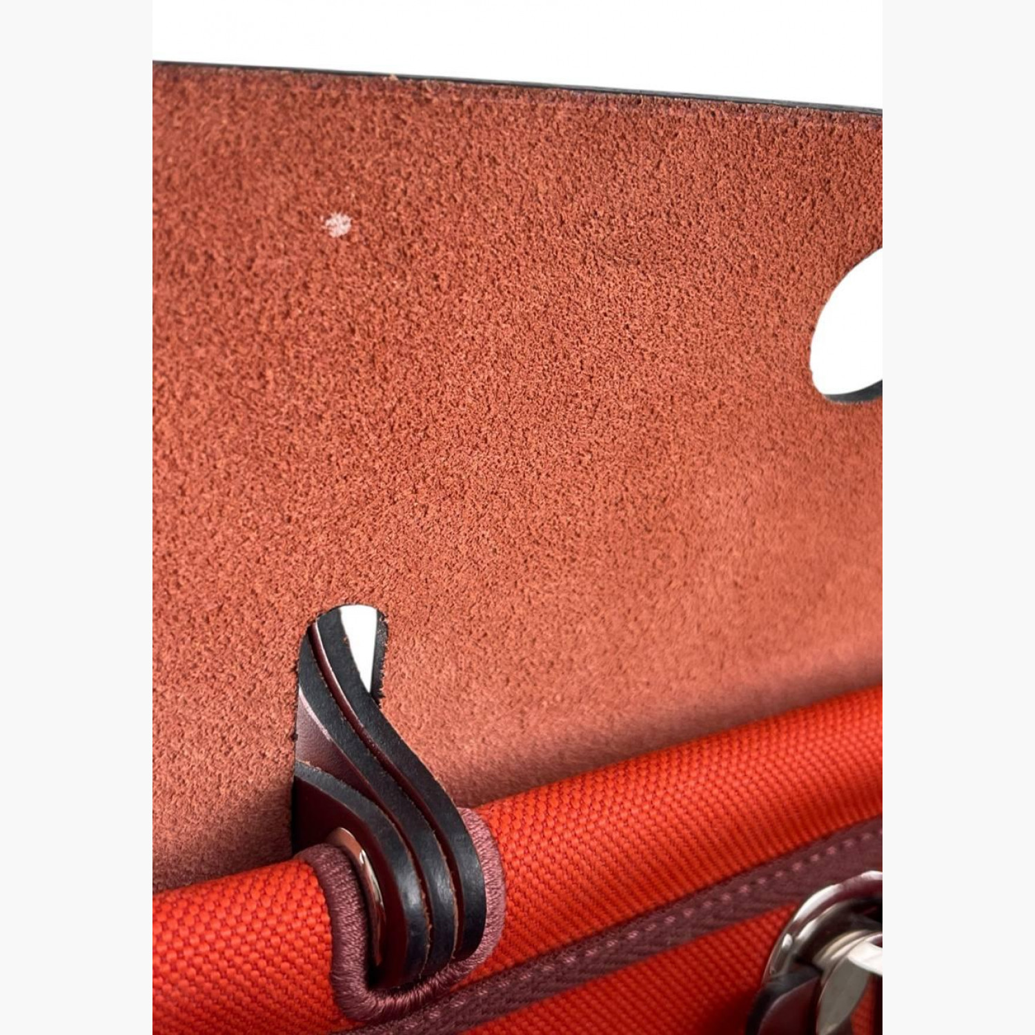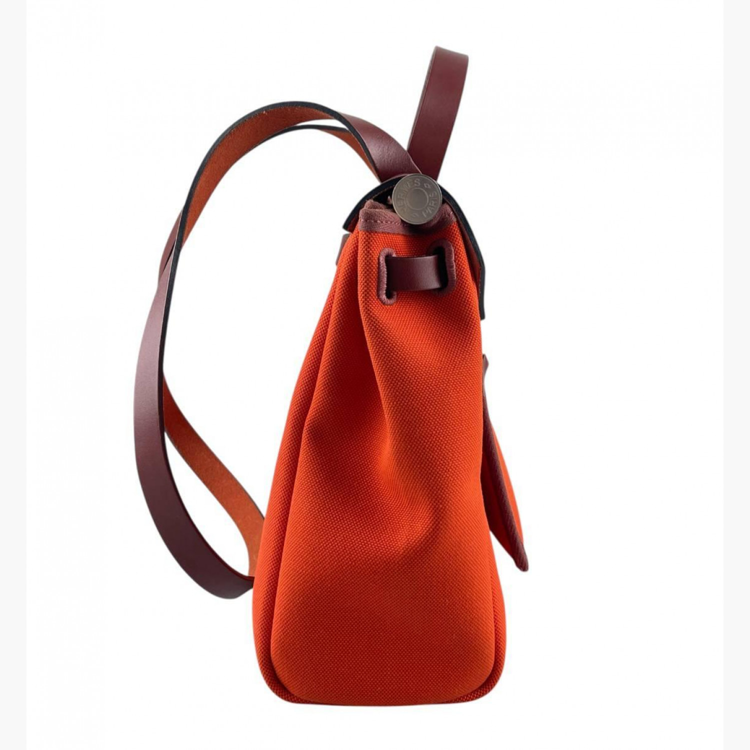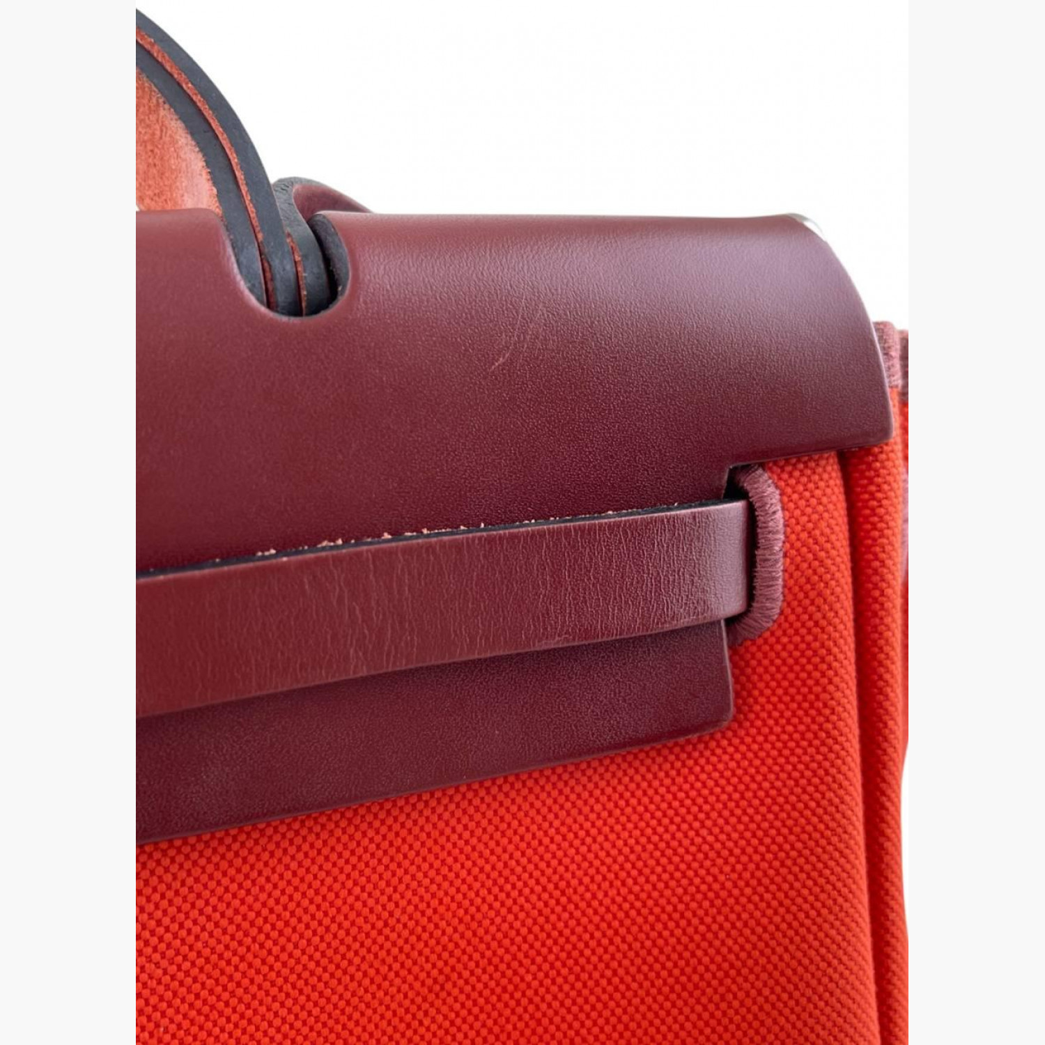Red bag crafted from leather and canvas. Features one main compartment. In good condition with wear marks.