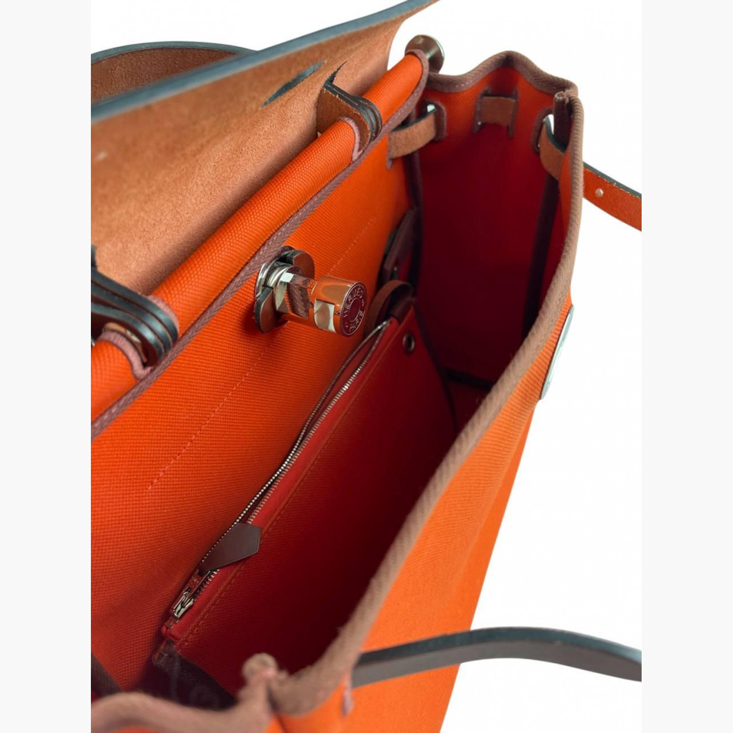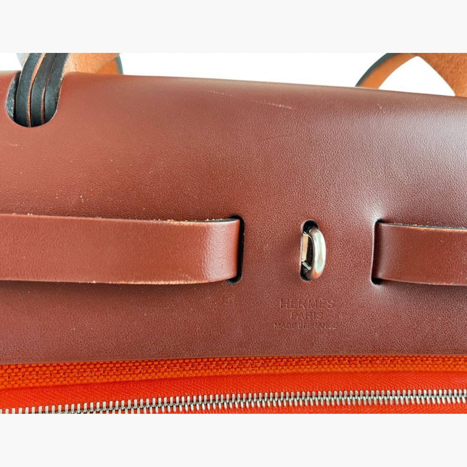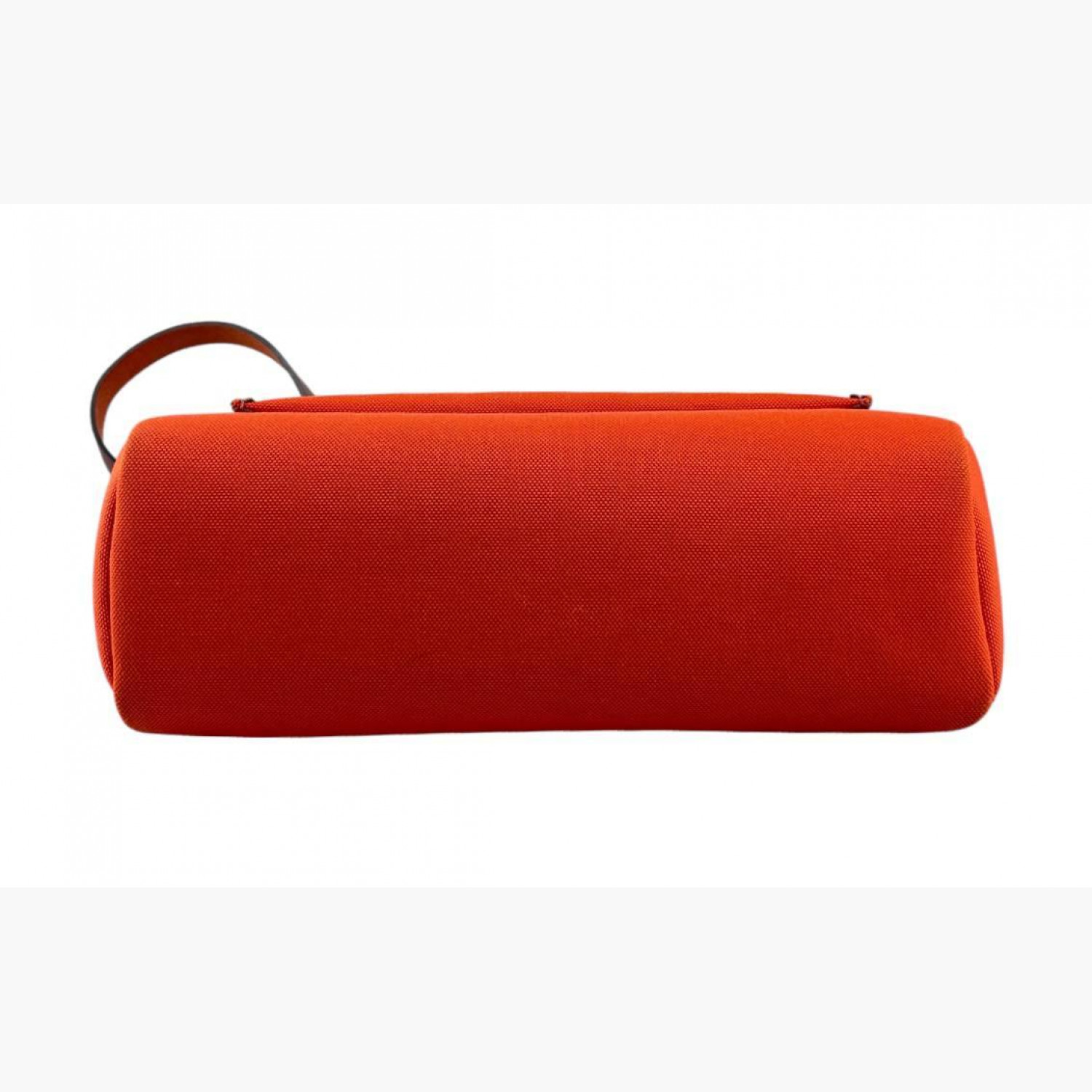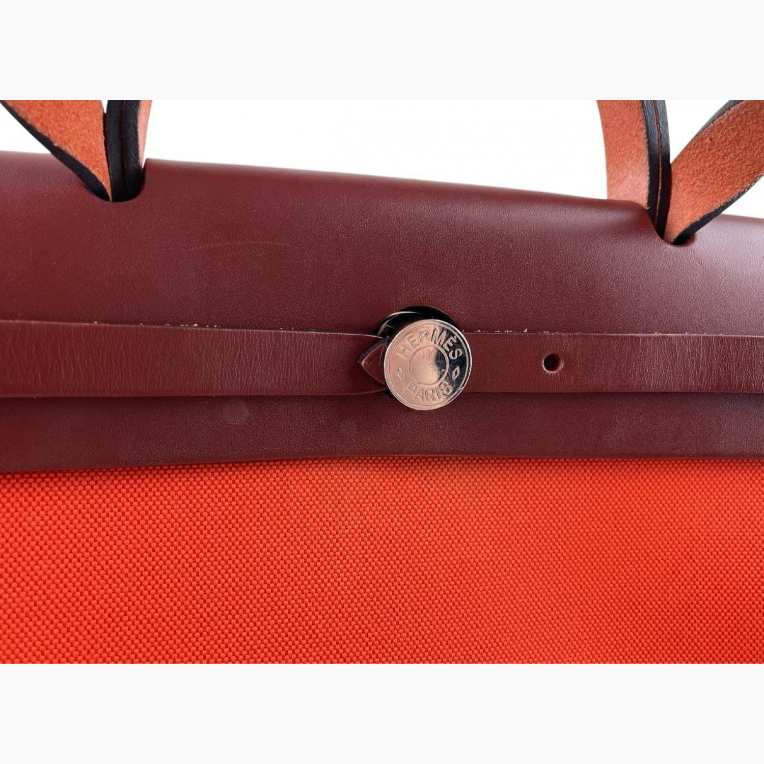 Red bag crafted from leather and canvas. Features one main compartment. In good condition with wear marks.