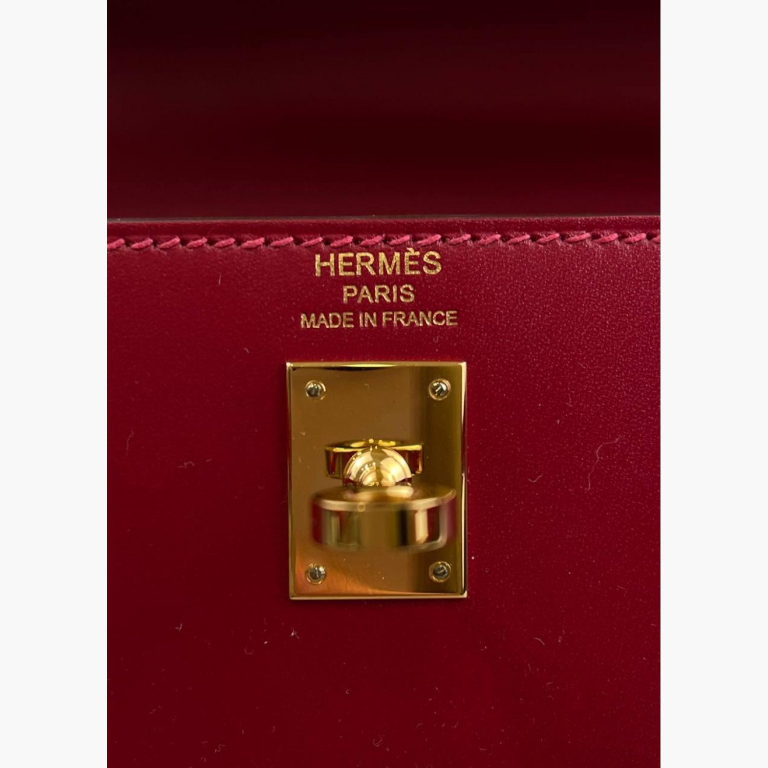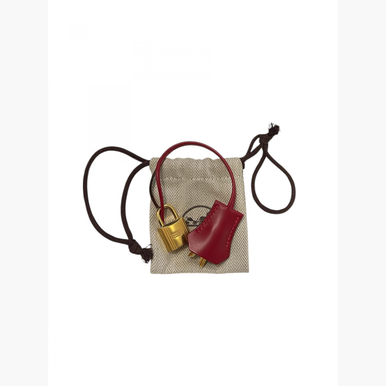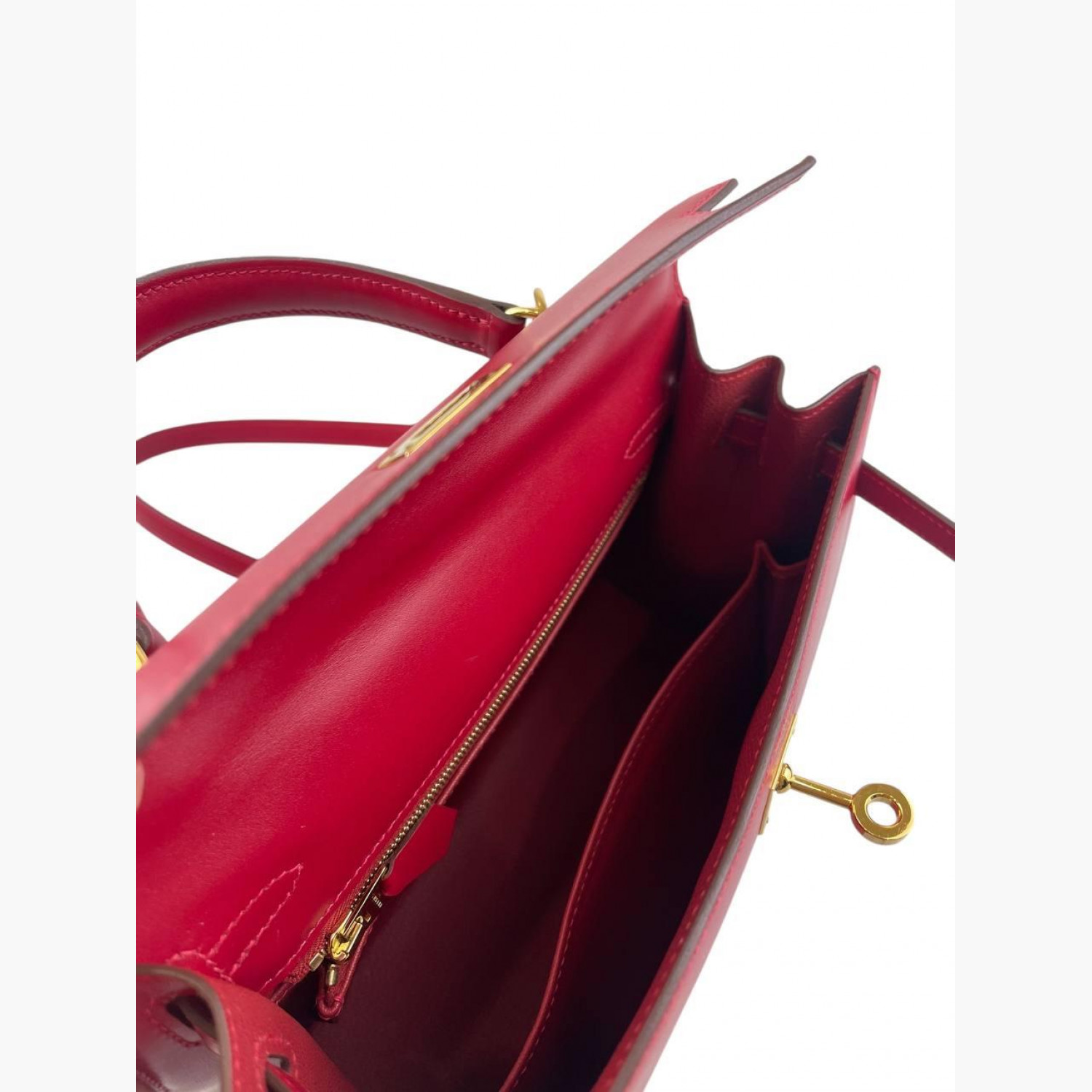 Red leather bag. One main compartment with a zip pocket and an open pocket inside. Comes with keys and a padlock. In excellent condition, with wear marks.
