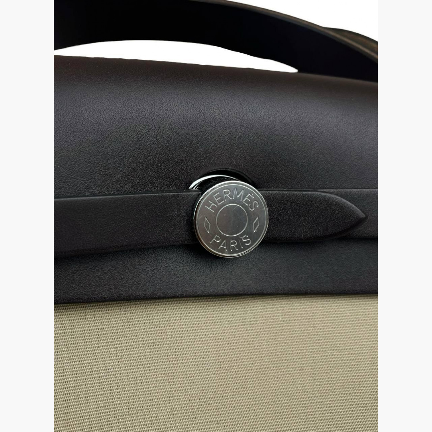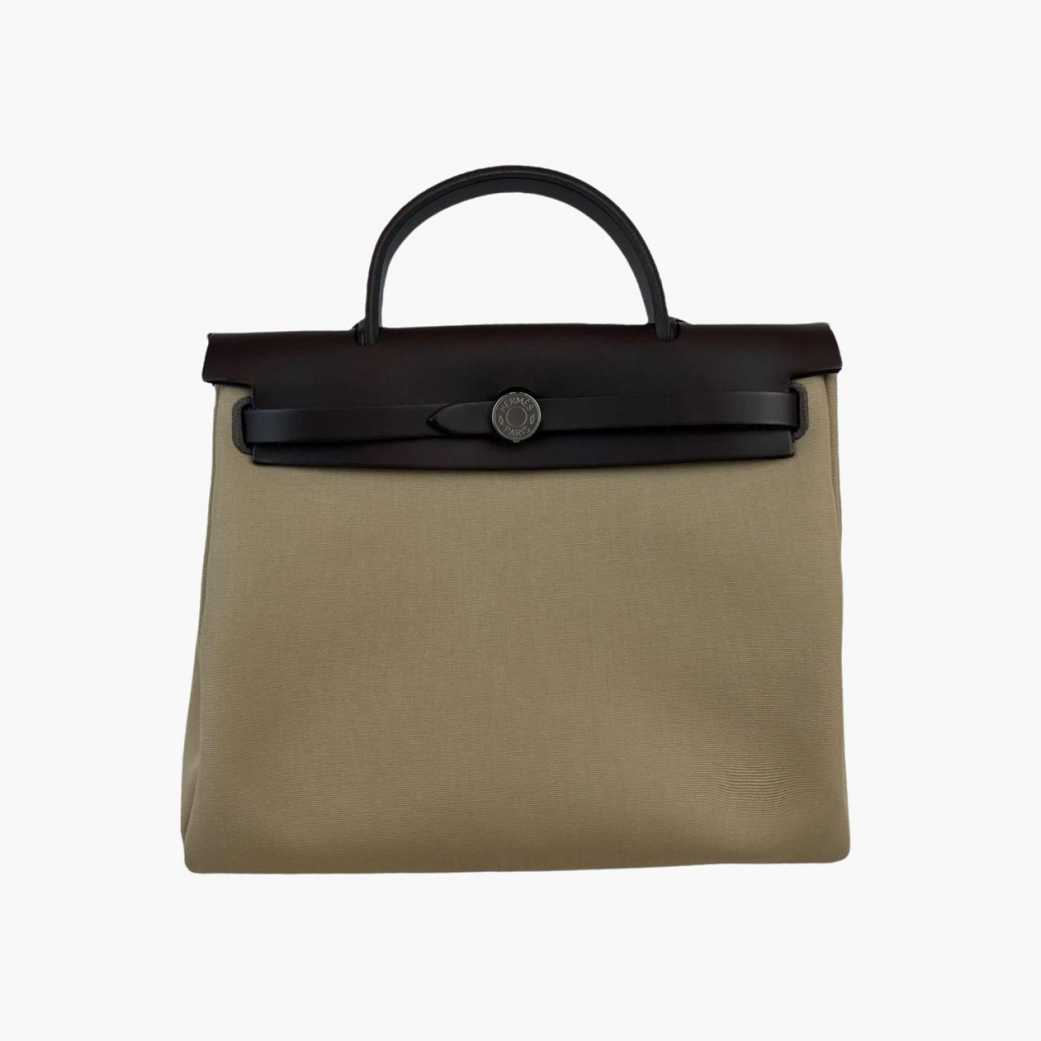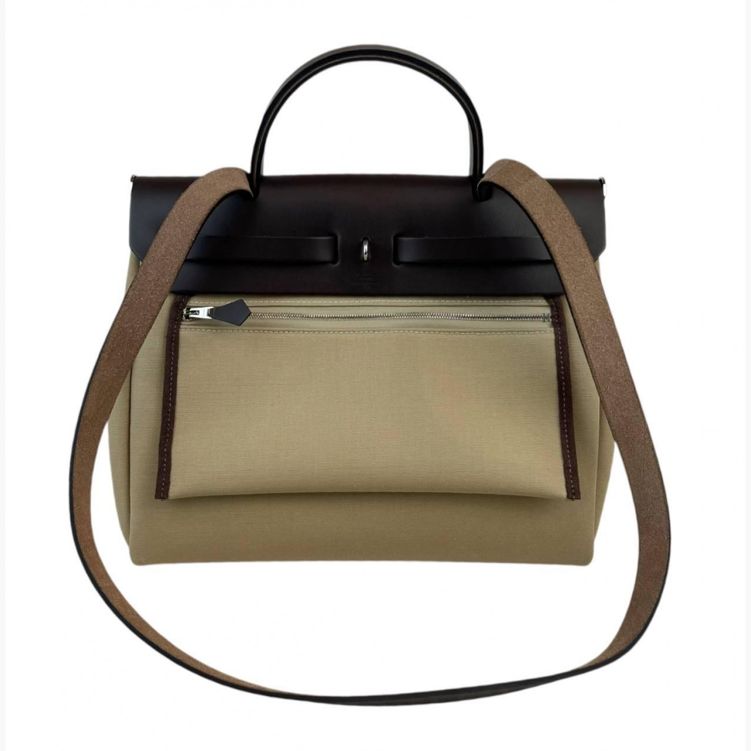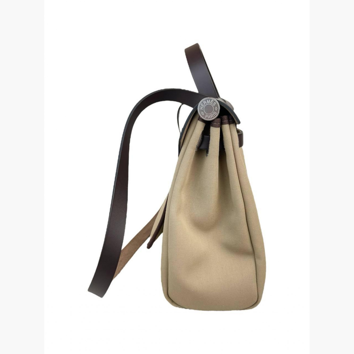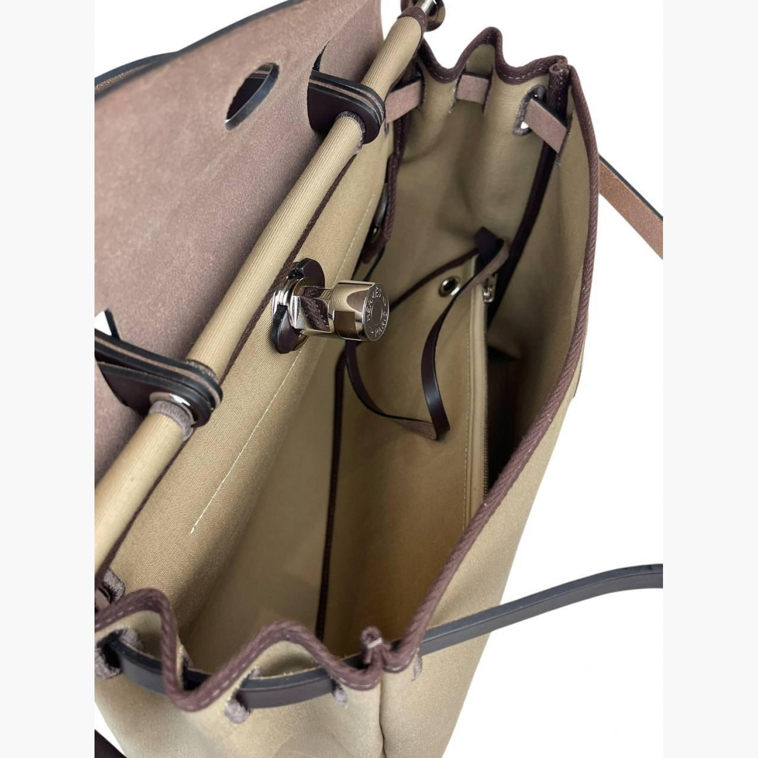 Beige textile bag with a dark brown leather flap and straps. One main compartment inside with a removable zip pocket, as well as a zip pocket on the back of the bag. Absolutely new.