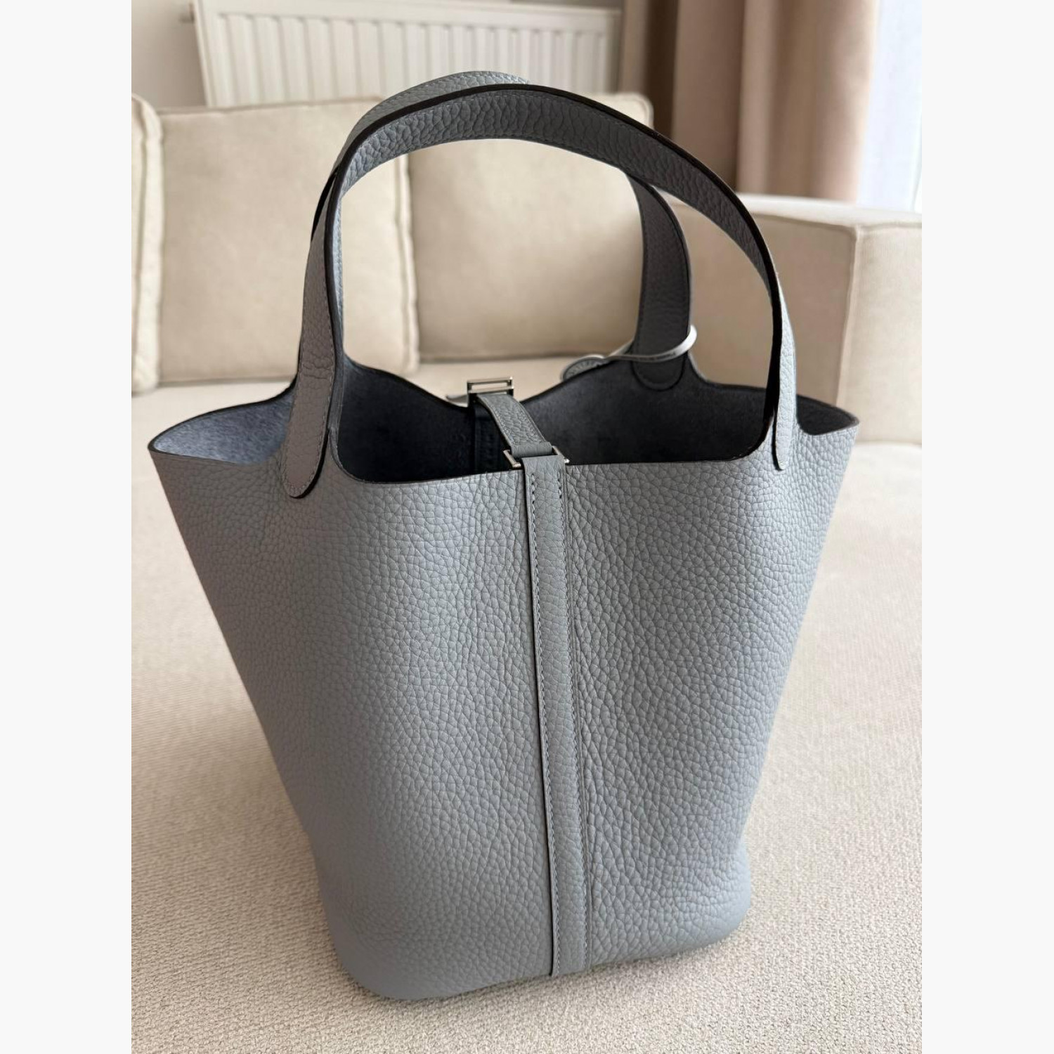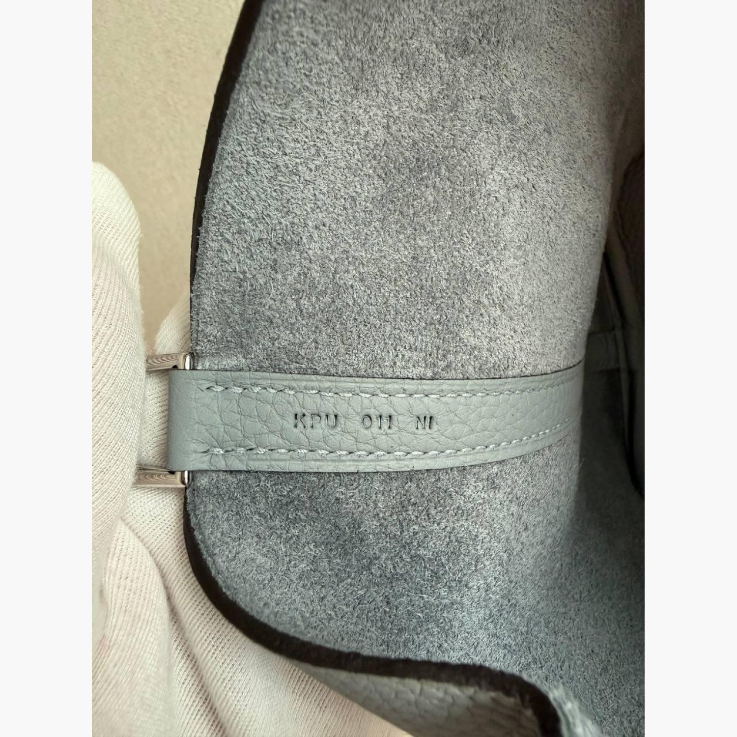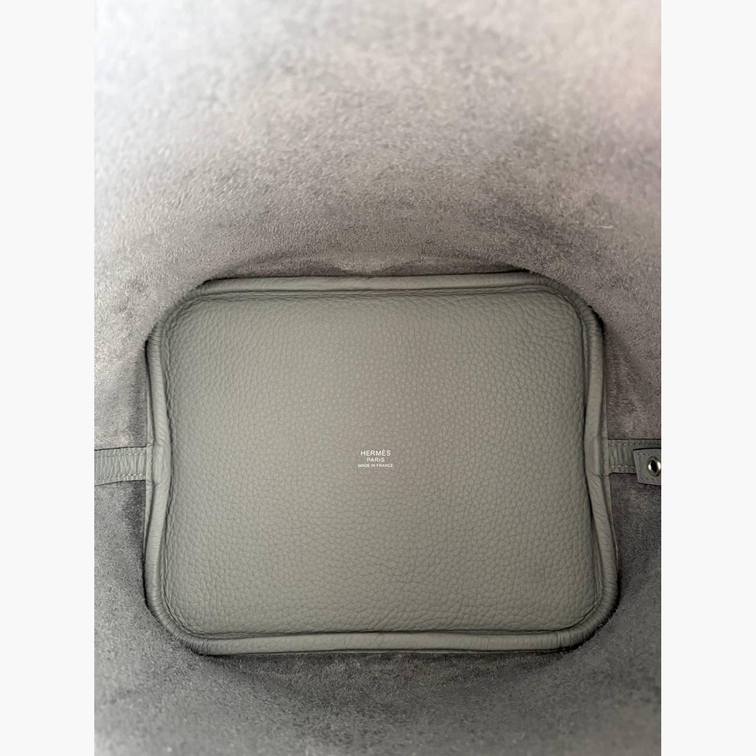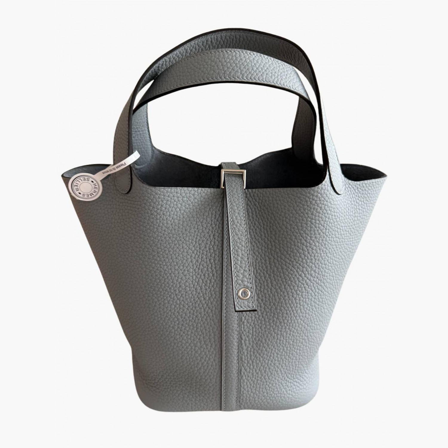 Gray leather bag with a lock and key.Inside, there is one main compartment without pockets.Absolutely new.