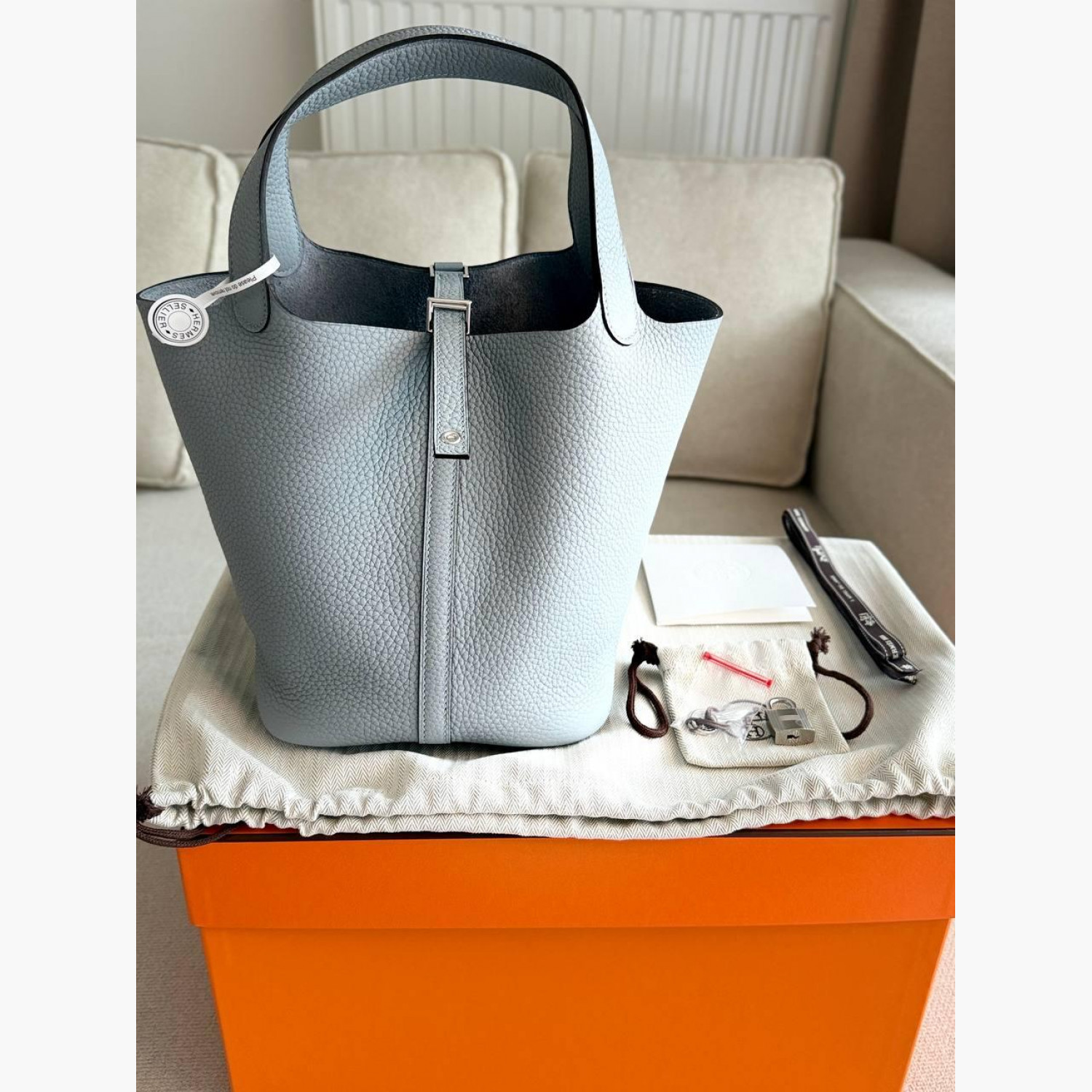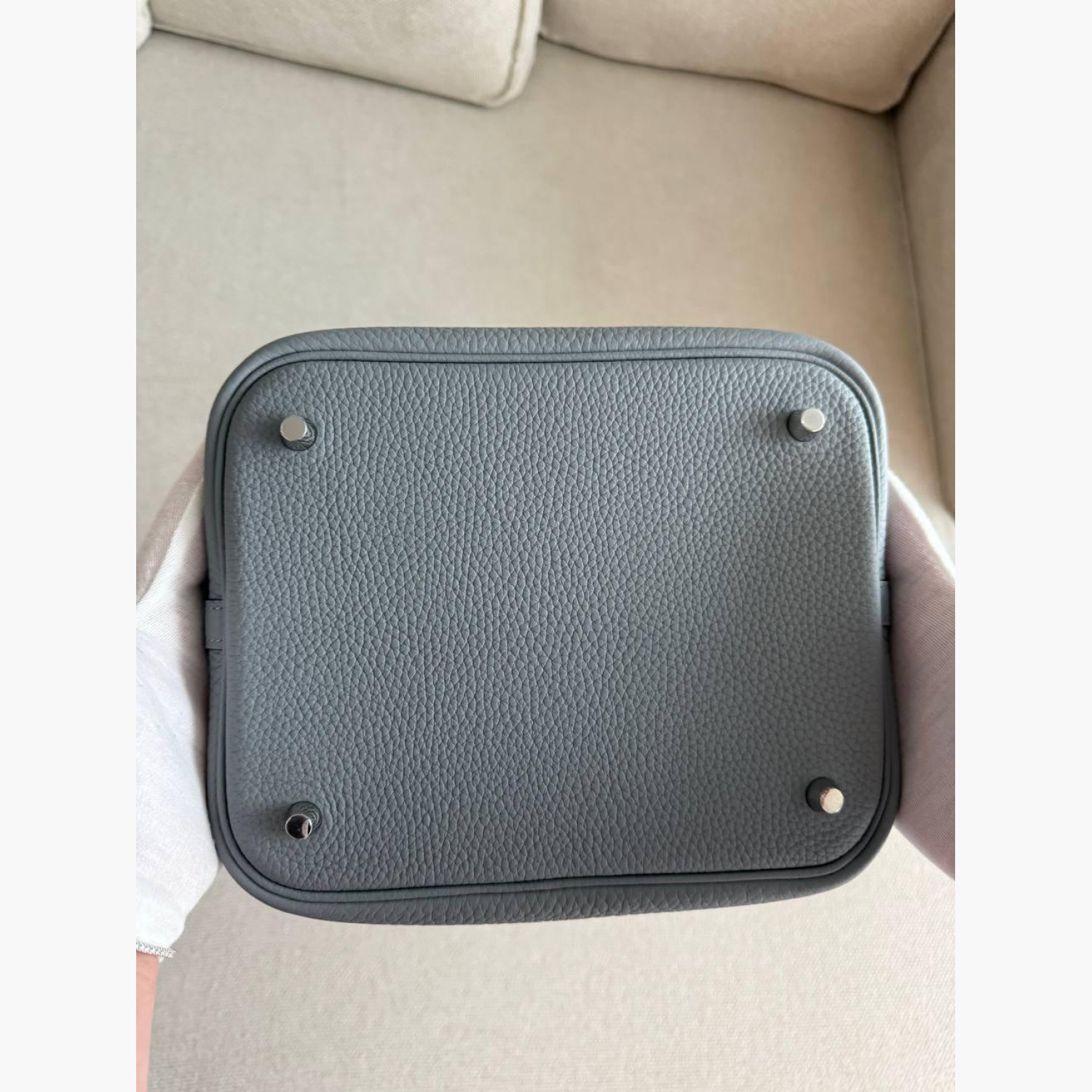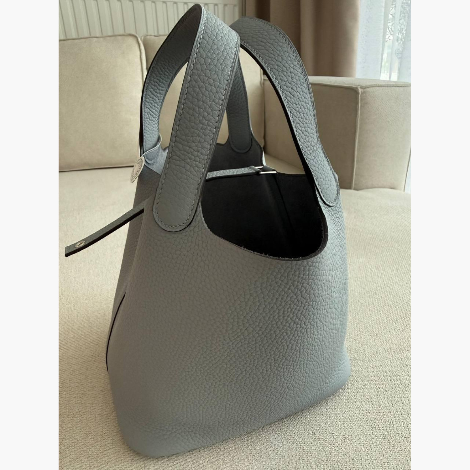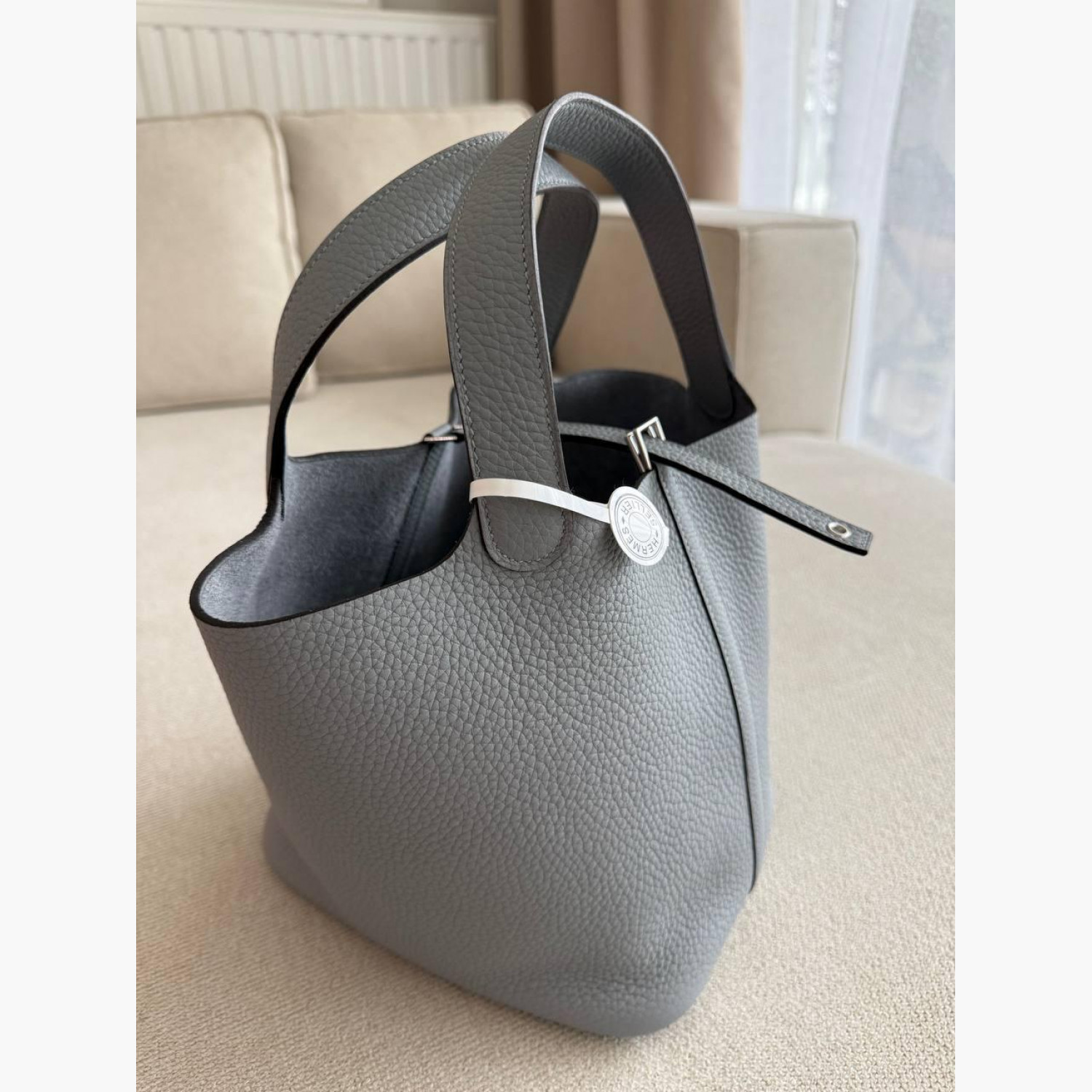 Gray leather bag with a lock and key.Inside, there is one main compartment without pockets.Absolutely new.