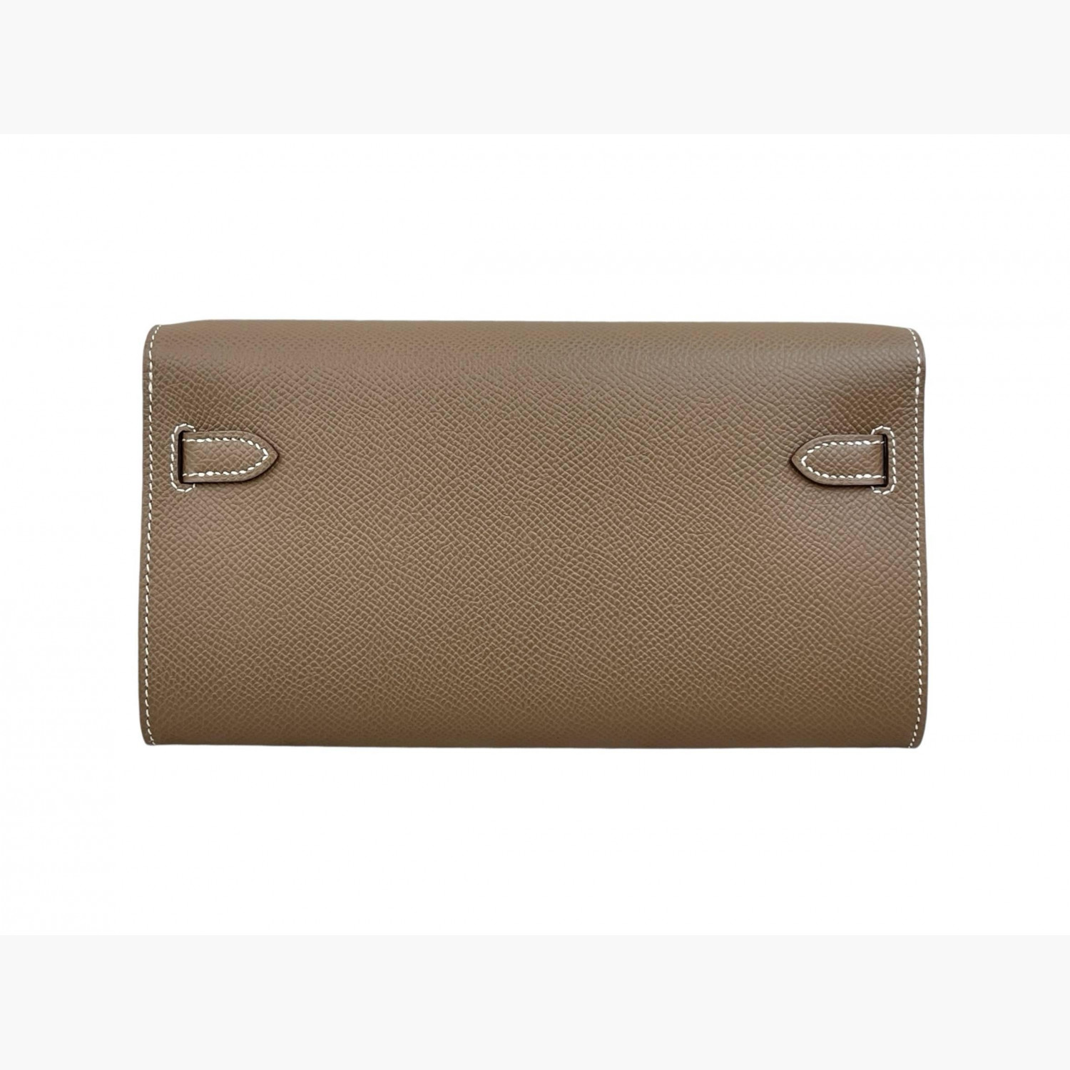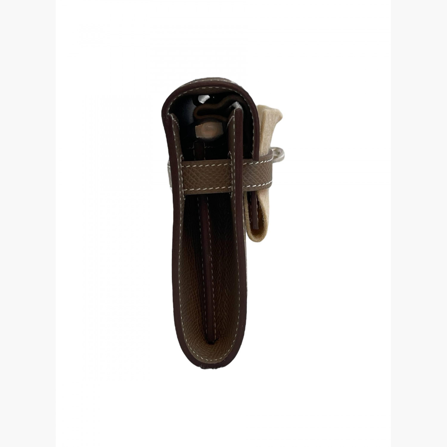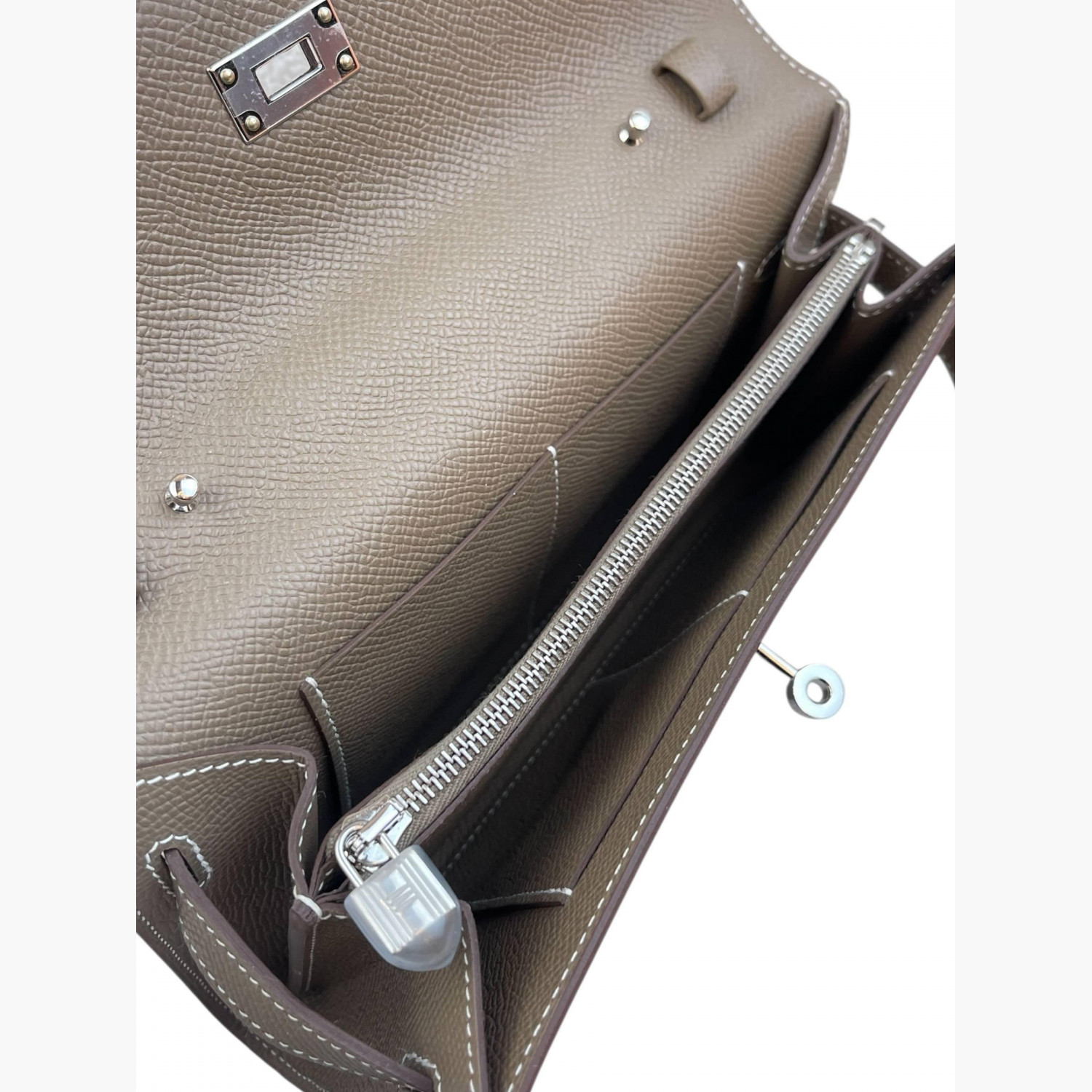 Taupe leather bag with a strap included. Inside, there are two main compartments: the first and second have double open pockets, with a zip compartment between them.