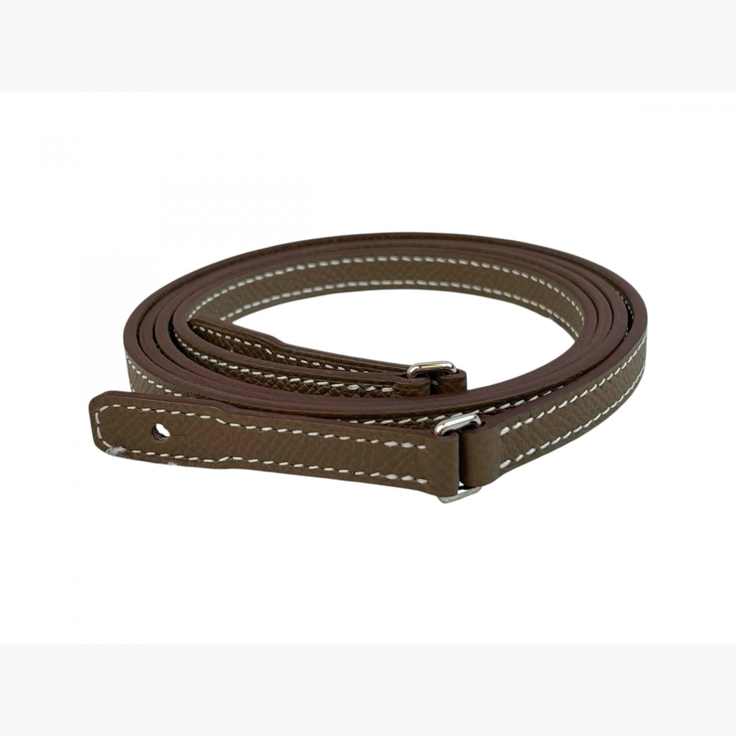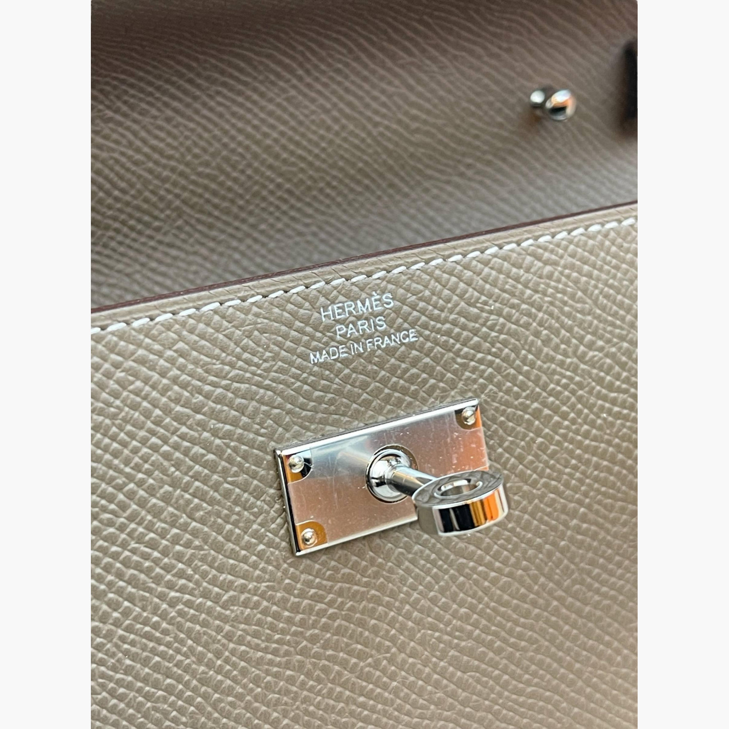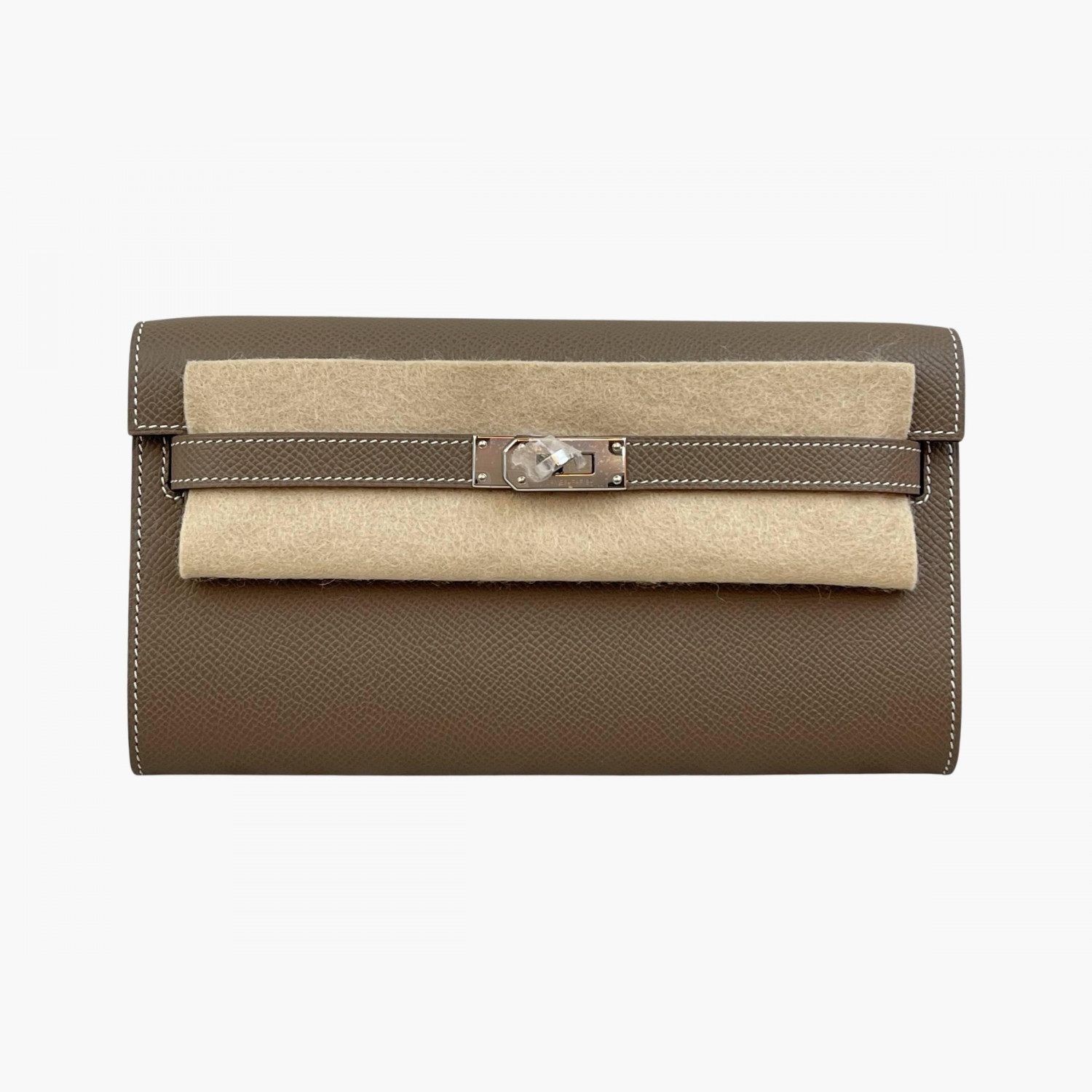 Taupe leather bag with a strap included. Inside, there are two main compartments: the first and second have double open pockets, with a zip compartment between them.