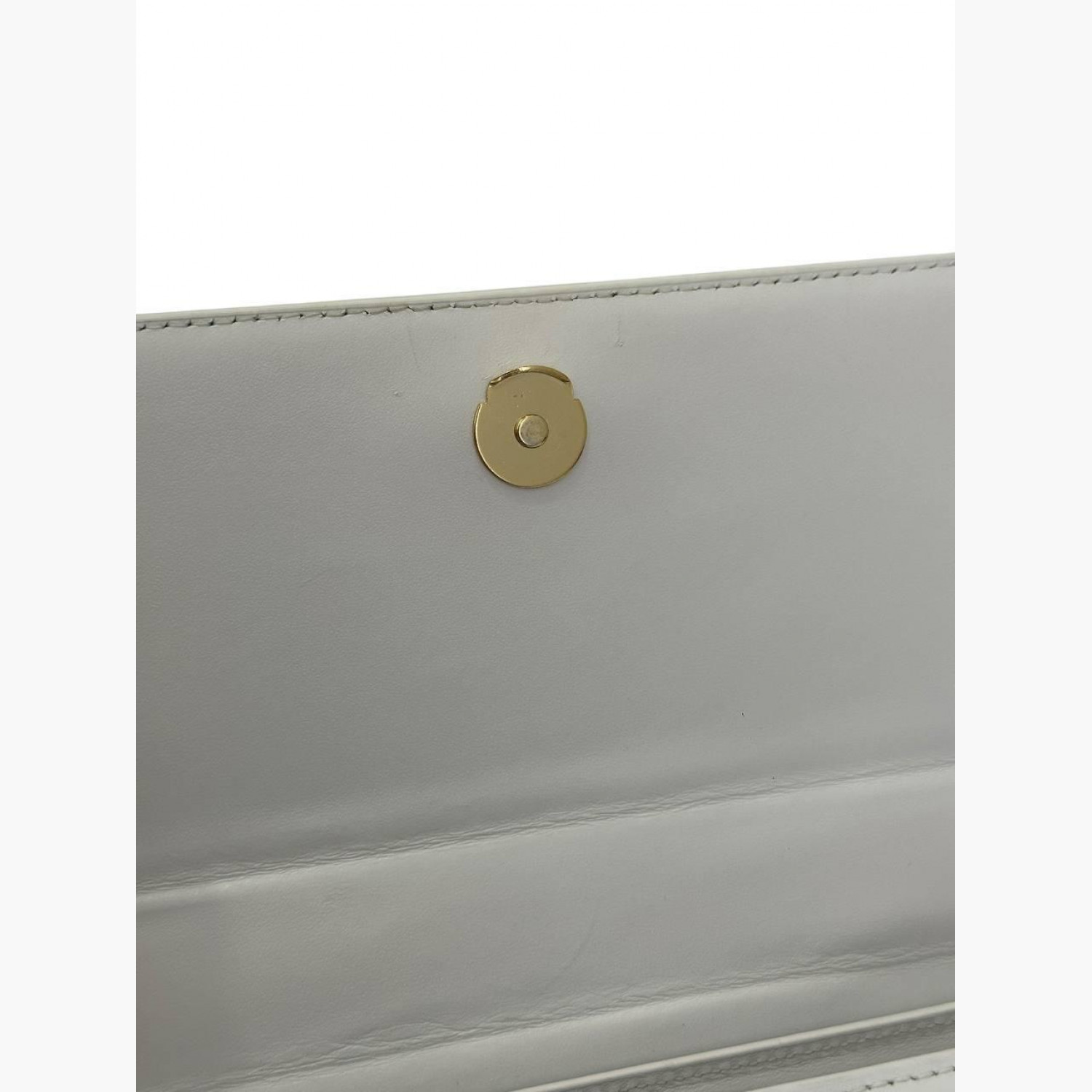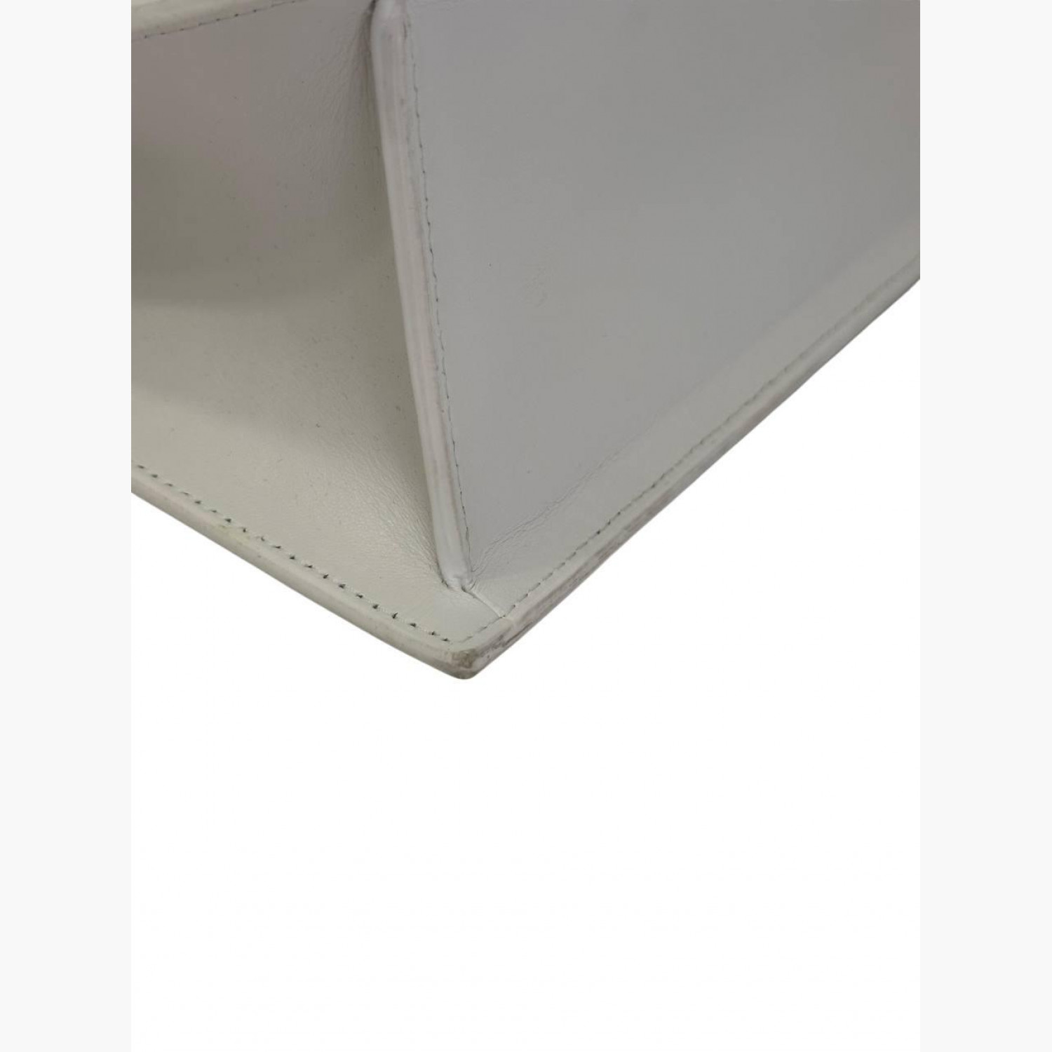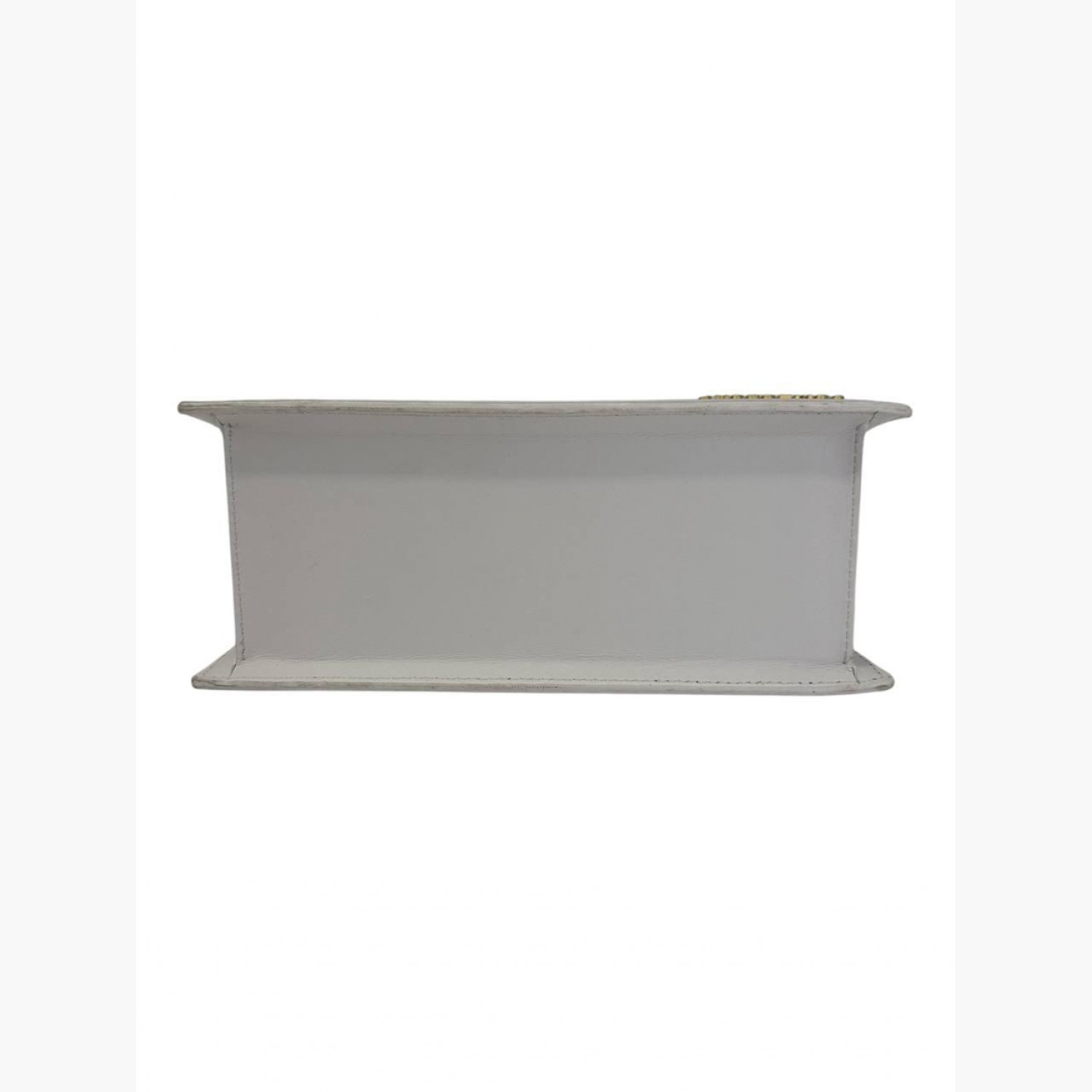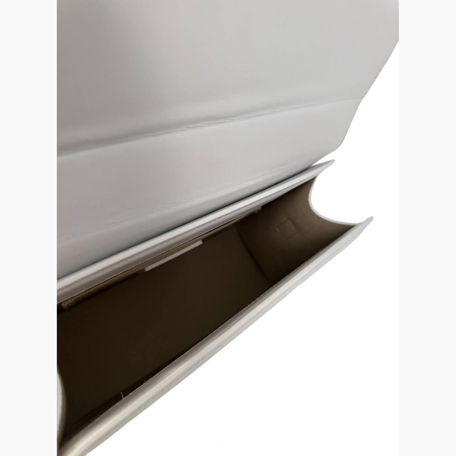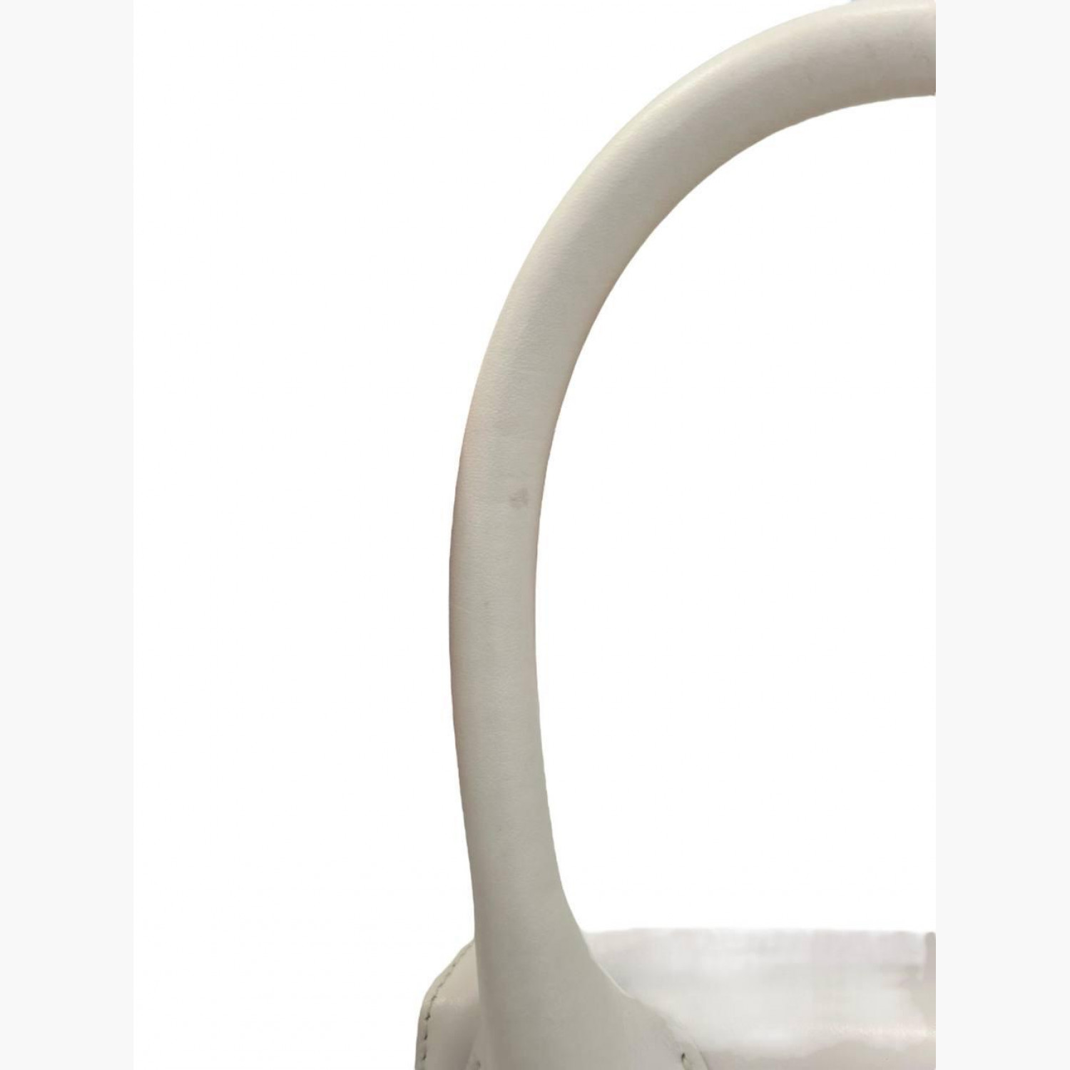White leather bag. One main compartment and a pocket inside. In good condition with scuffs on the leather and hardware. Comes with a removable, adjustable shoulder strap.