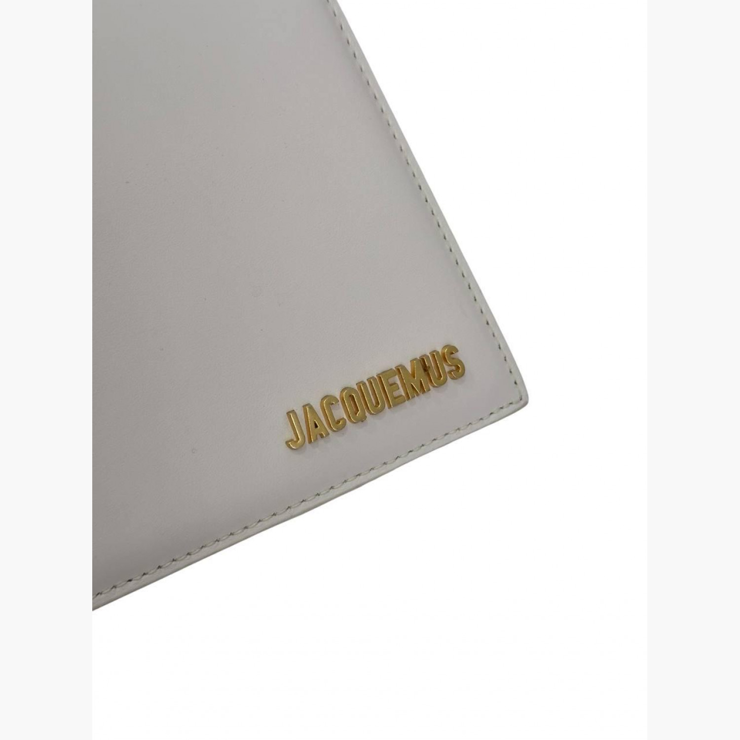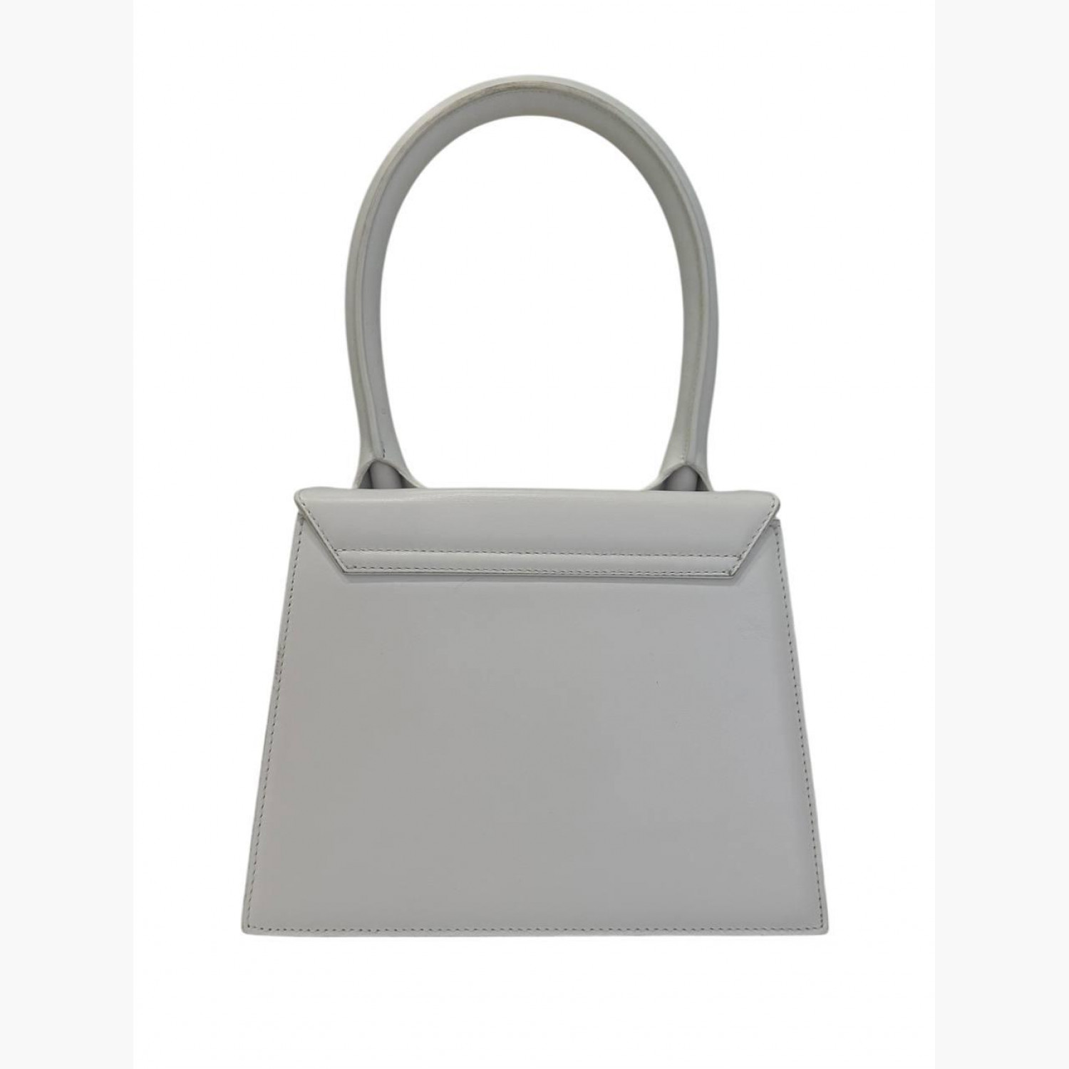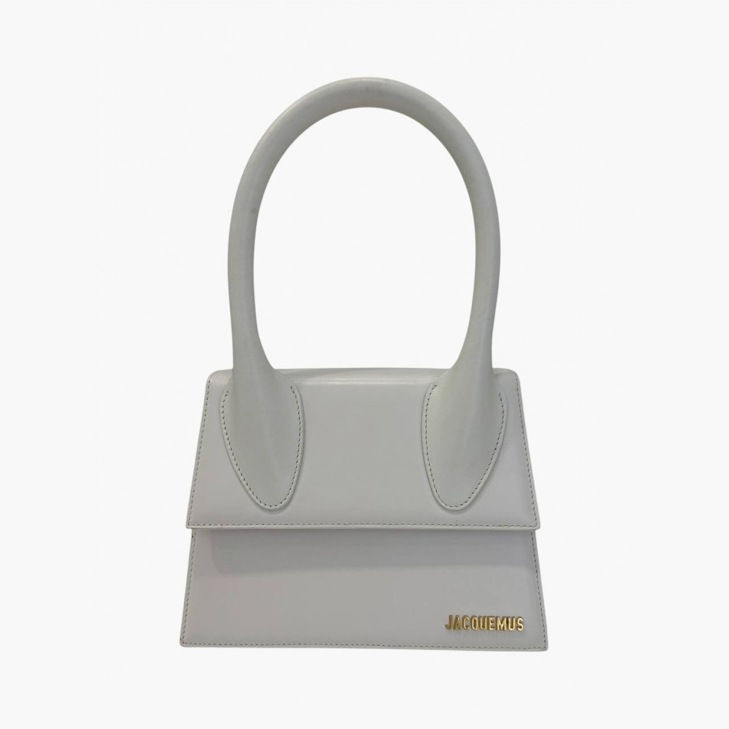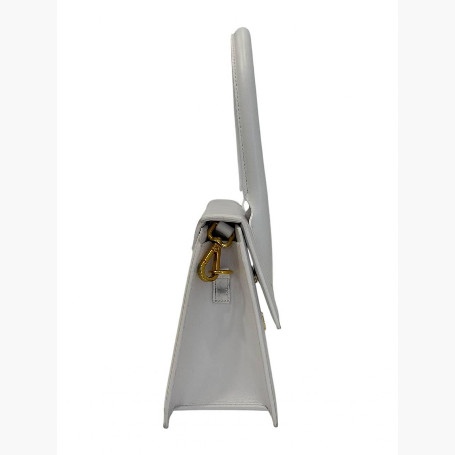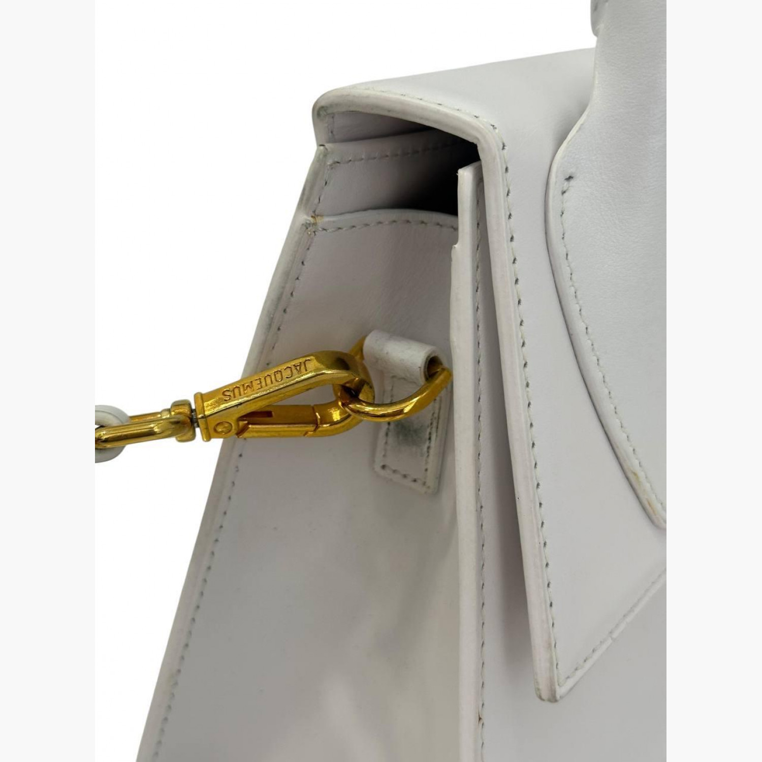 White leather bag. One main compartment and a pocket inside. In good condition with scuffs on the leather and hardware. Comes with a removable, adjustable shoulder strap.