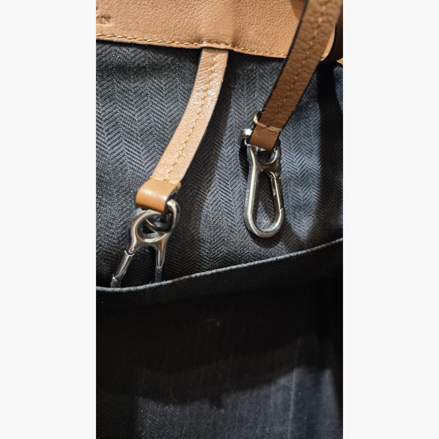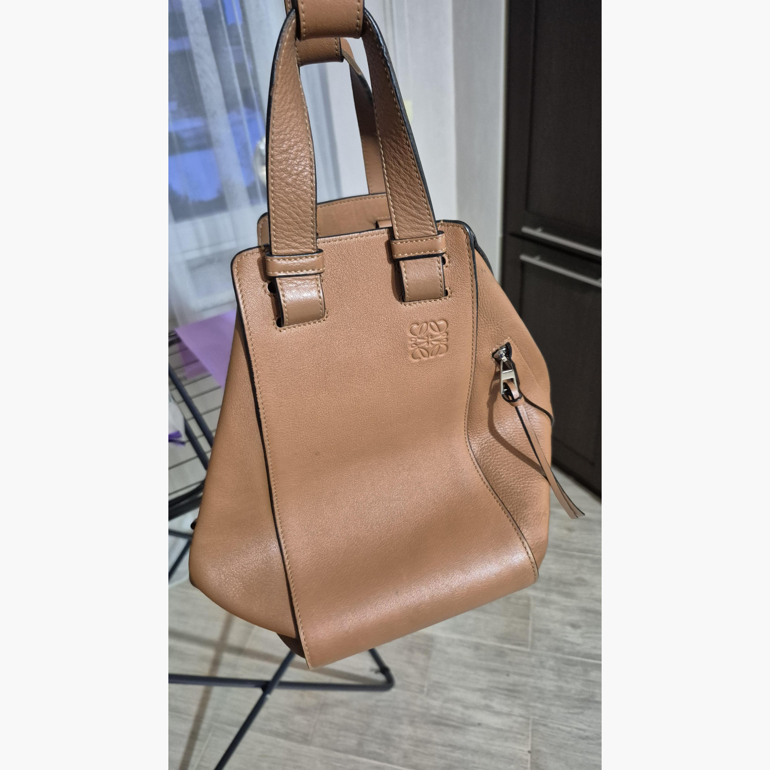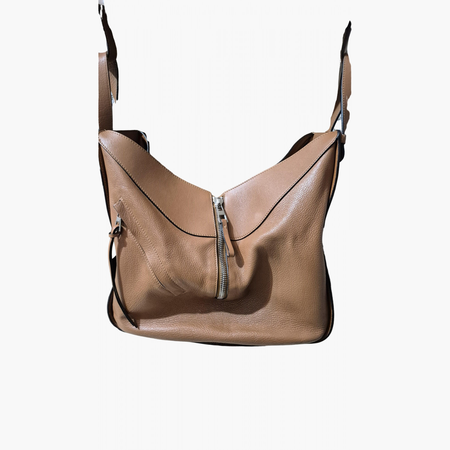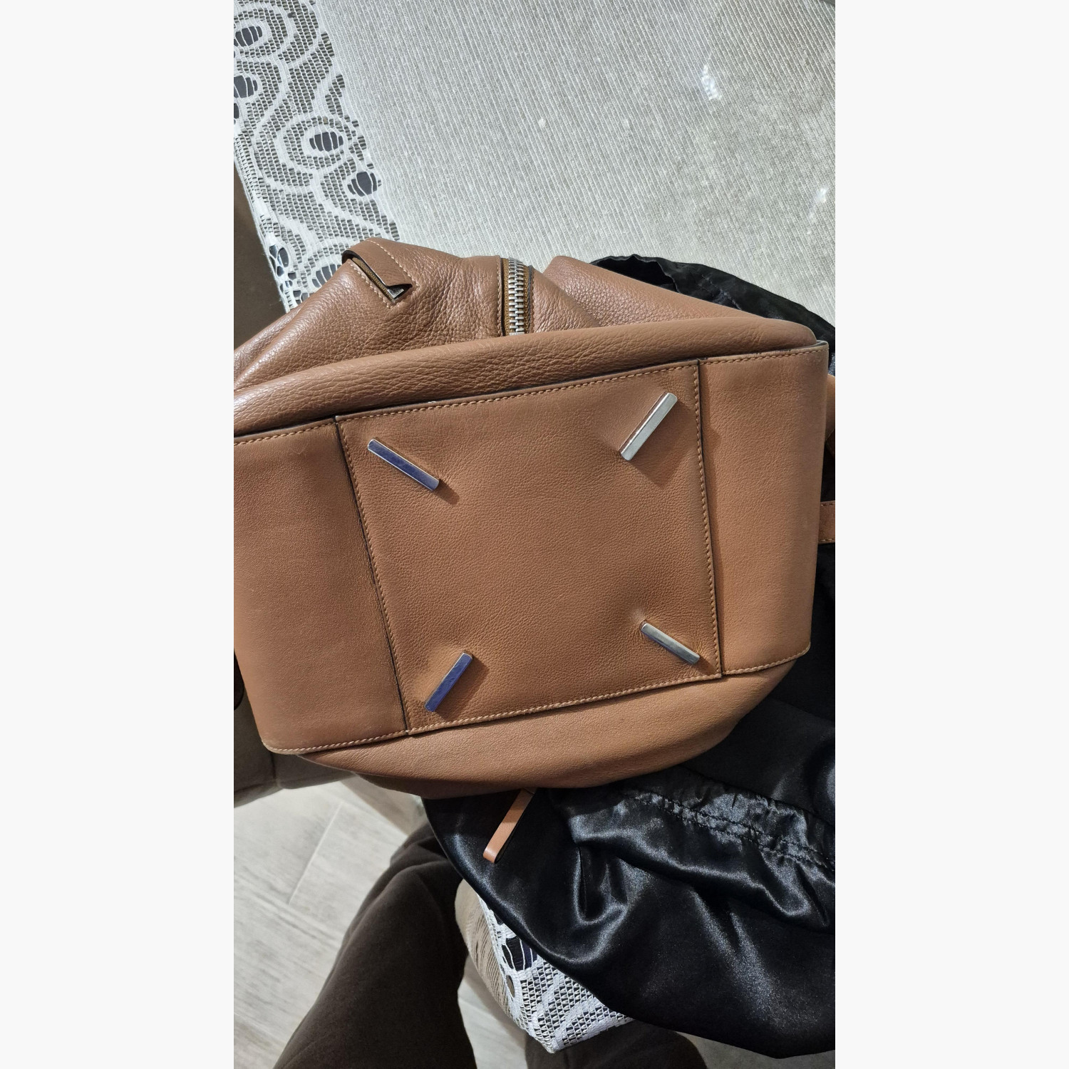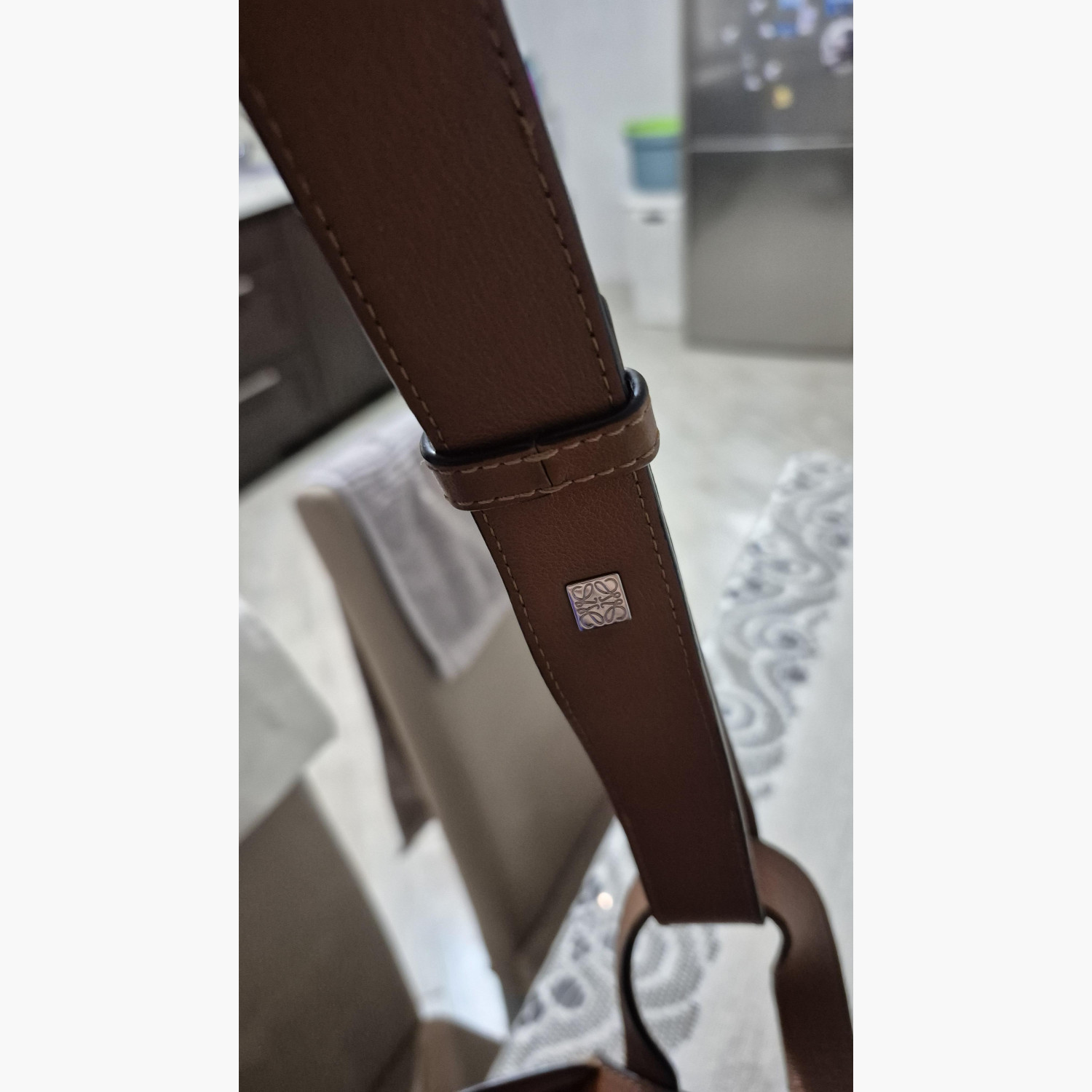 Brown leather bag in excellent condition. Removable and adjustable strap. One exterior zip pocket, two interior pockets. Cotton lining.