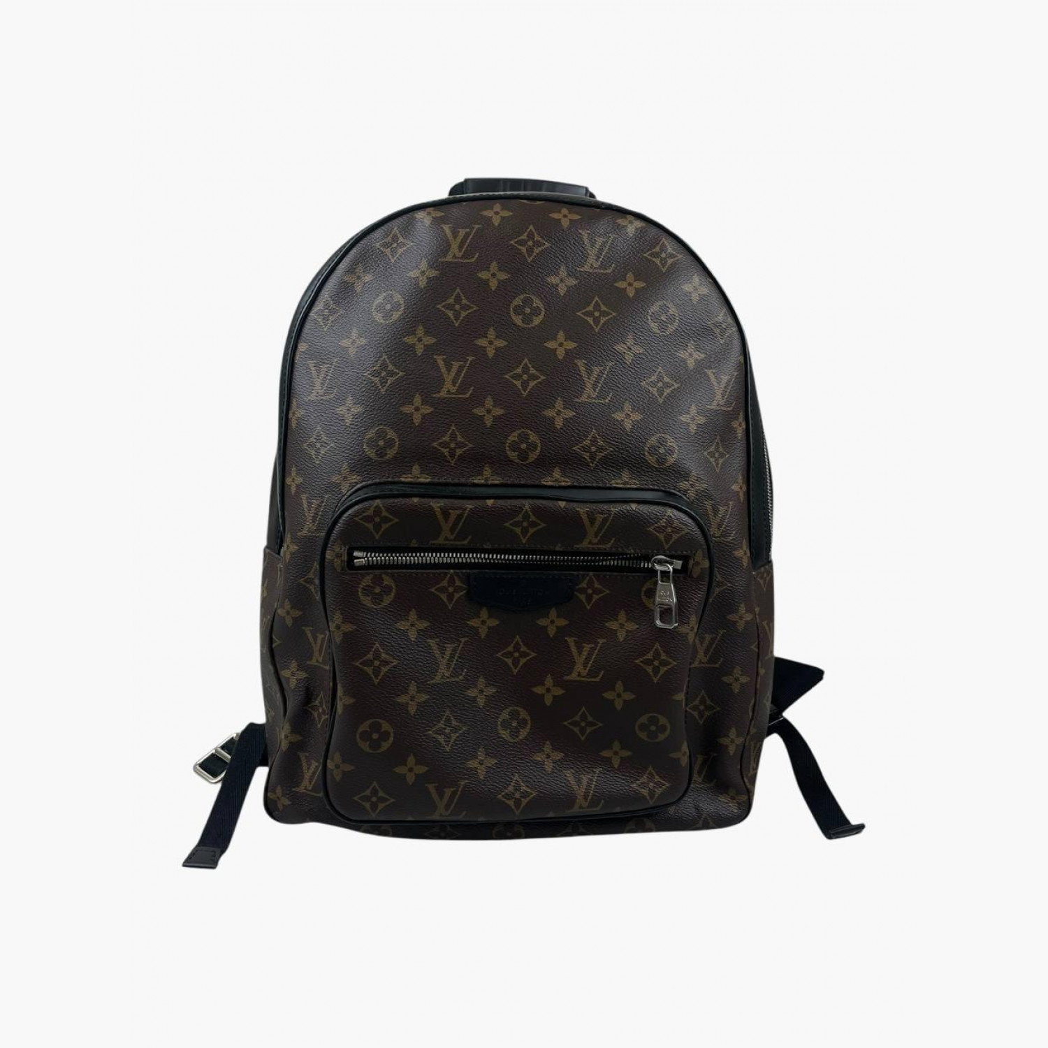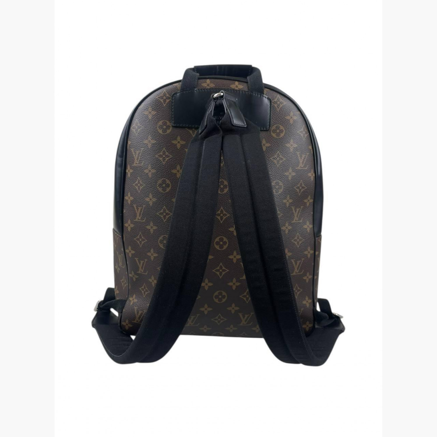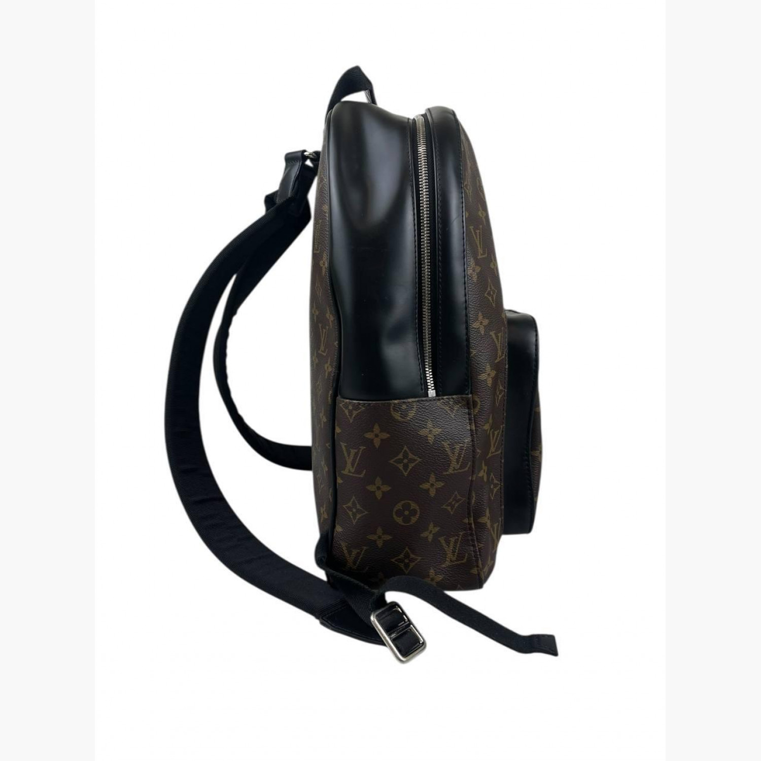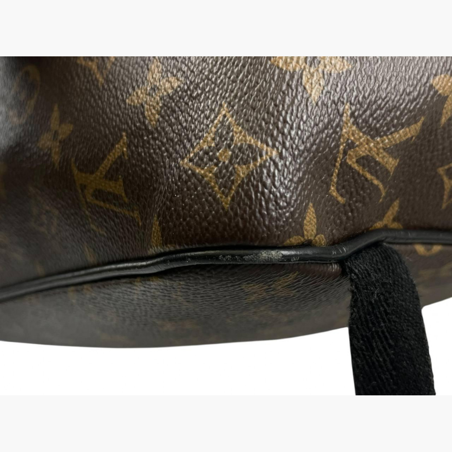 Brown monogram canvas backpack. The interior features one main compartment with a large open pocket topped by a double open pocket. On the front — a zip pocket. In good condition, with wear marks.
