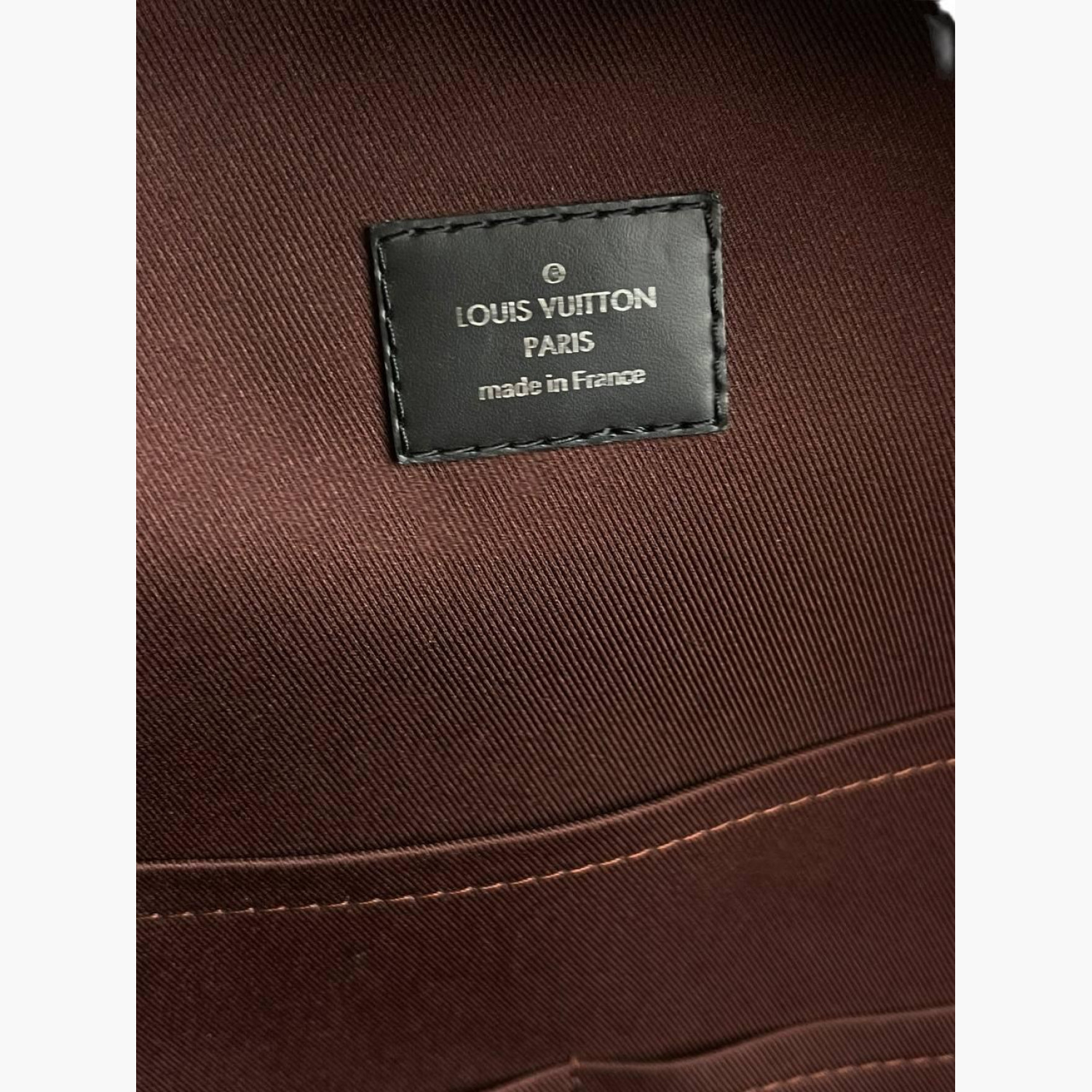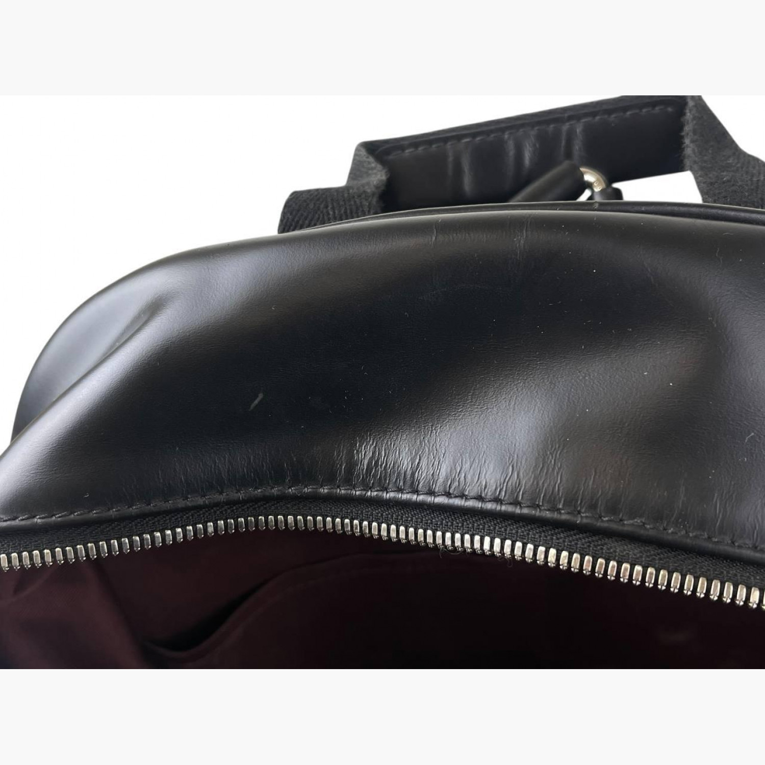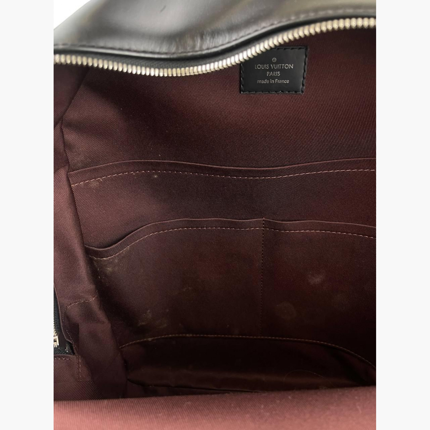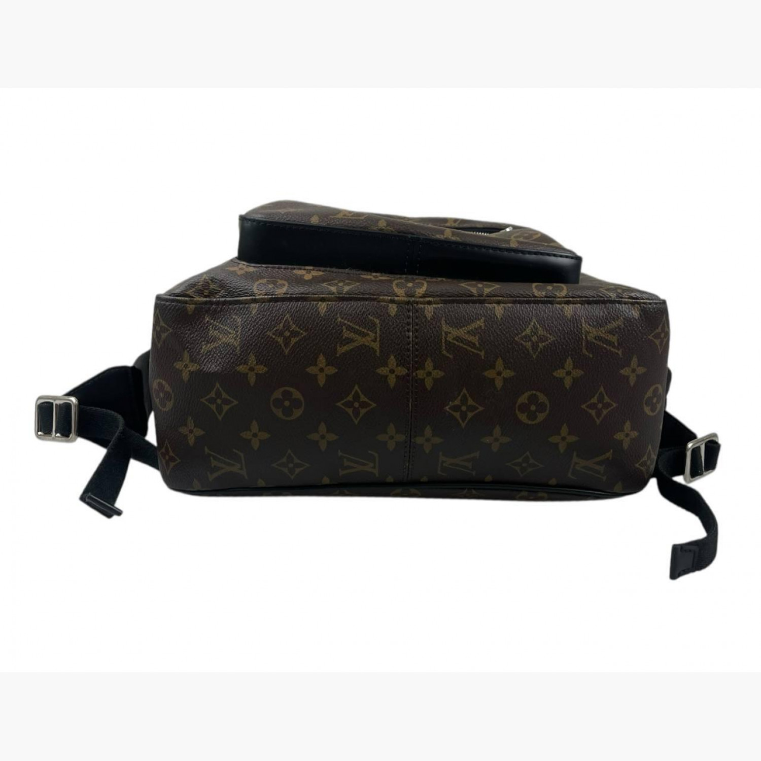 Brown monogram canvas backpack. The interior features one main compartment with a large open pocket topped by a double open pocket. On the front — a zip pocket. In good condition, with wear marks.