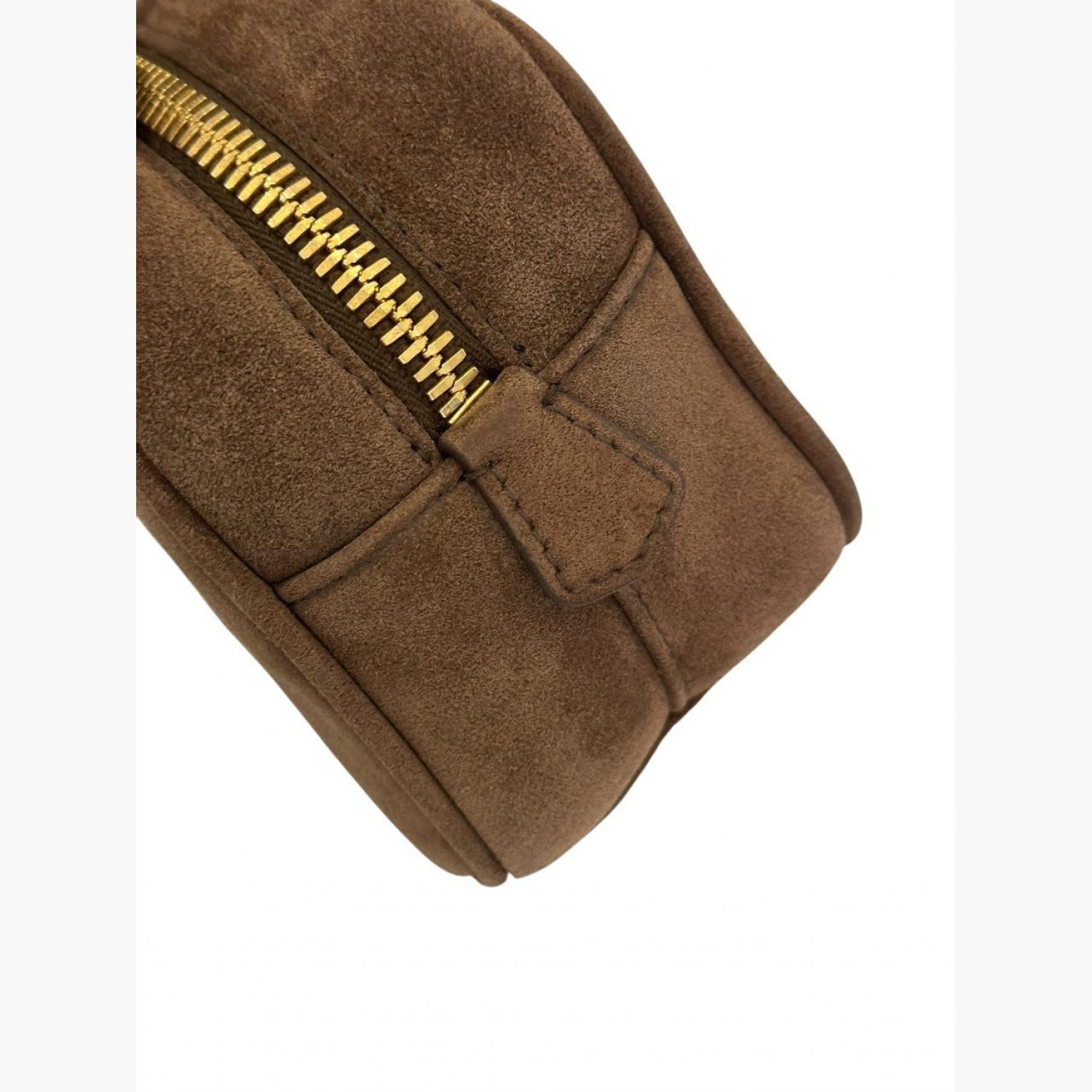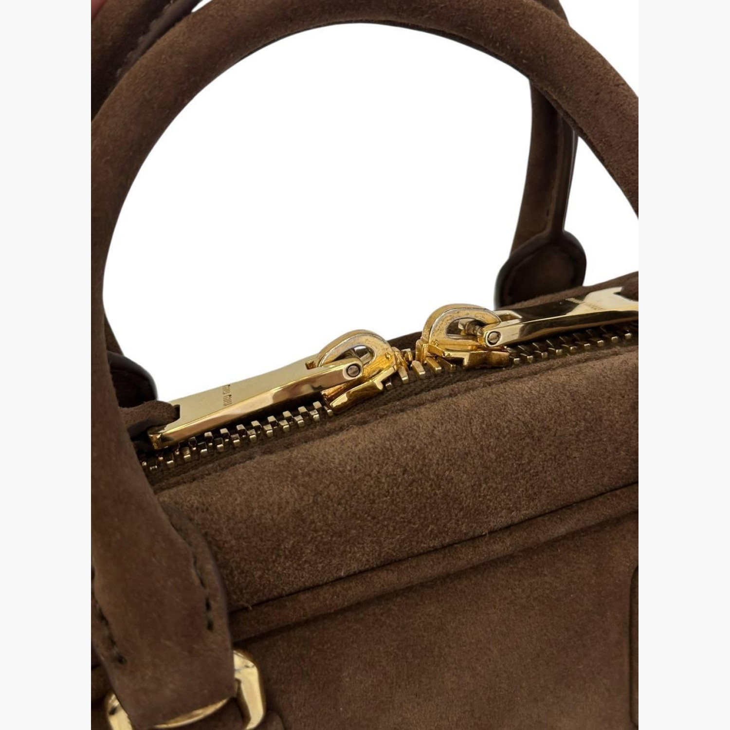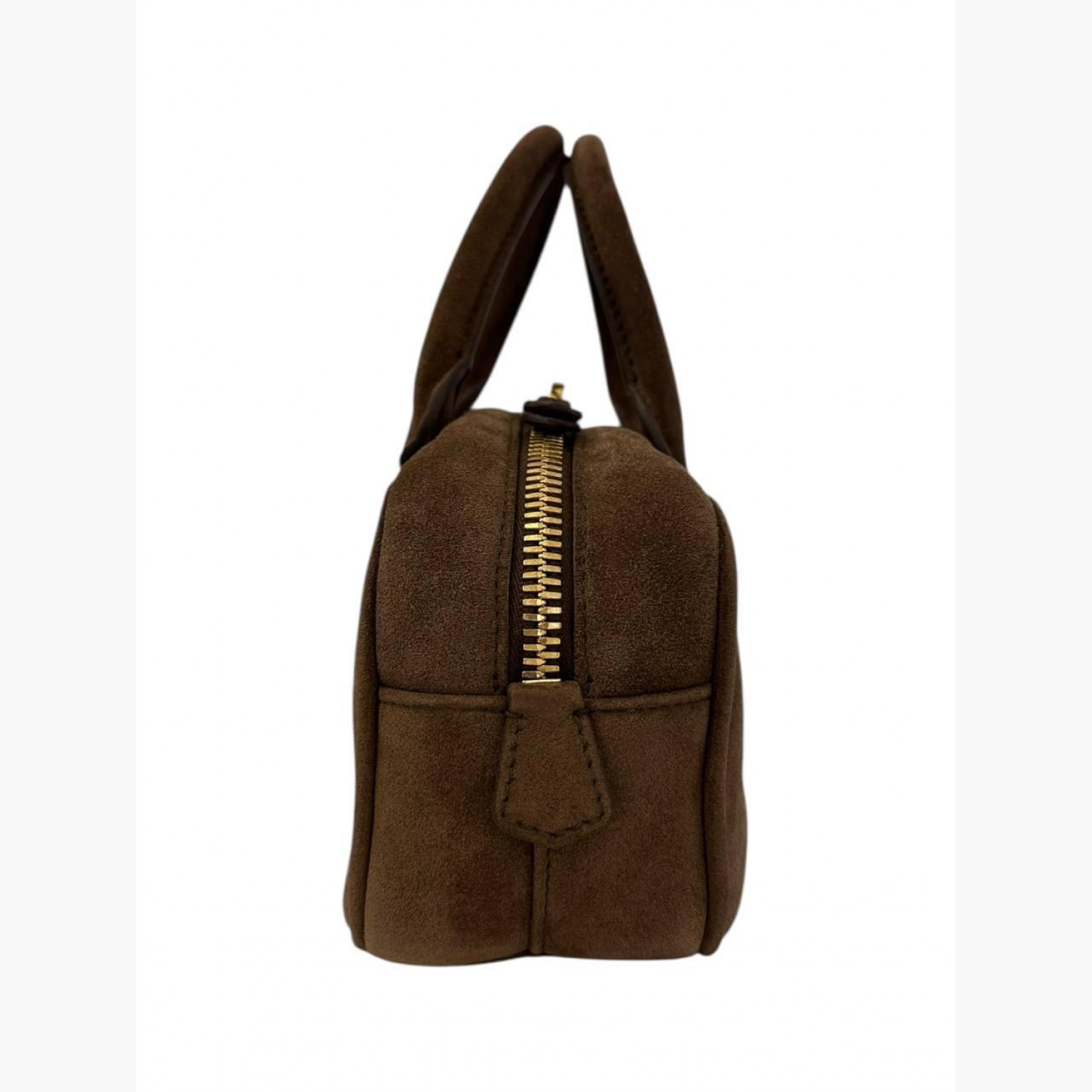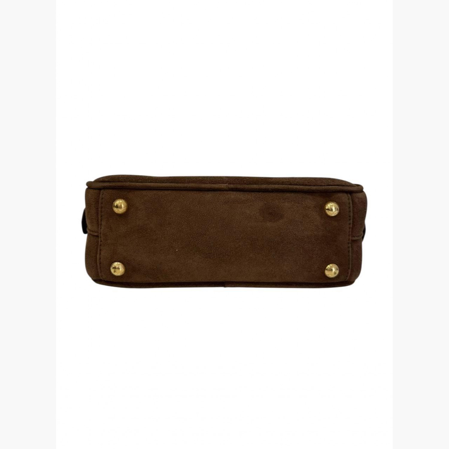 Brown suede bag. One main compartment and a zip pocket inside. In perfect condition, minor scuffs on the suede and hardware.