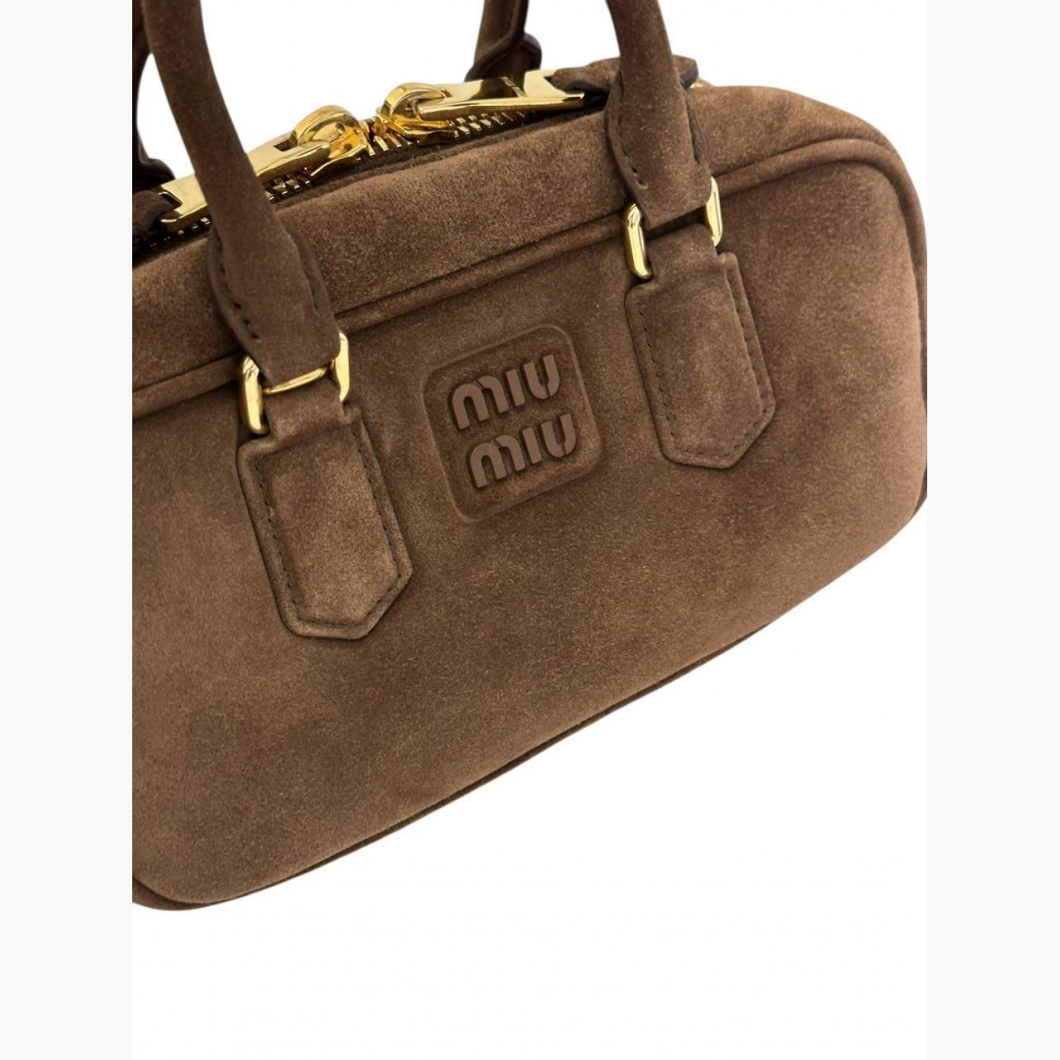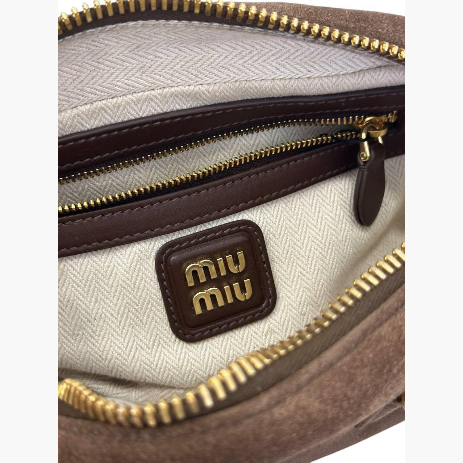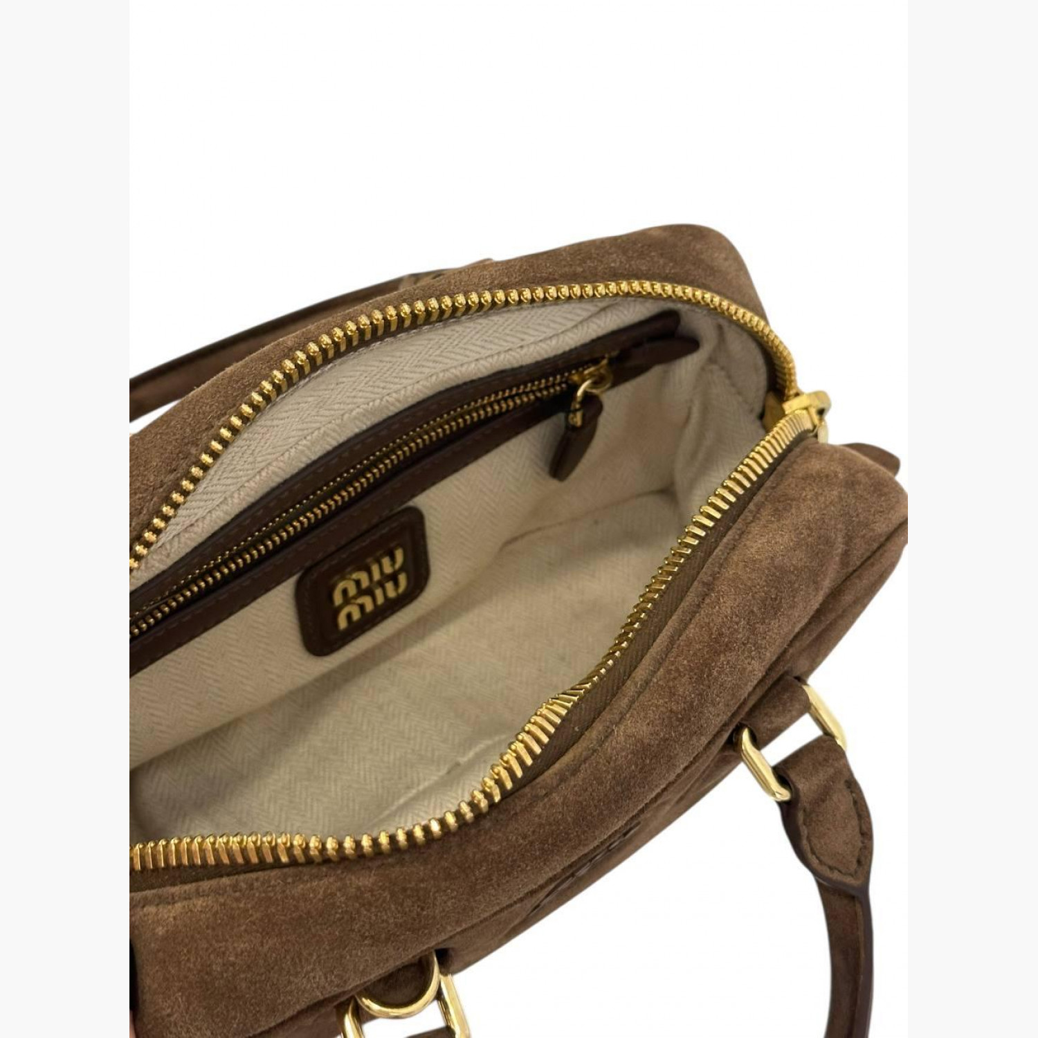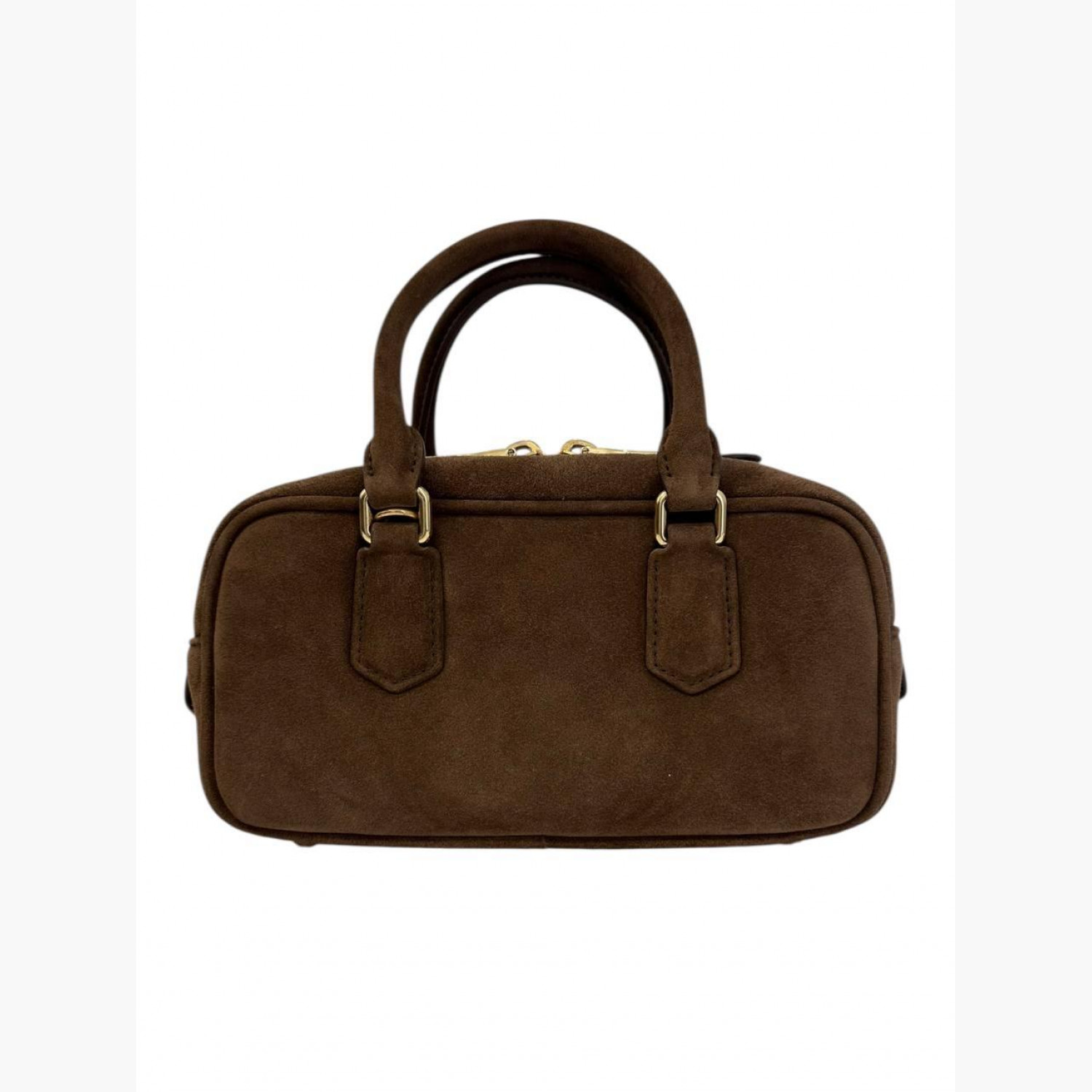 Brown suede bag. One main compartment and a zip pocket inside. In perfect condition, minor scuffs on the suede and hardware.