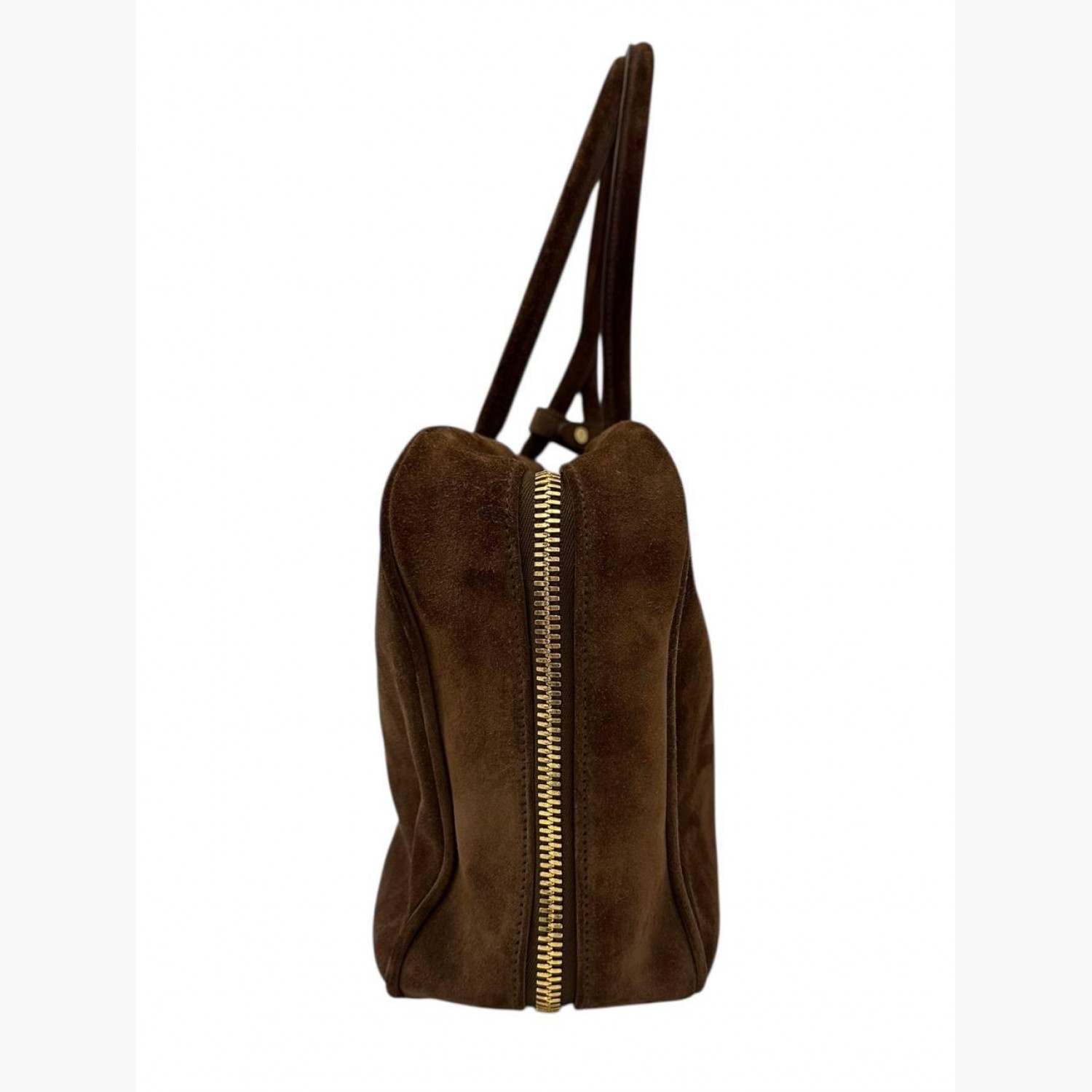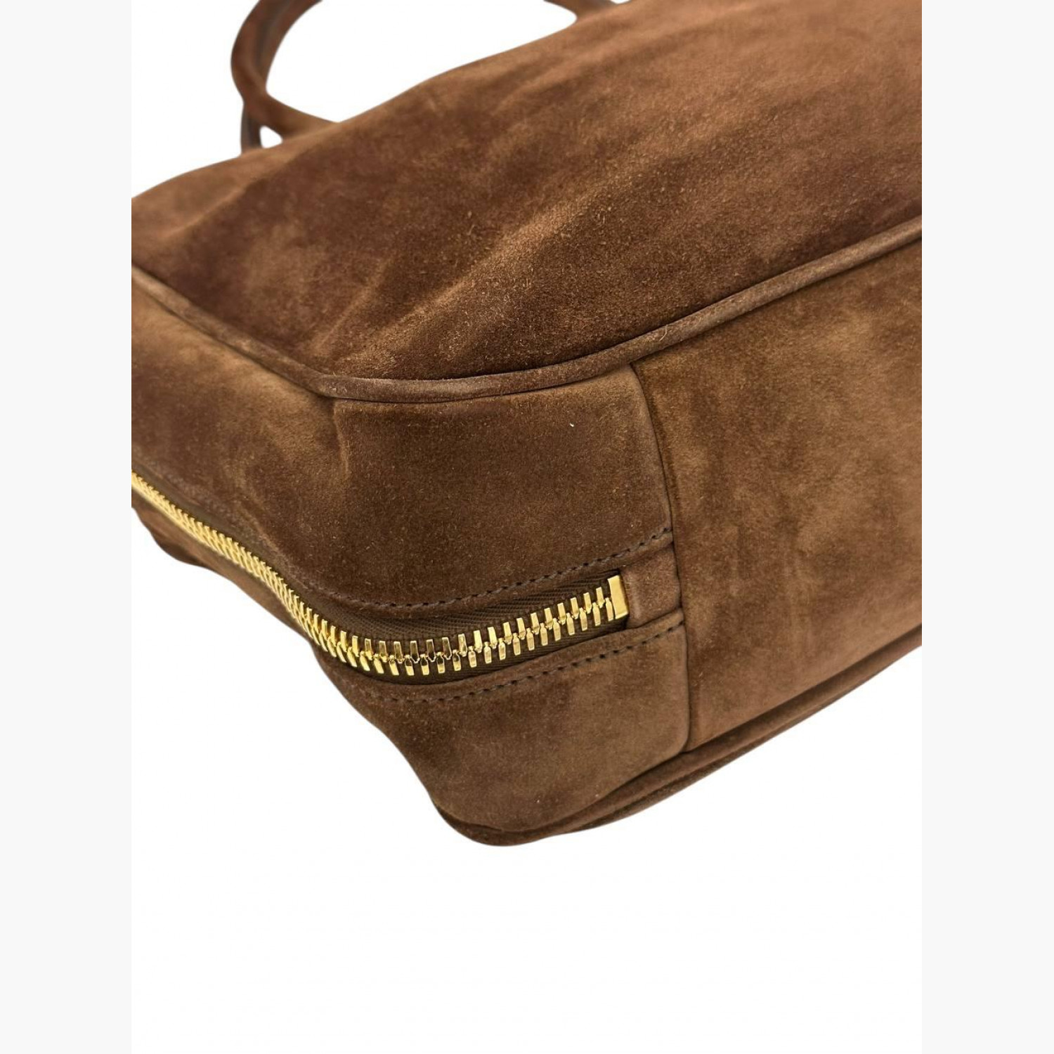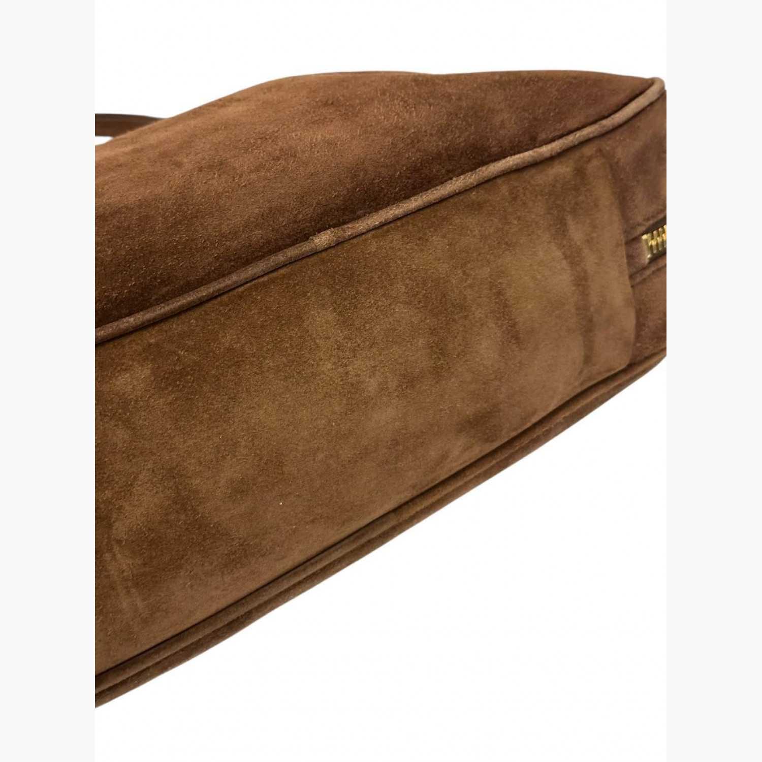 Brown suede bag. One main compartment and two zip pockets inside. In good condition, with minor scuffs.