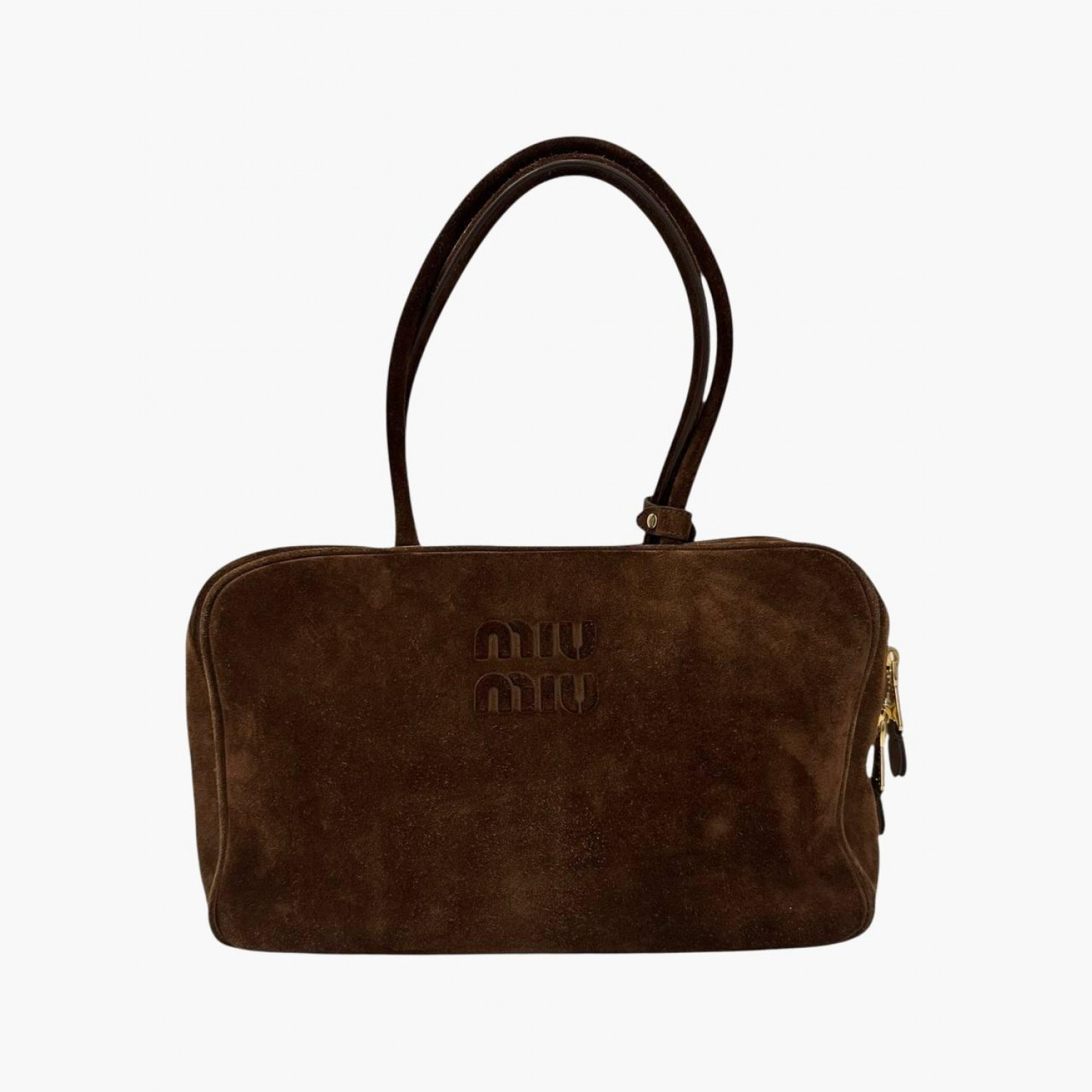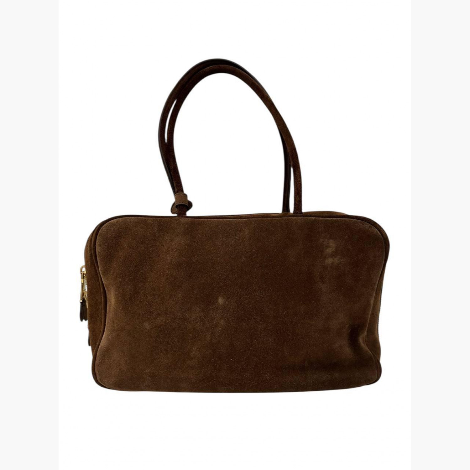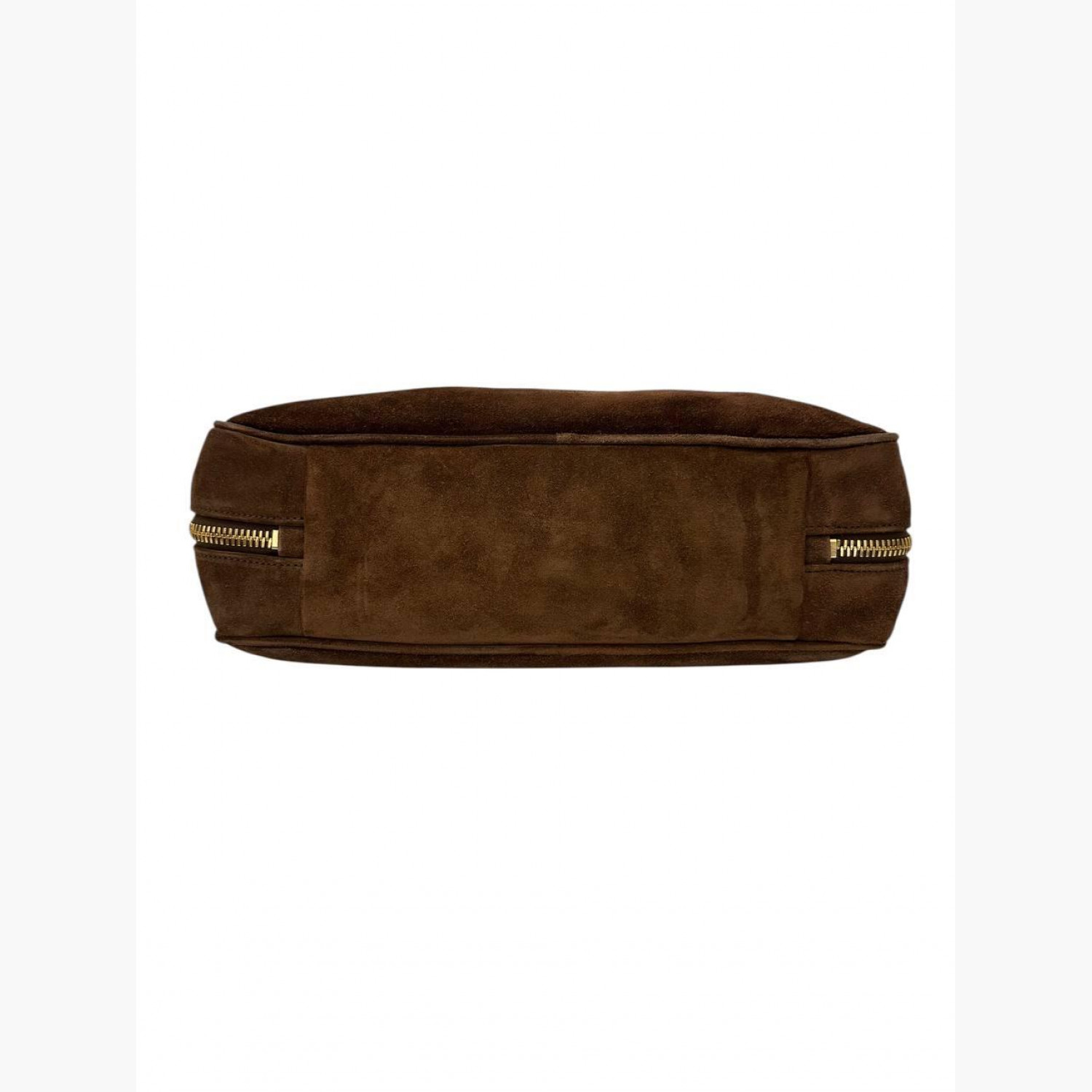 Brown suede bag. One main compartment and two zip pockets inside. In good condition, with minor scuffs.