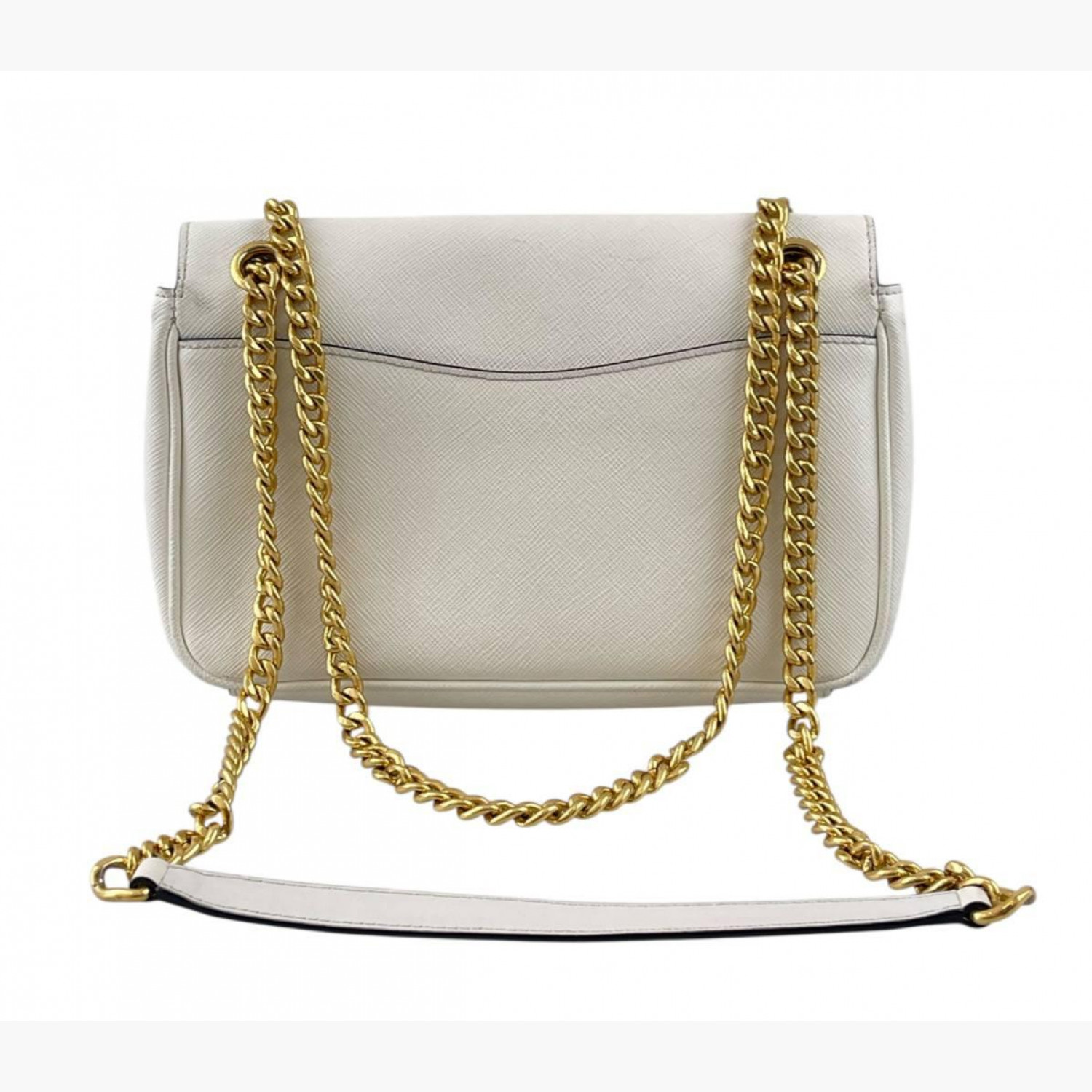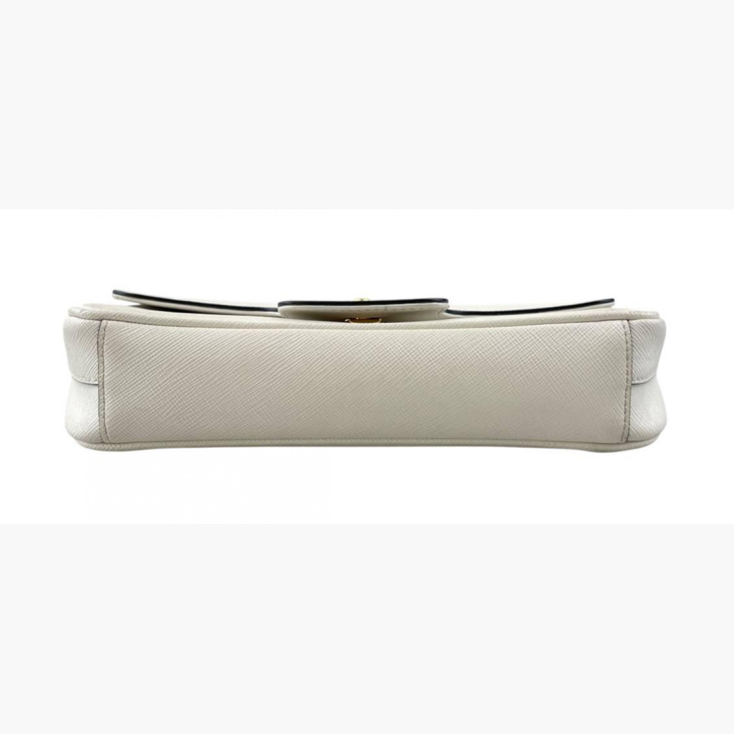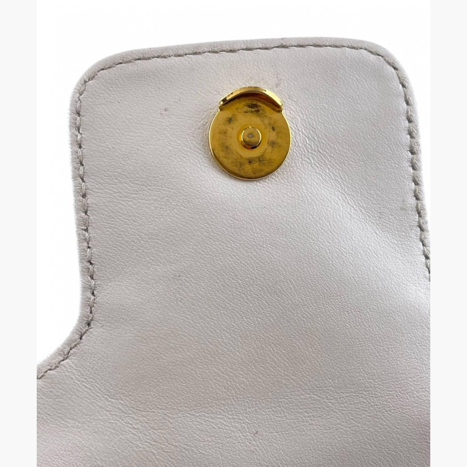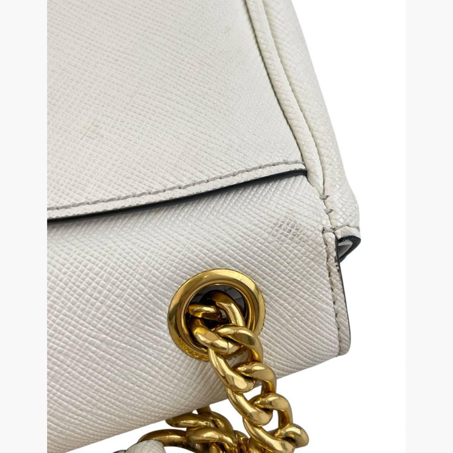 Cream leather bag. One main compartment with a zip pocket and an open pocket inside, an open pocket on the back side of the bag. In good condition, with wear marks.