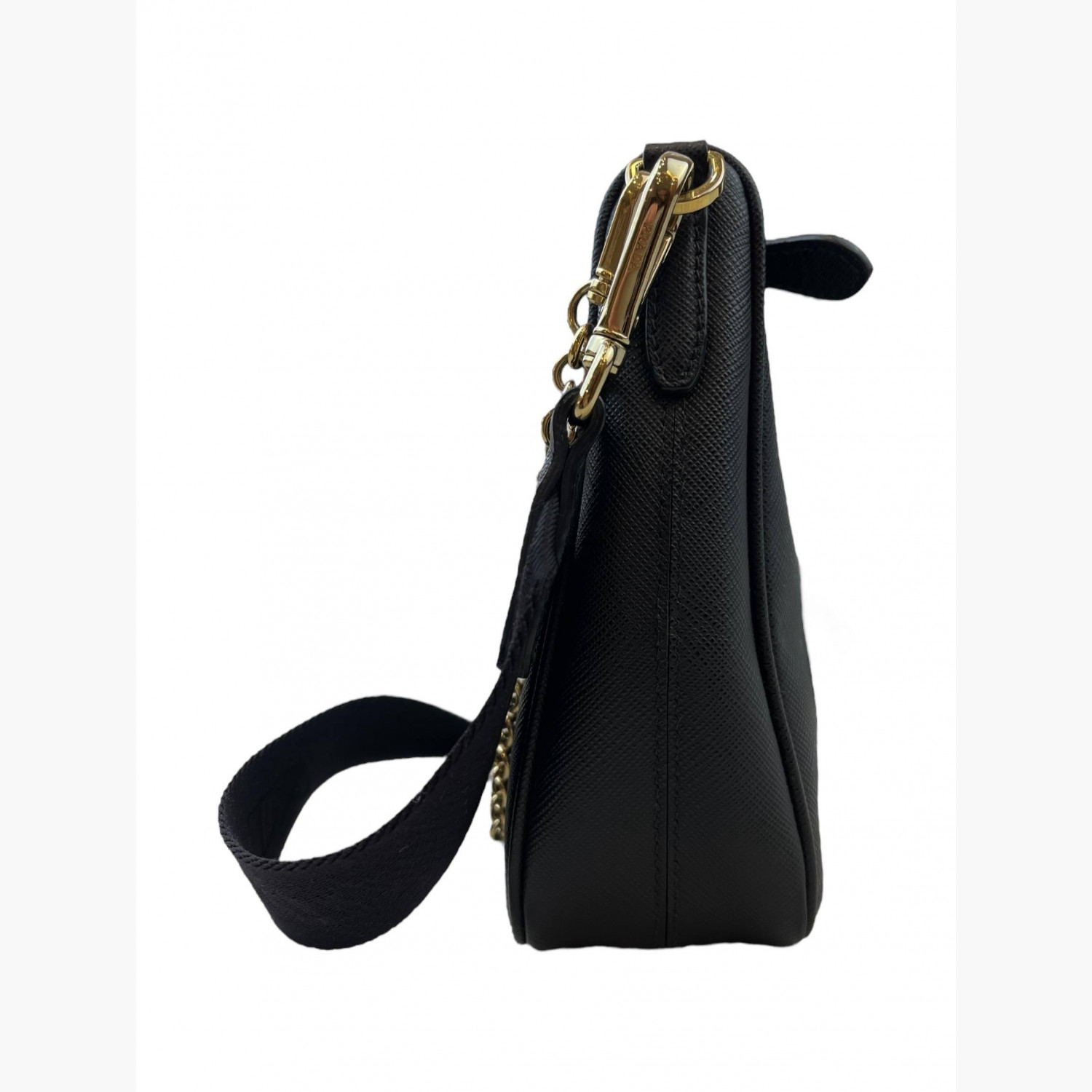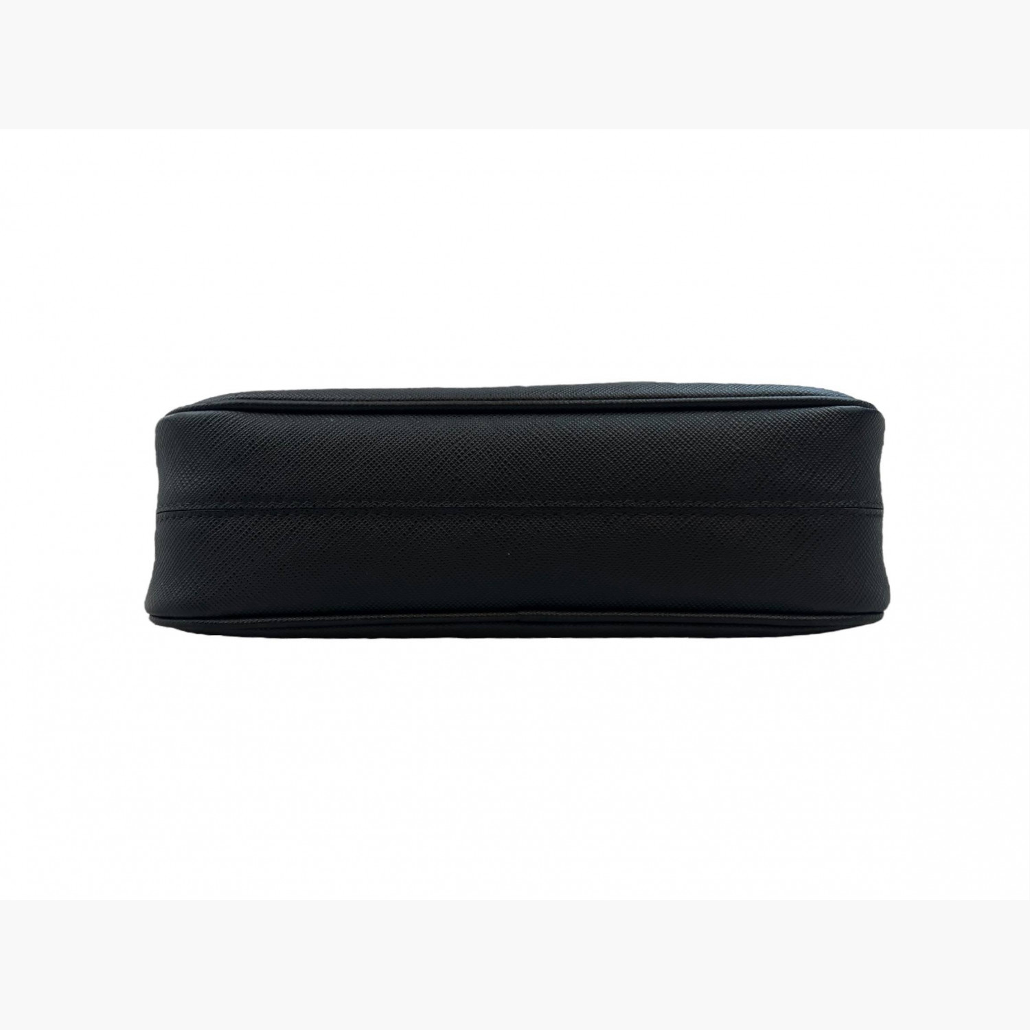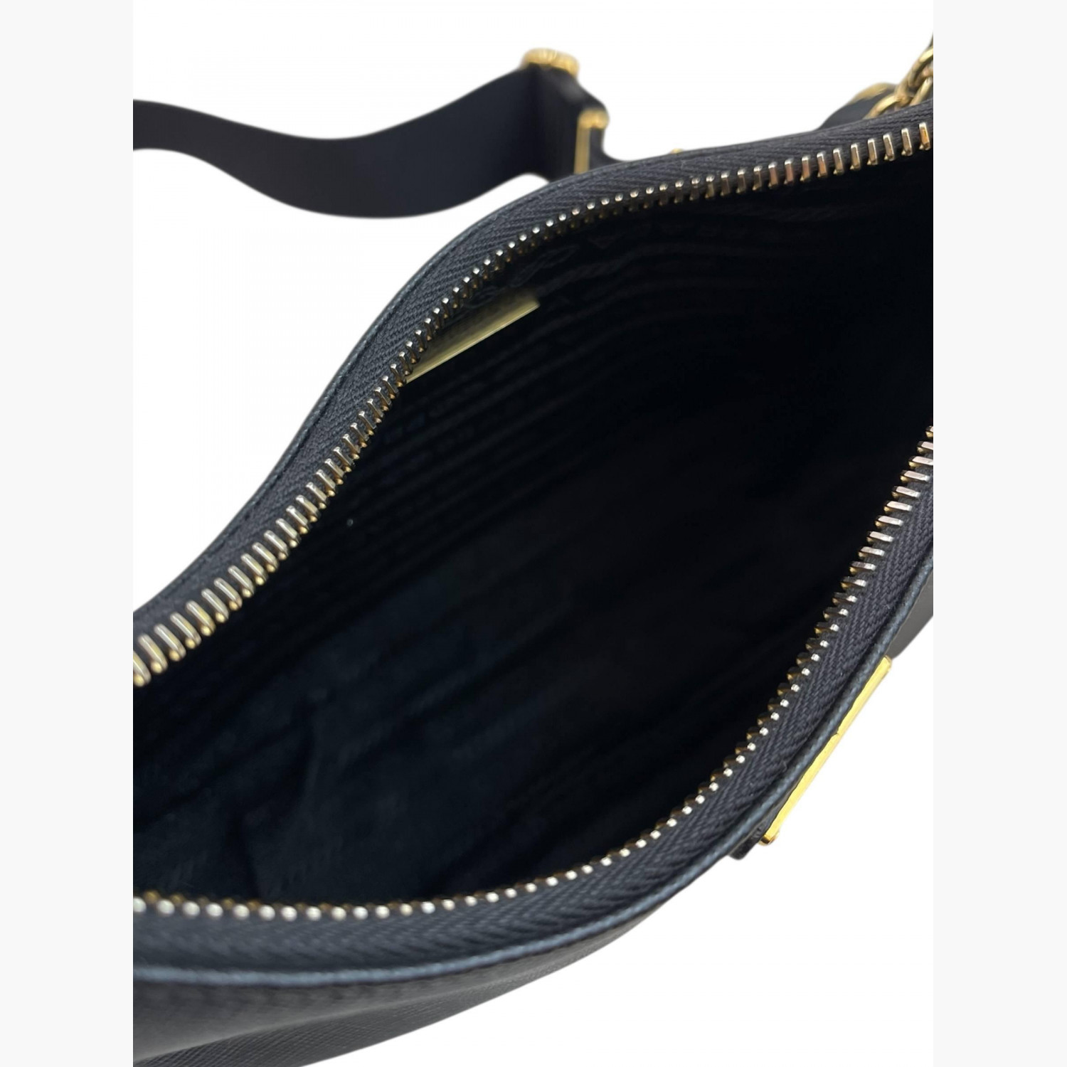 Black leather bag with a thin chain strap and a wide removable textile strap with a zip pocket on it. Inside, there is one main compartment without pockets.In excellent condition, with minor signs of wear.