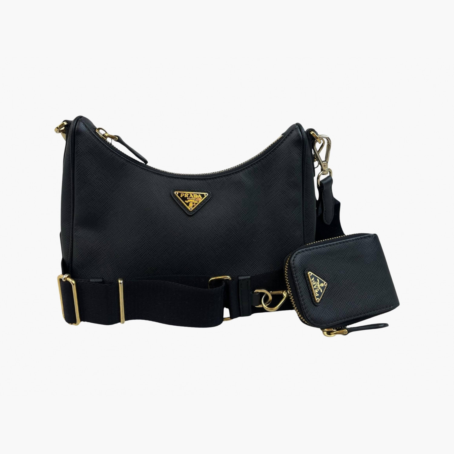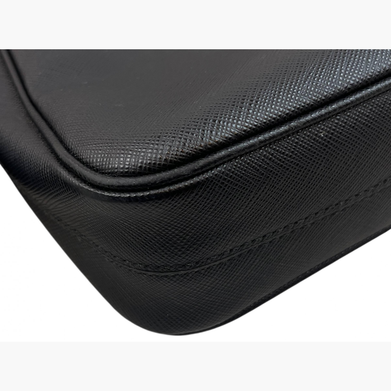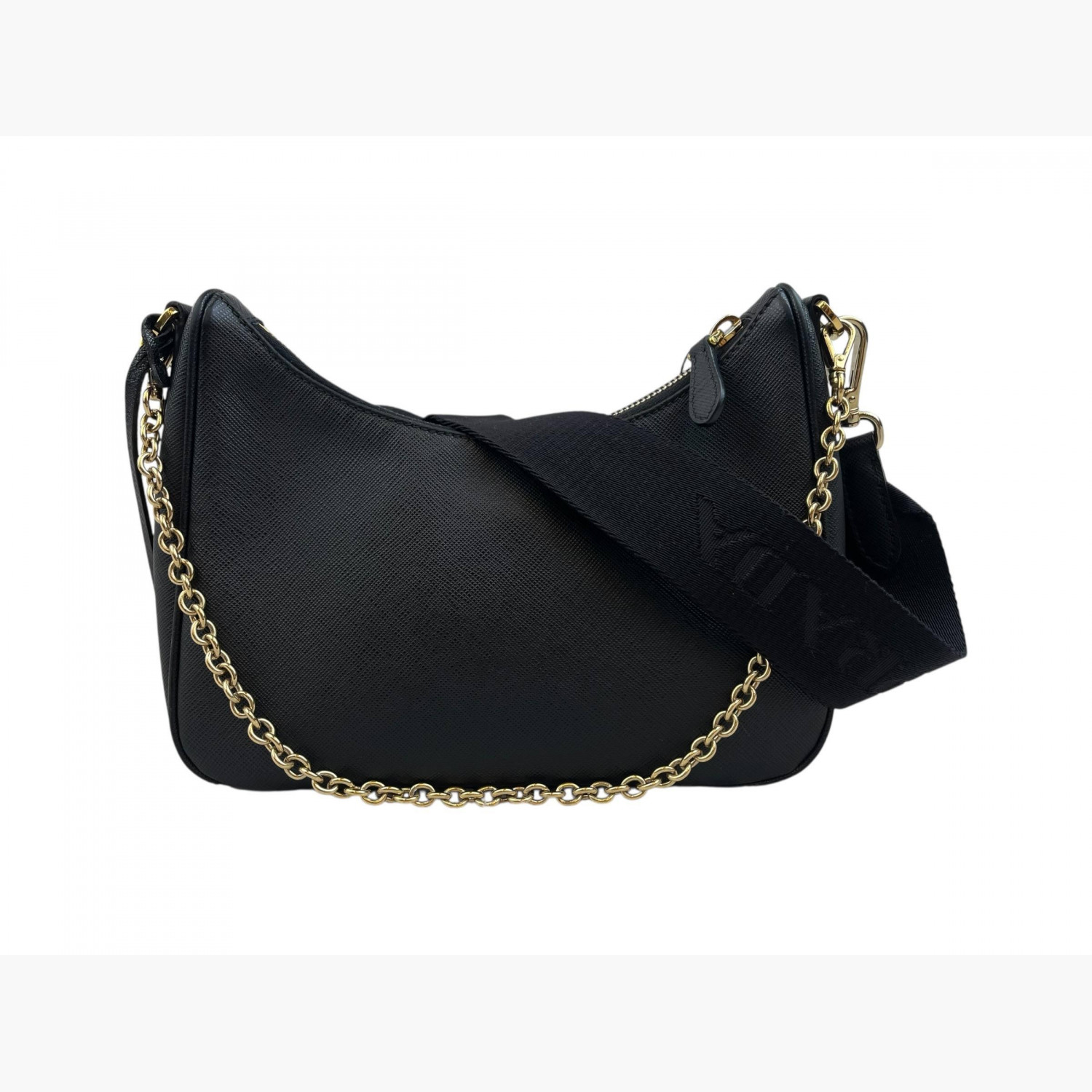 Black leather bag with a thin chain strap and a wide removable textile strap with a zip pocket on it. Inside, there is one main compartment without pockets.In excellent condition, with minor signs of wear.