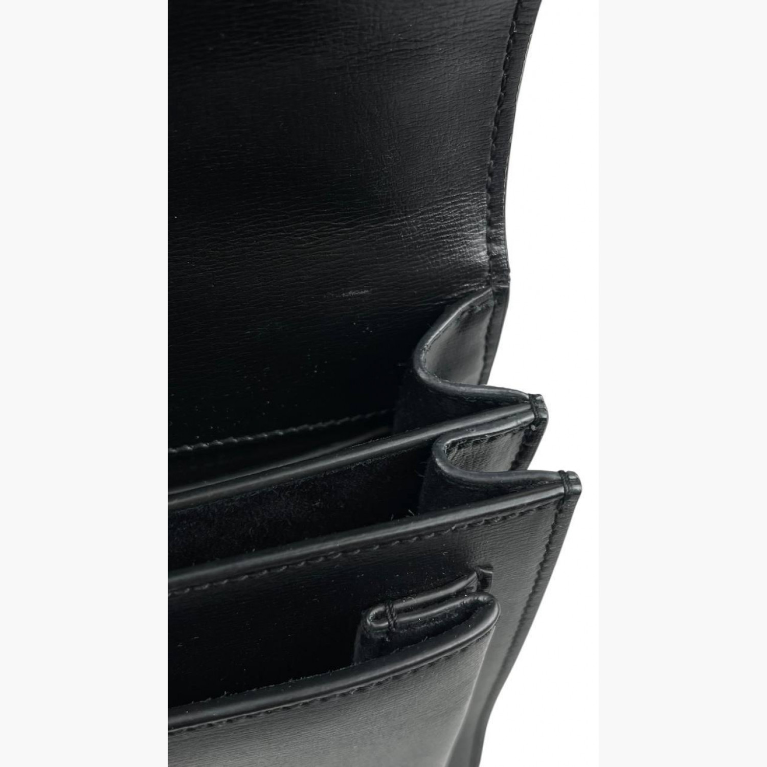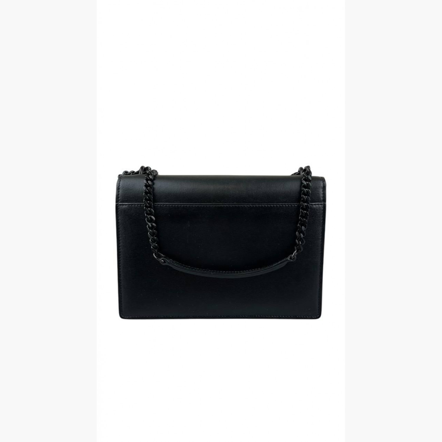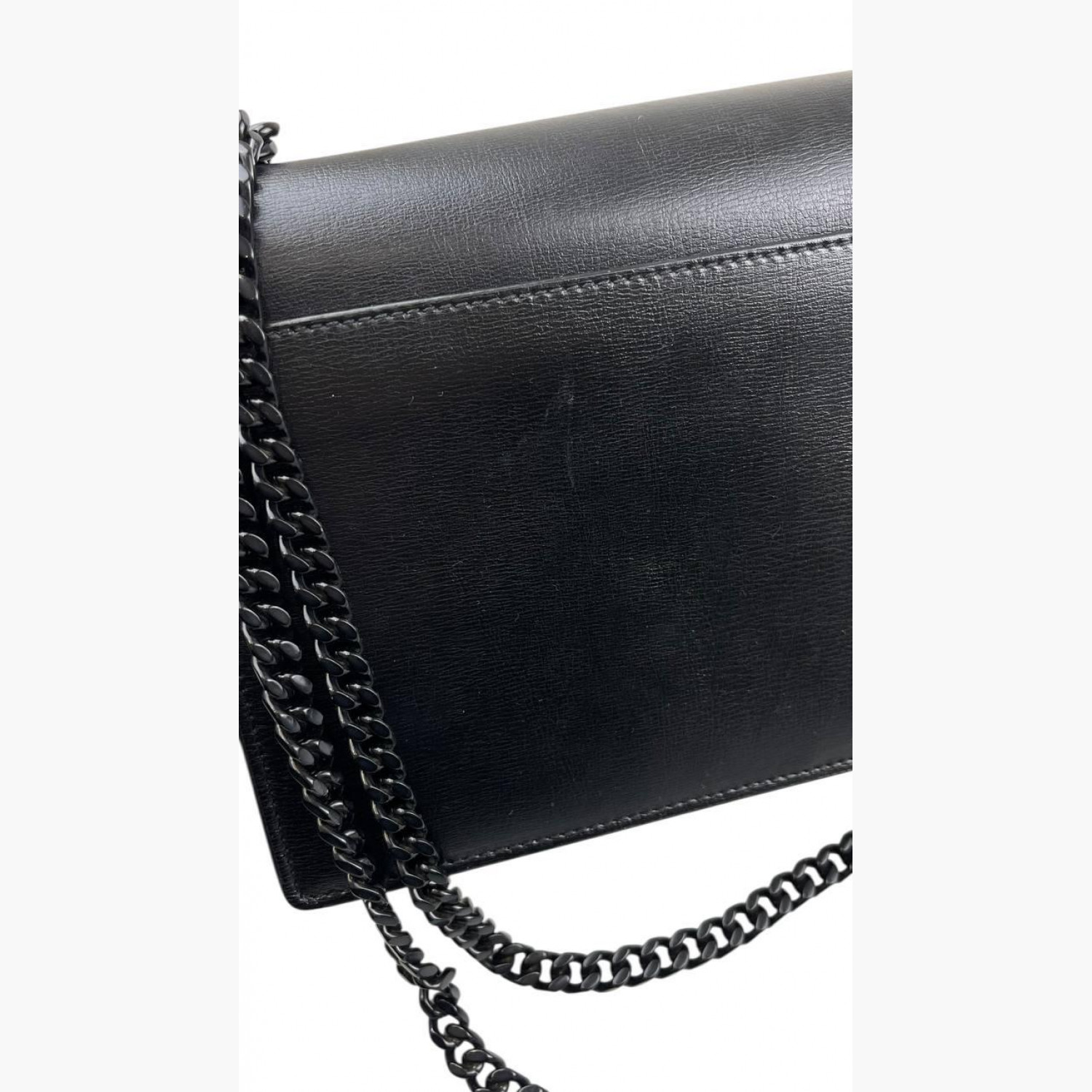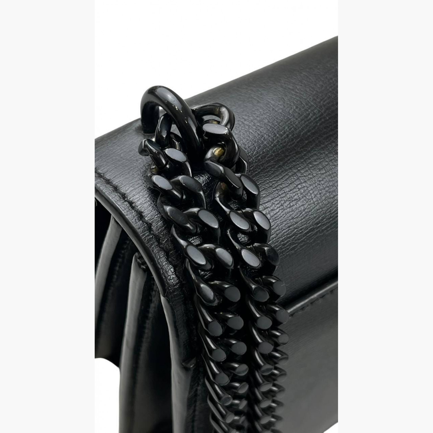 Black leather bag with an adjustable chain strap. Two main compartments inside: one with an open pocket, the other without pockets. Open pockets are also placed on the front and back sides. In good condition, with wear marks.