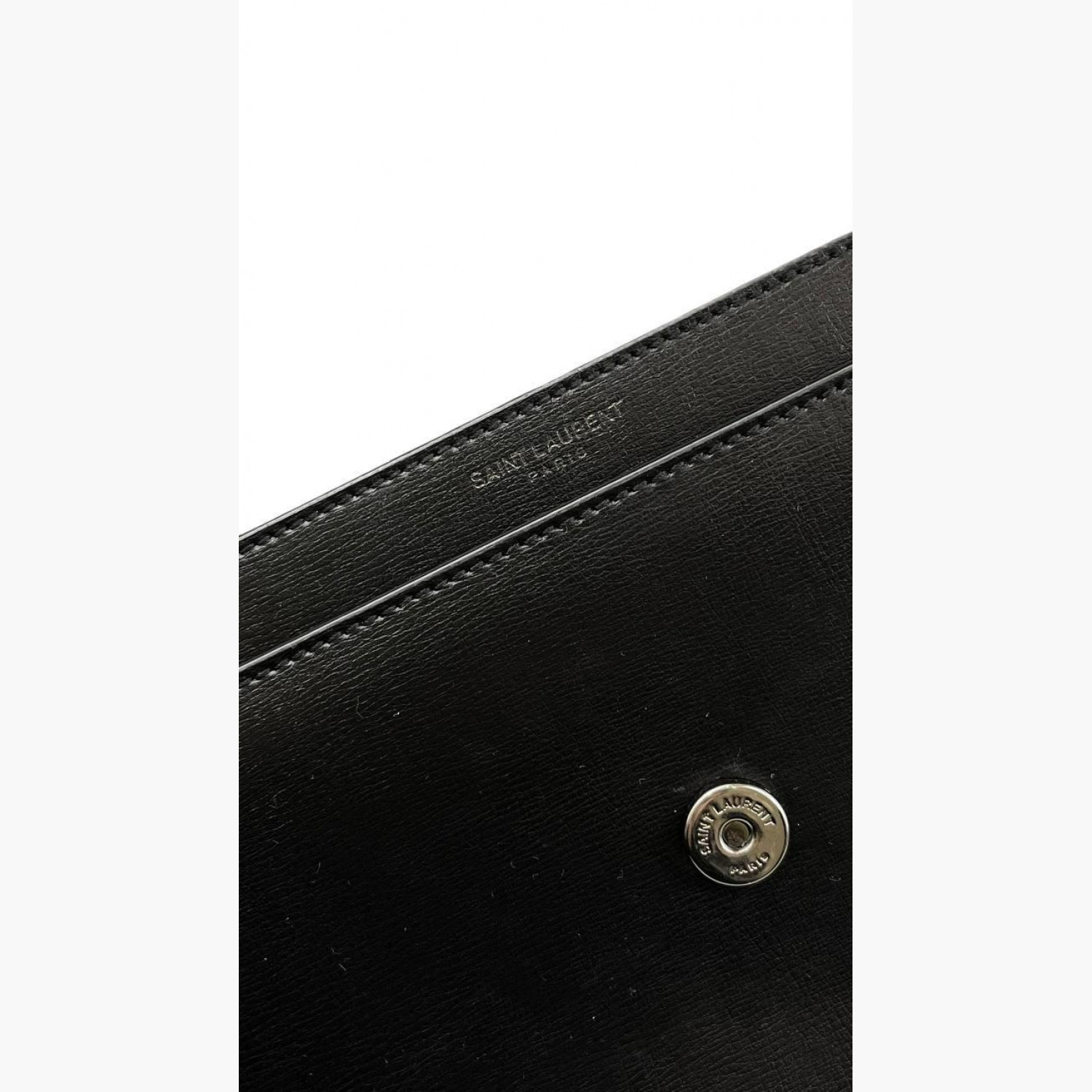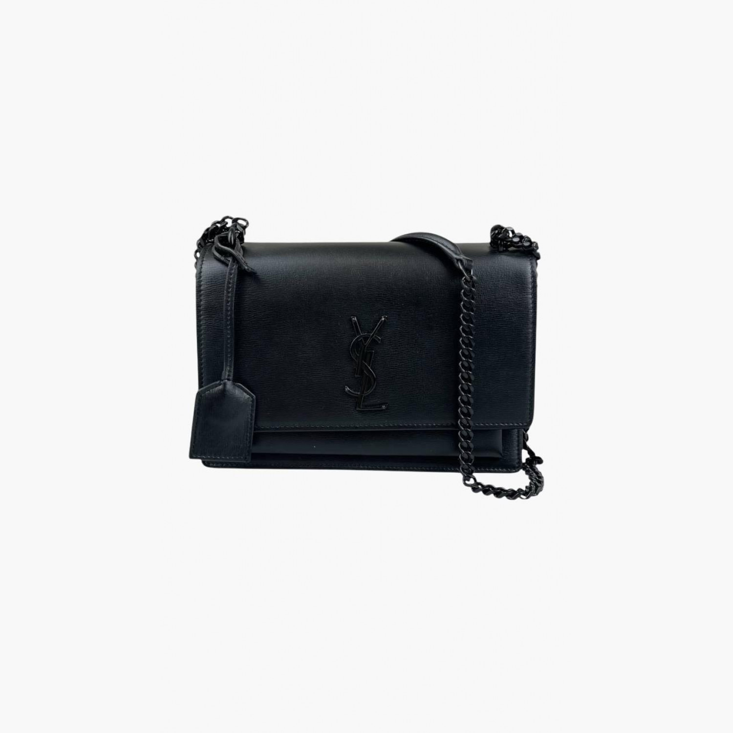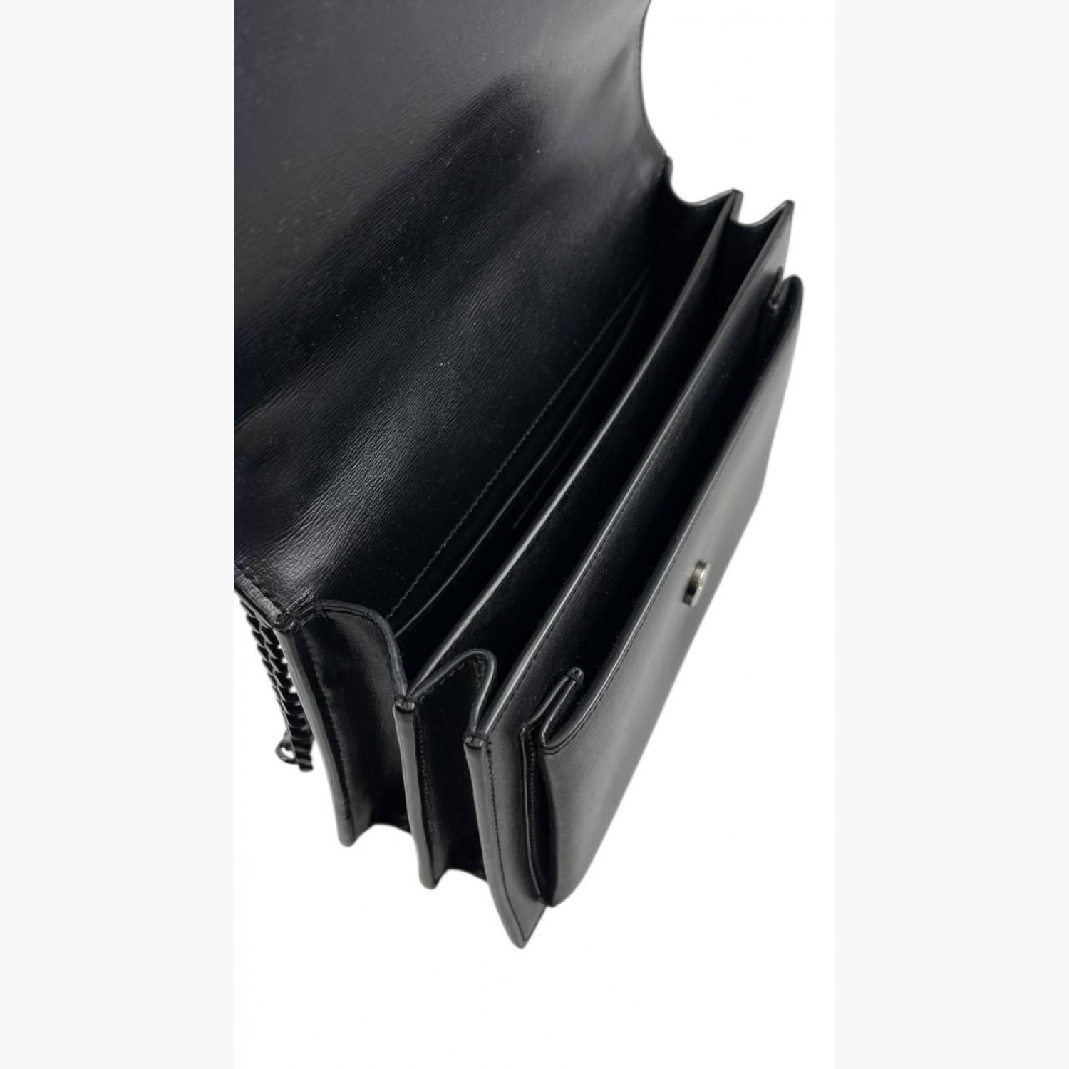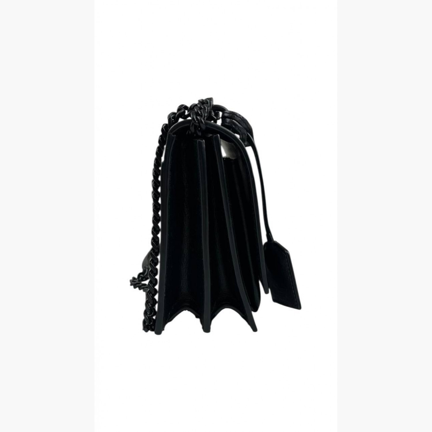 Black leather bag with an adjustable chain strap. Two main compartments inside: one with an open pocket, the other without pockets. Open pockets are also placed on the front and back sides. In good condition, with wear marks.