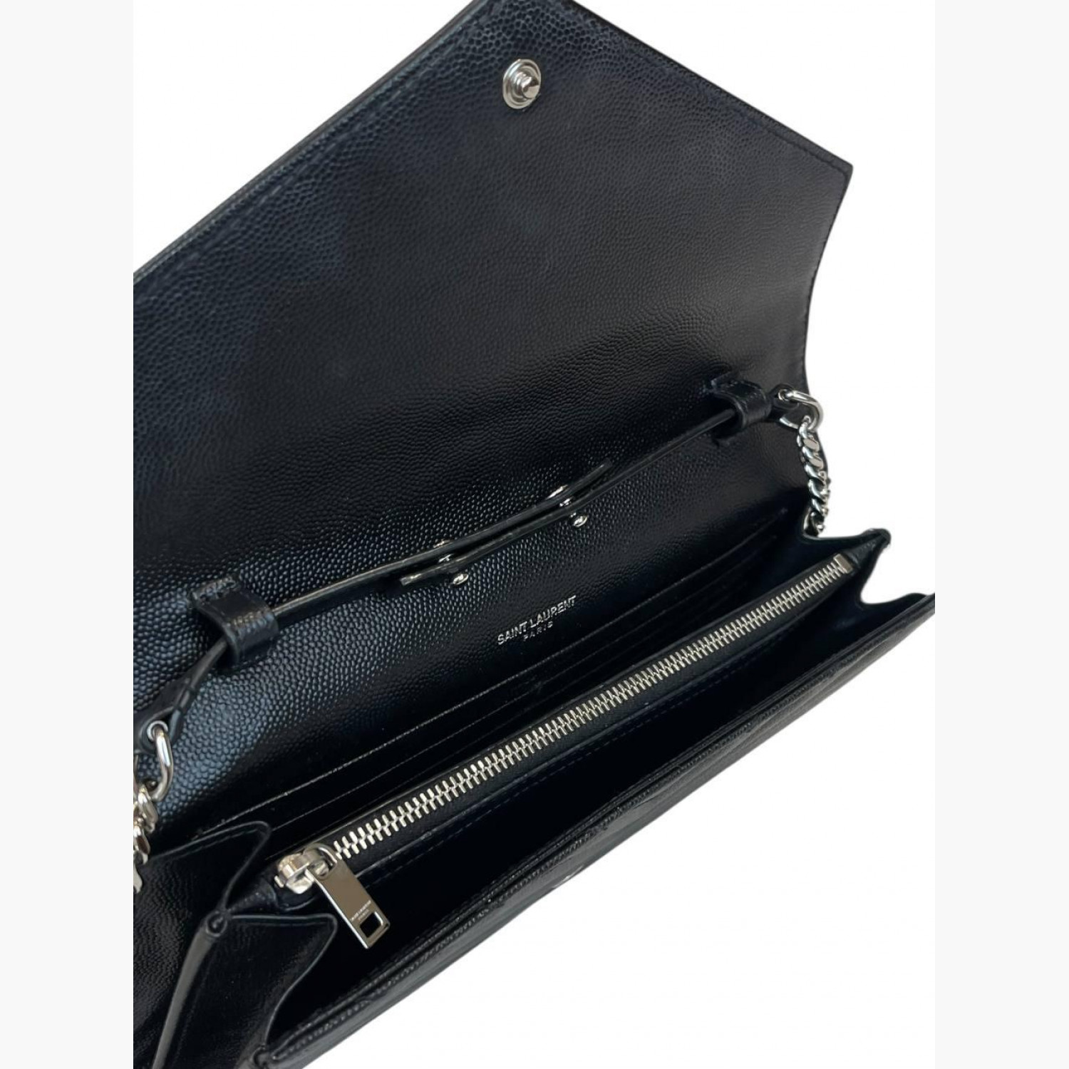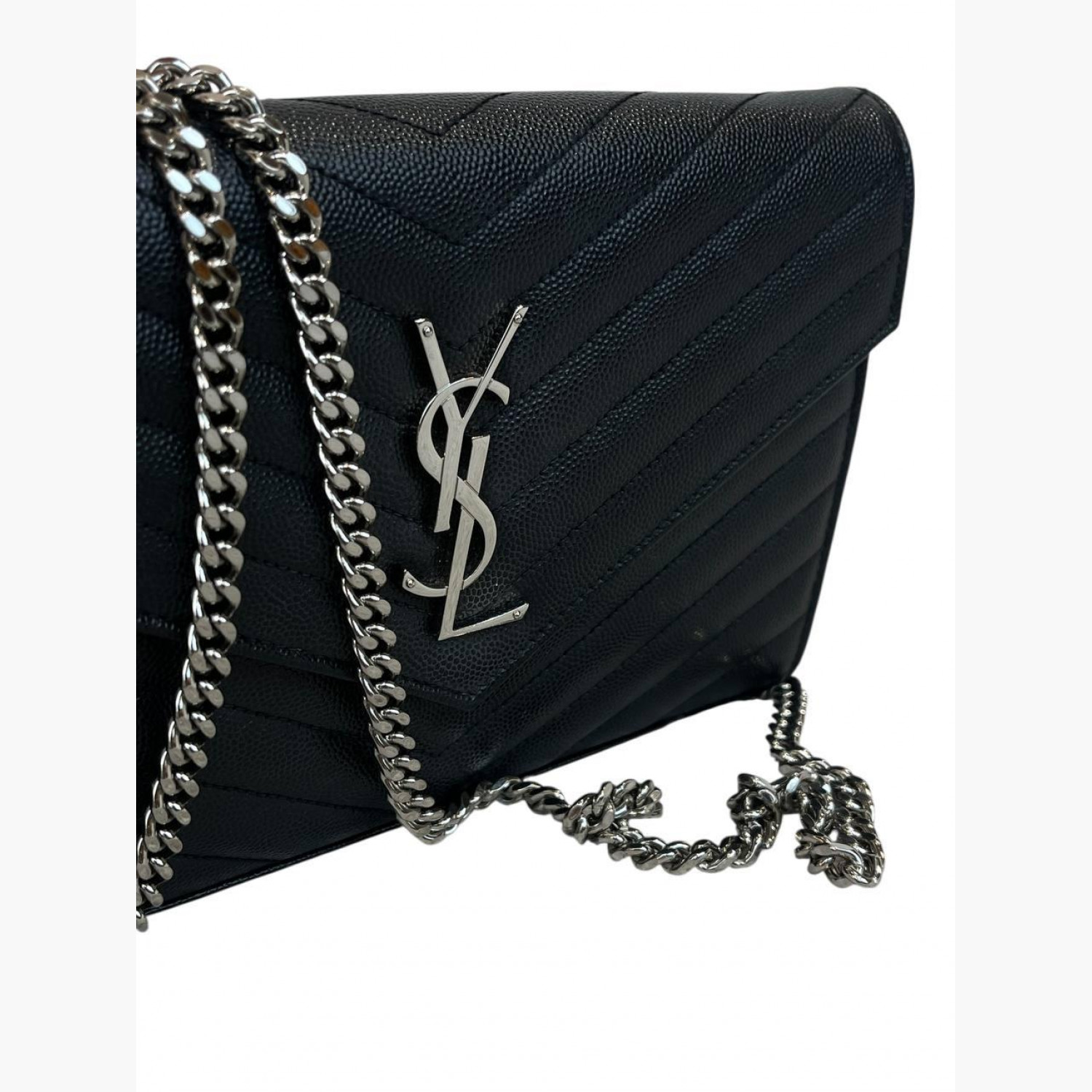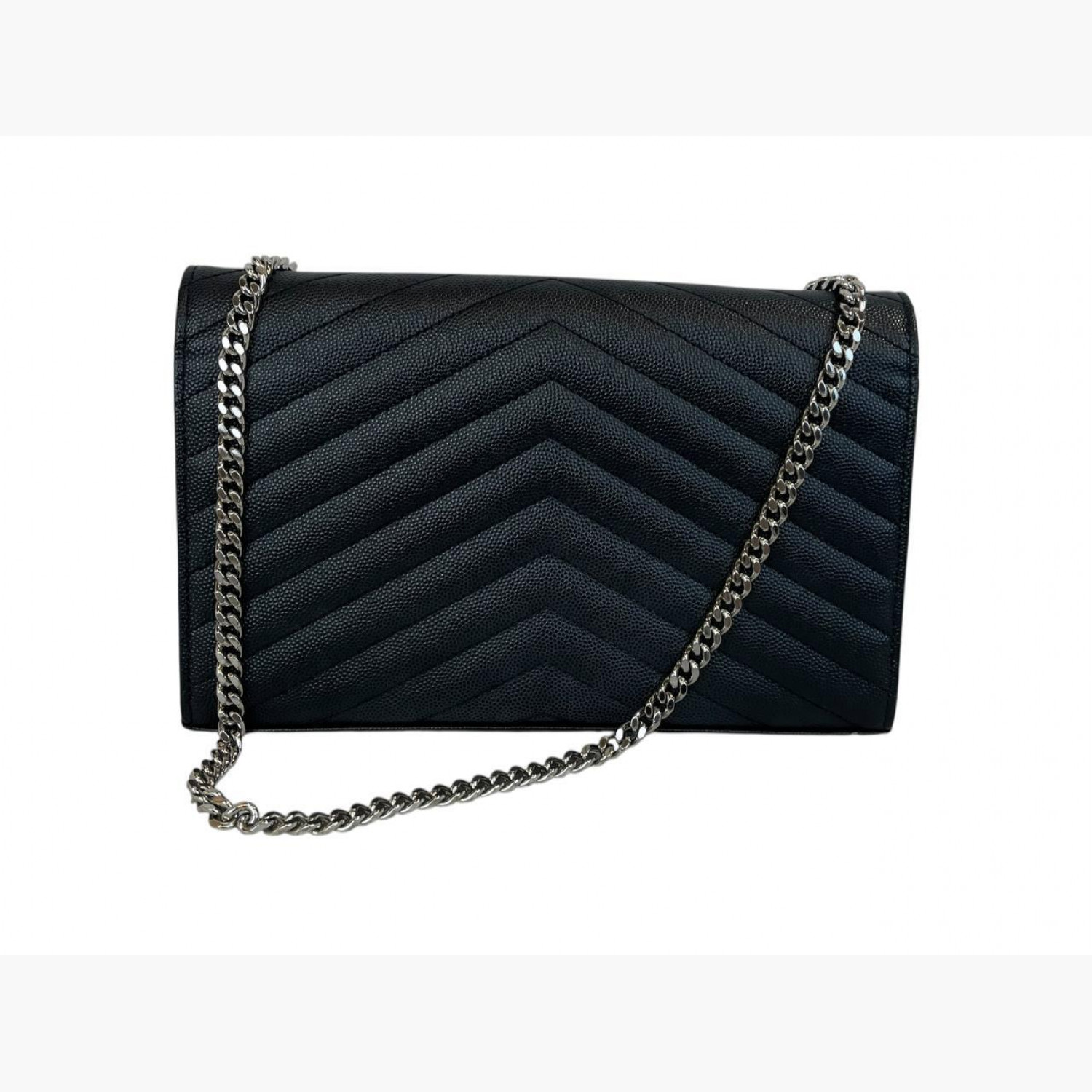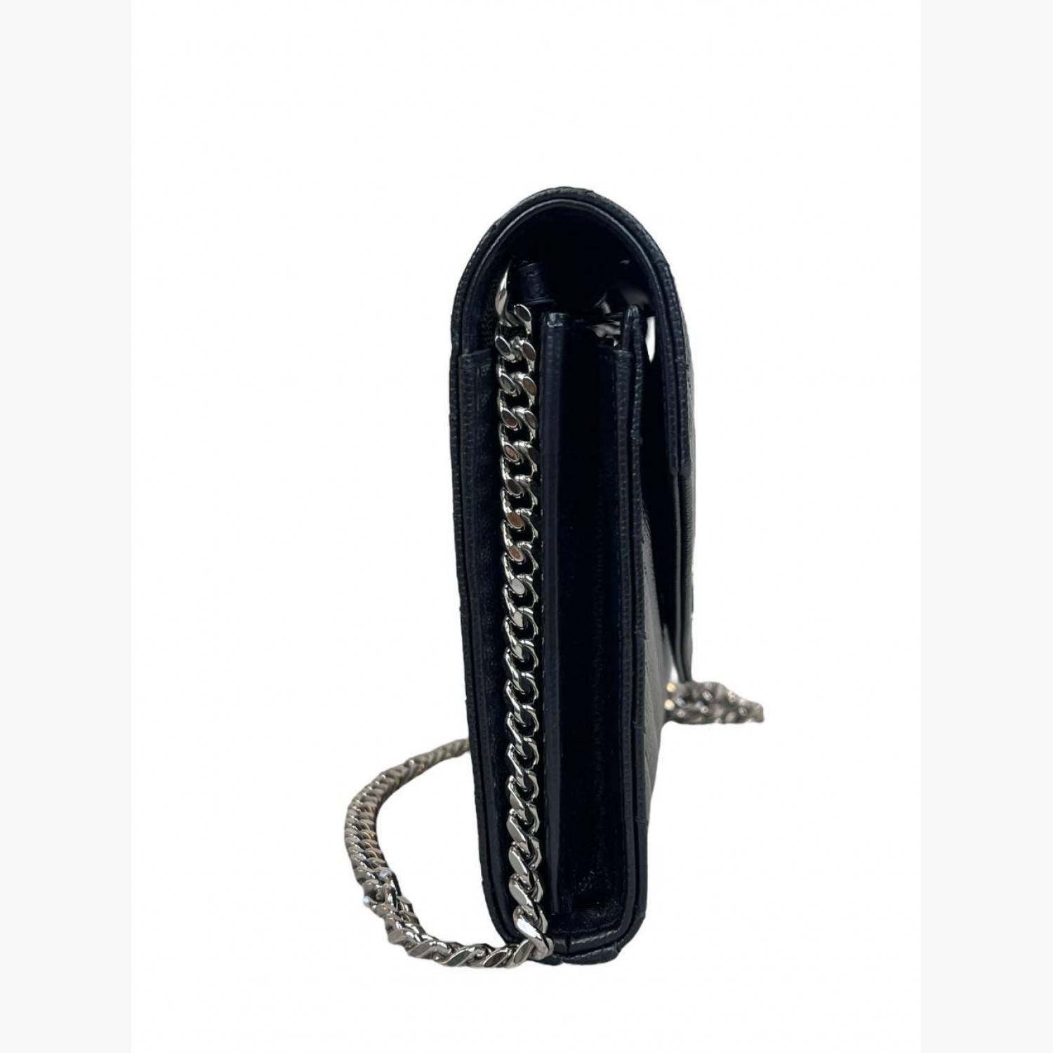 Black leather bag with a silver-tone metal chain strap. Inside are two main compartments: the first has no pockets, the second has an open pocket with ten card slots on top. Between the first and second compartments there is a zip pocket. In excellent condition with minor wear on the hardware.