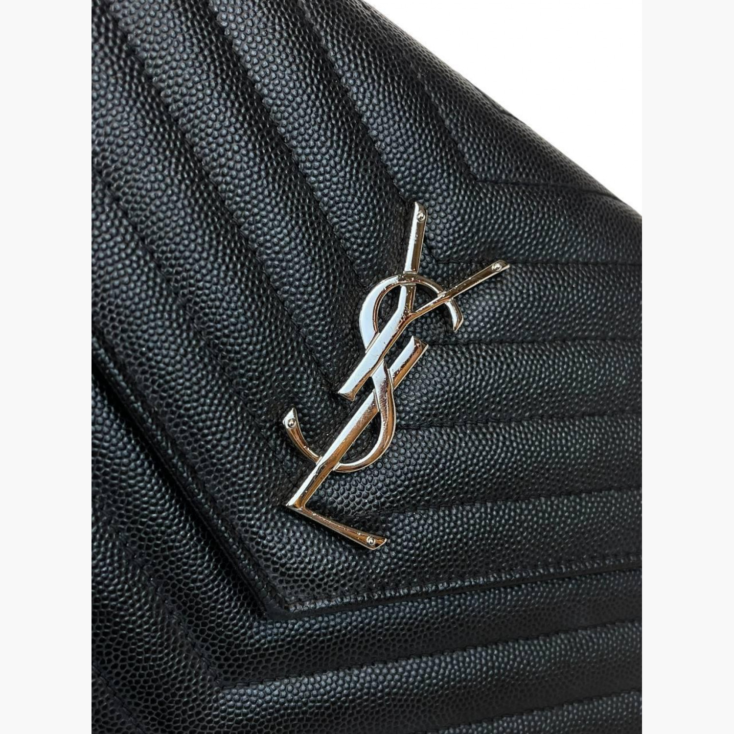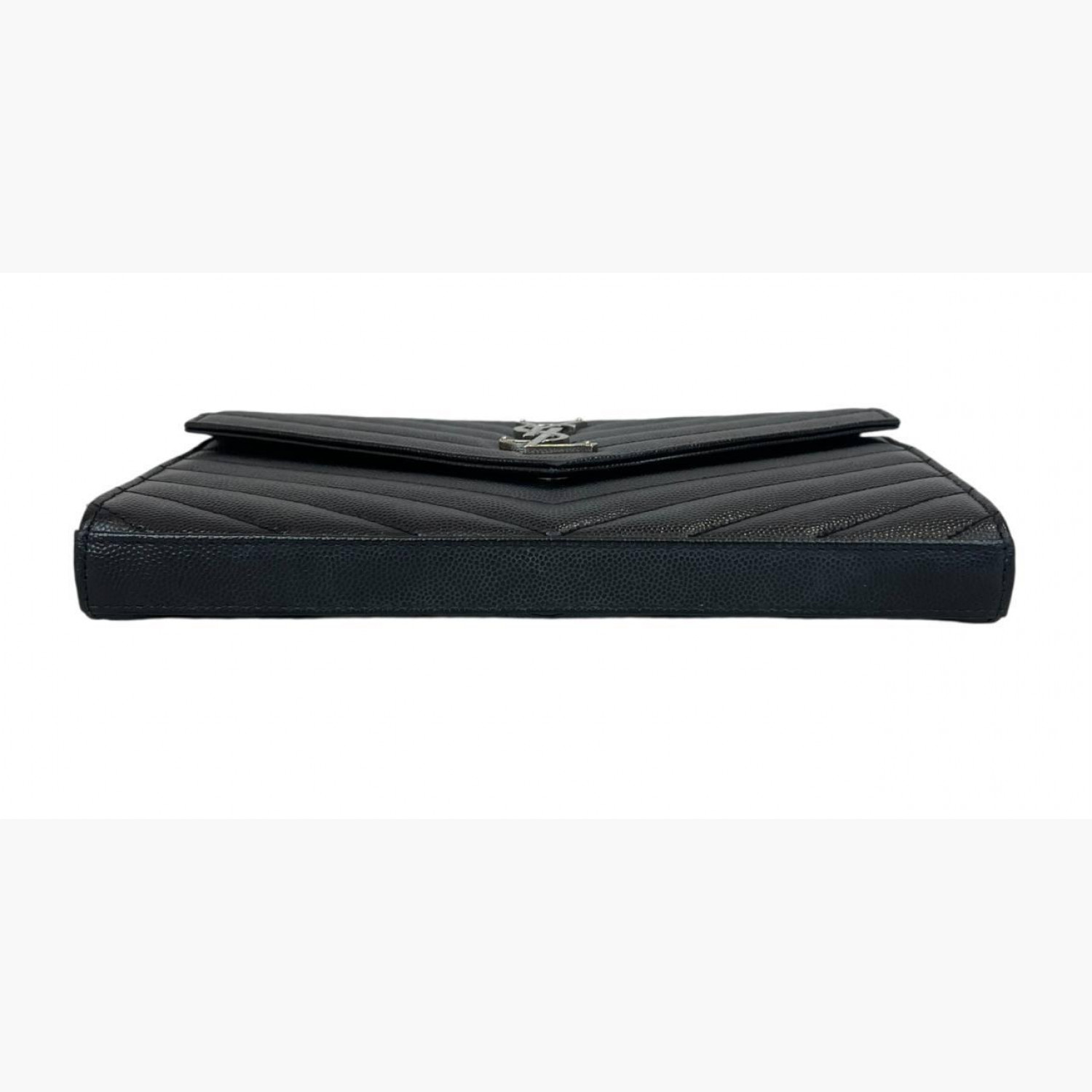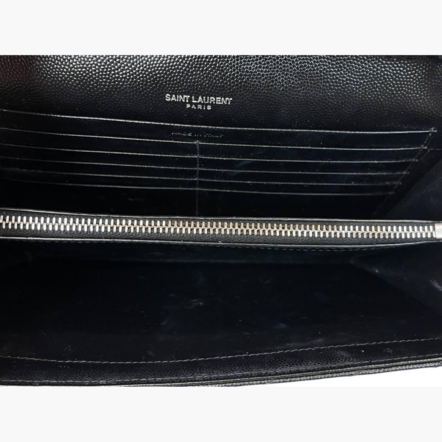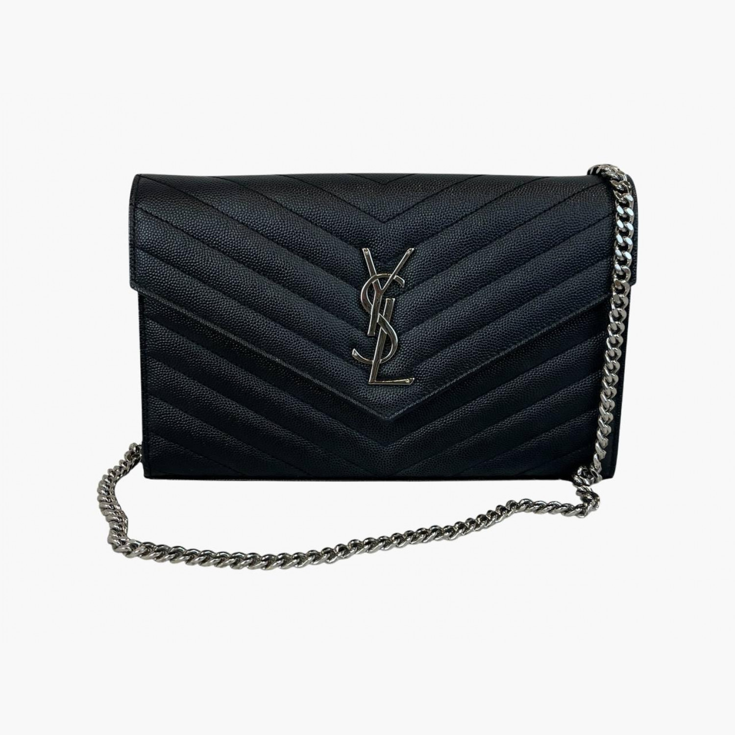 Black leather bag with a silver-tone metal chain strap. Inside are two main compartments: the first has no pockets, the second has an open pocket with ten card slots on top. Between the first and second compartments there is a zip pocket. In excellent condition with minor wear on the hardware.