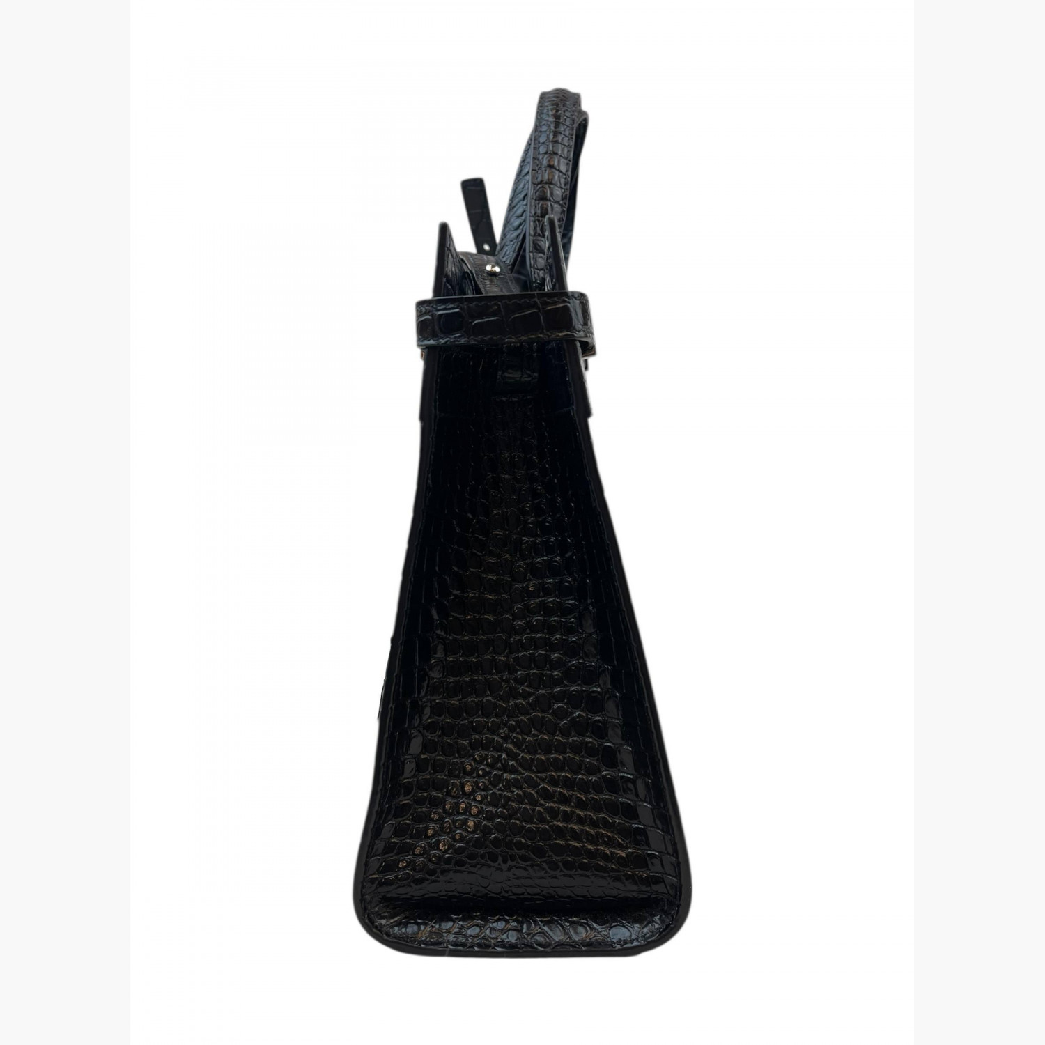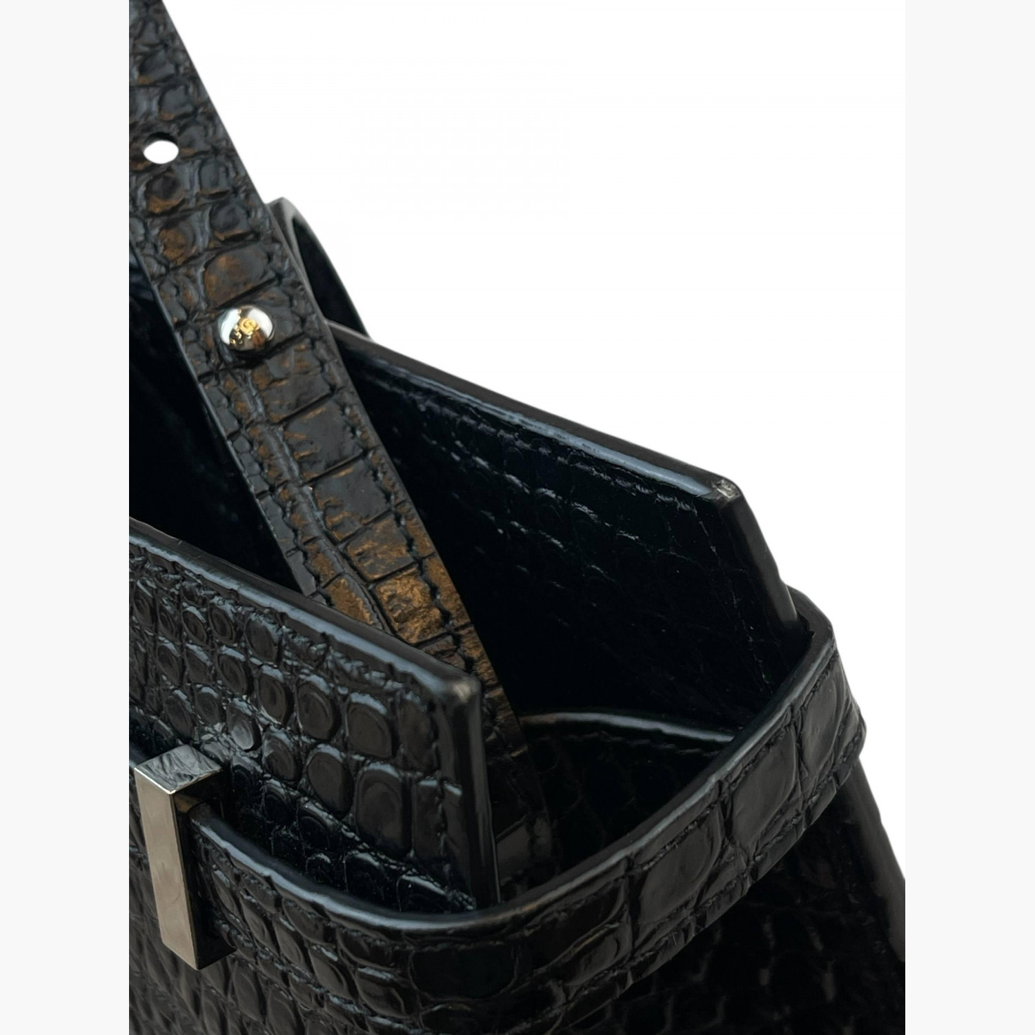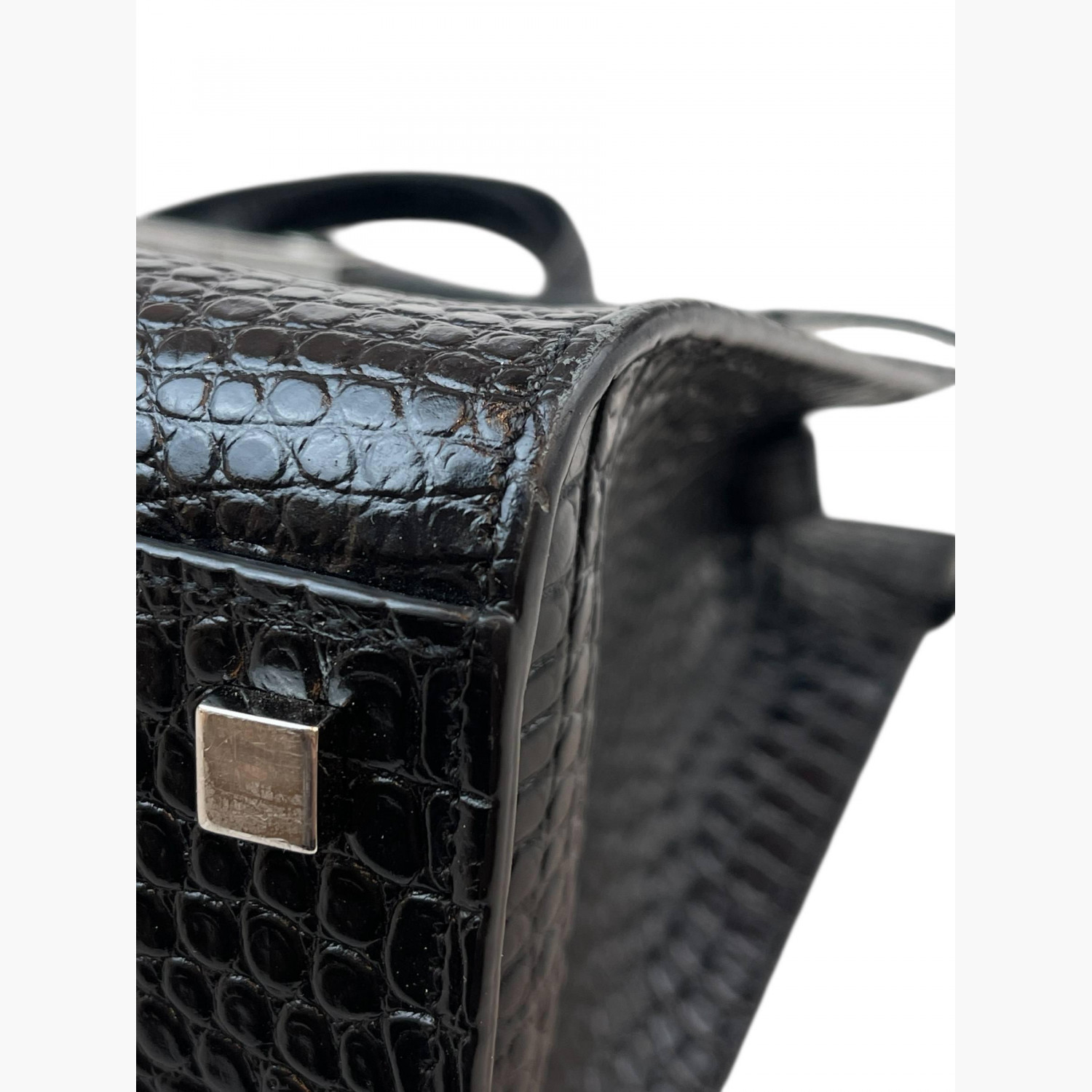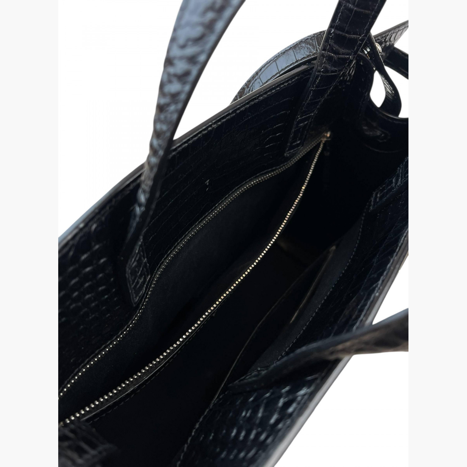 Black crocodile leather bag. Inside, there is one main compartment with a zip pocket and an open pocket.In good condition, with signs of wear.
