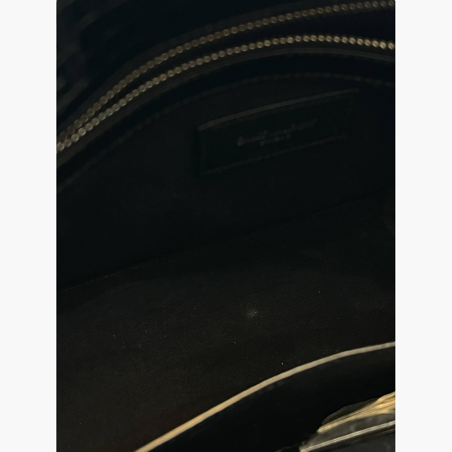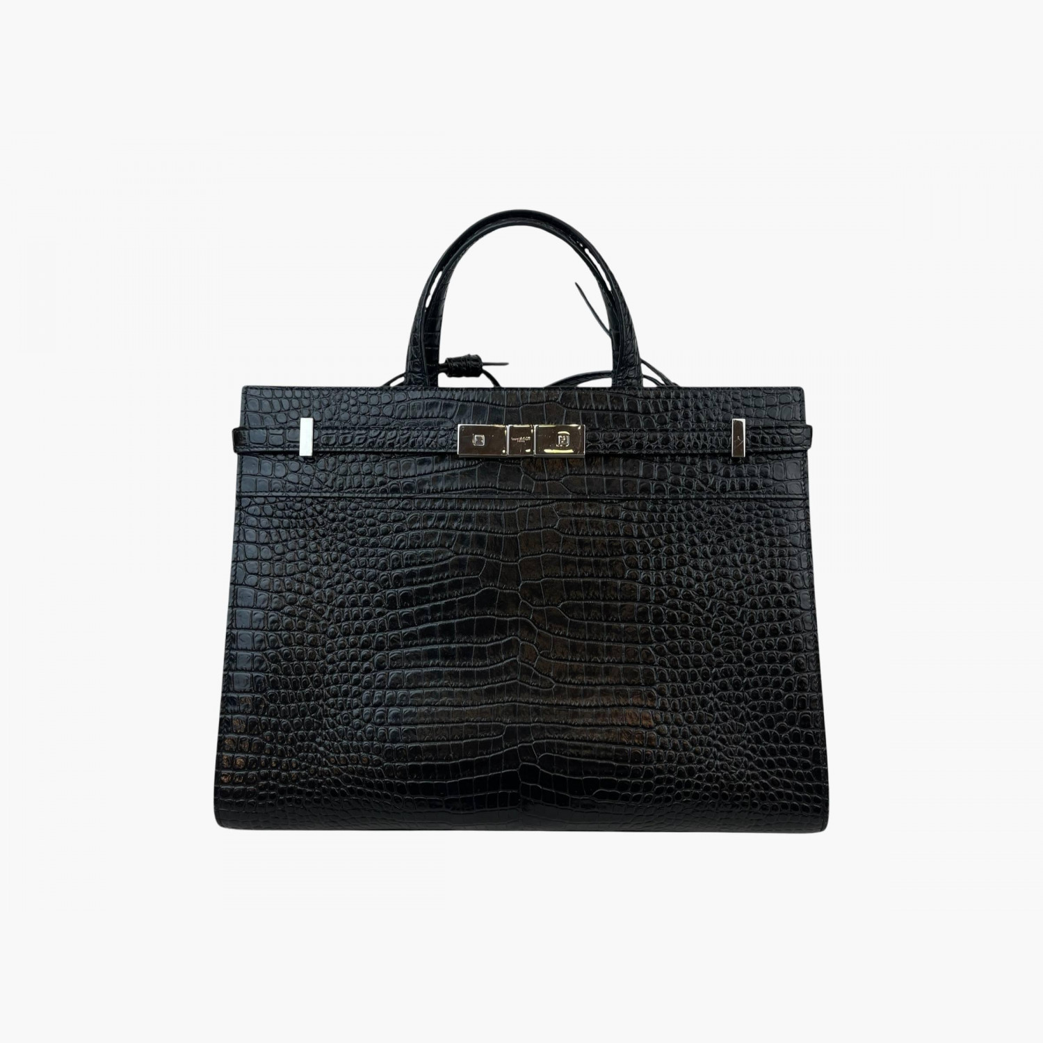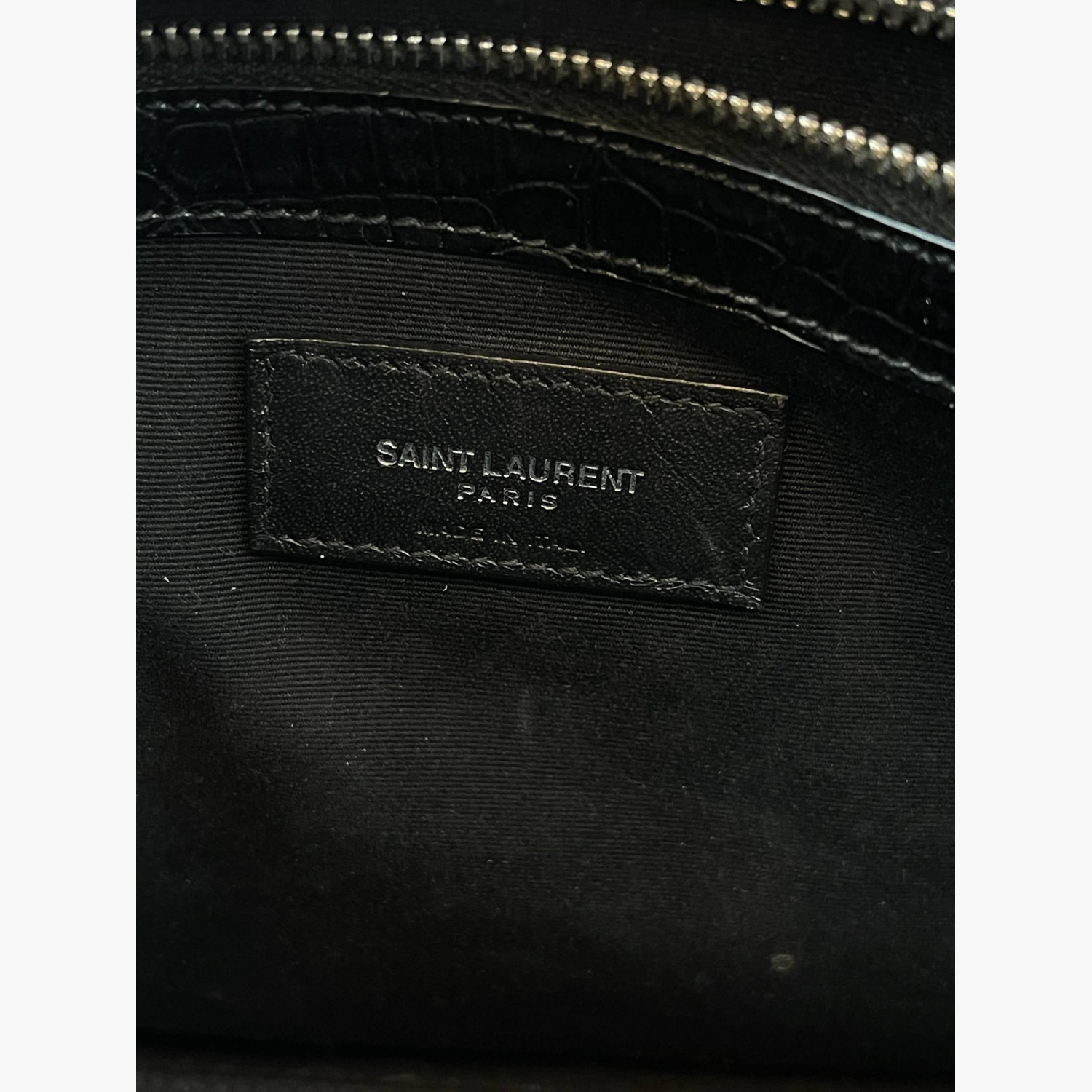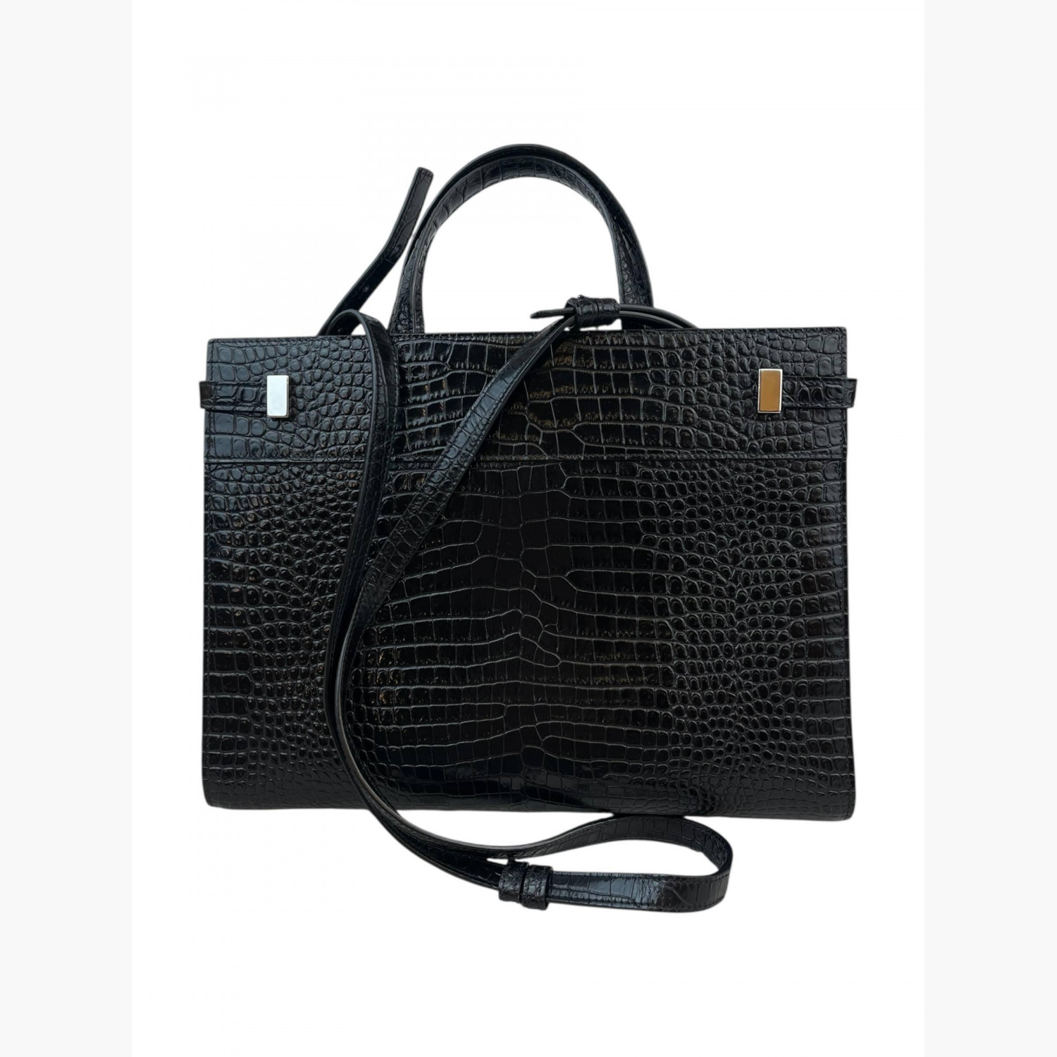 Black crocodile leather bag. Inside, there is one main compartment with a zip pocket and an open pocket.In good condition, with signs of wear.