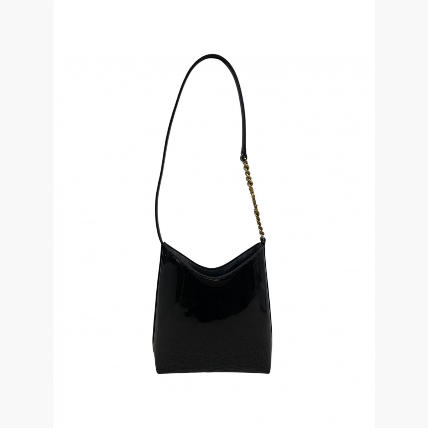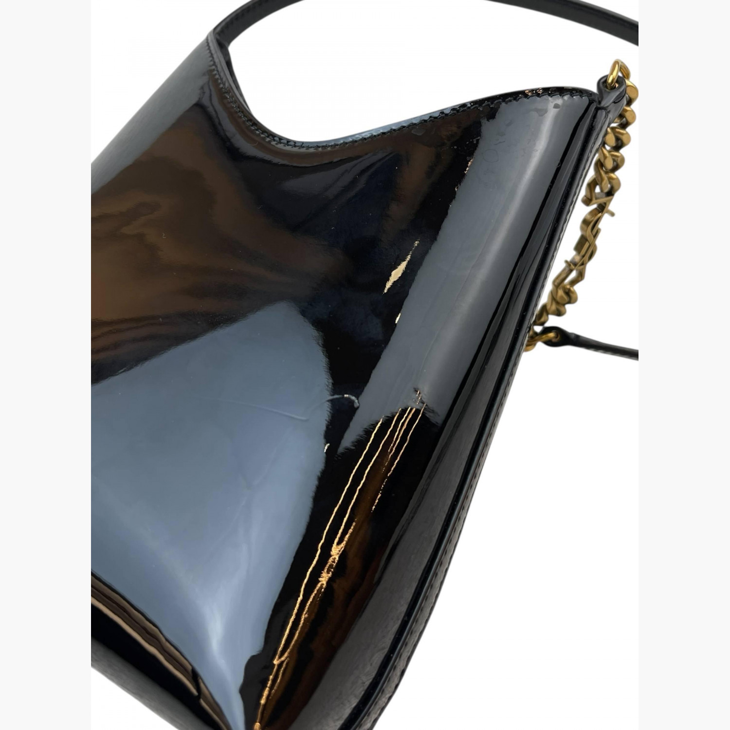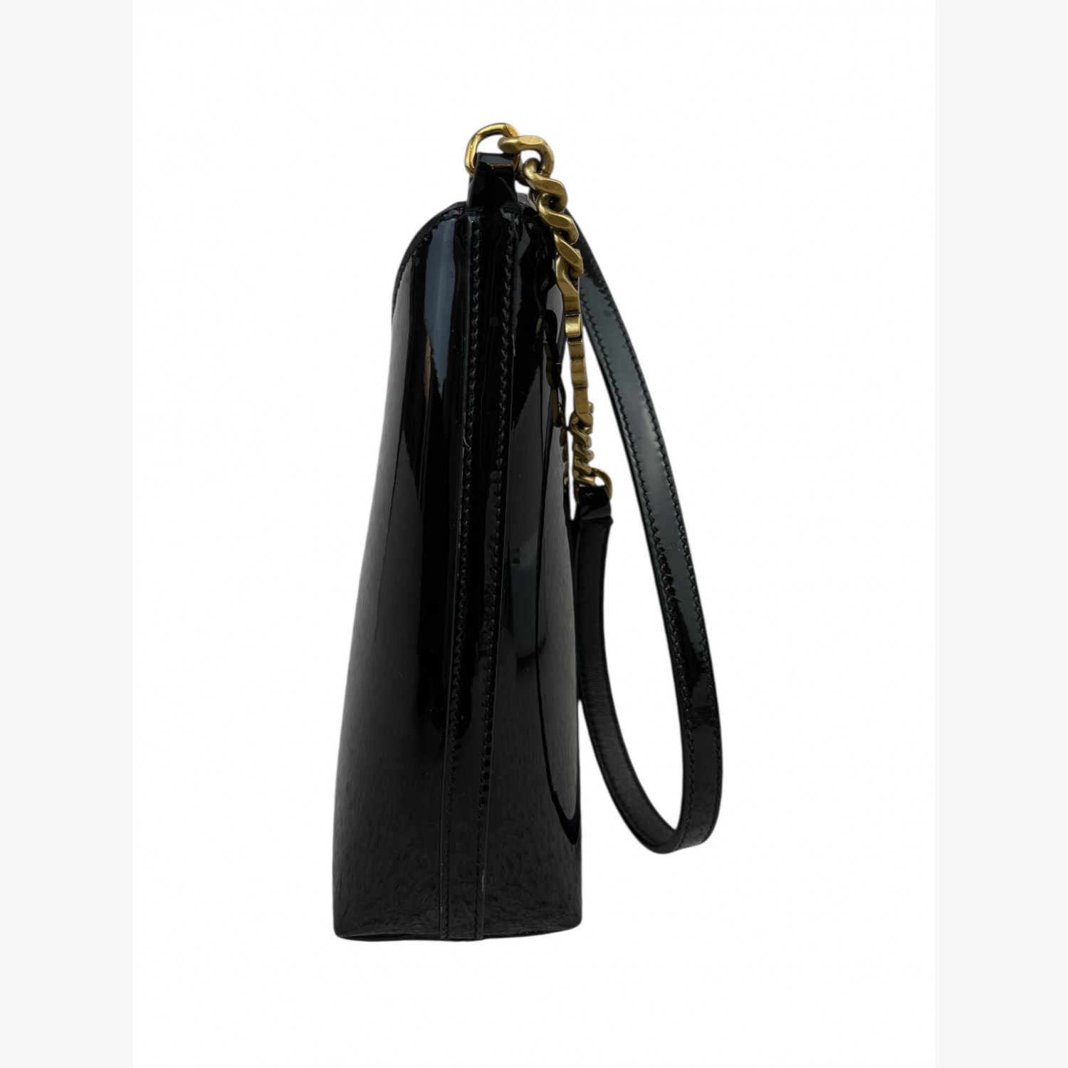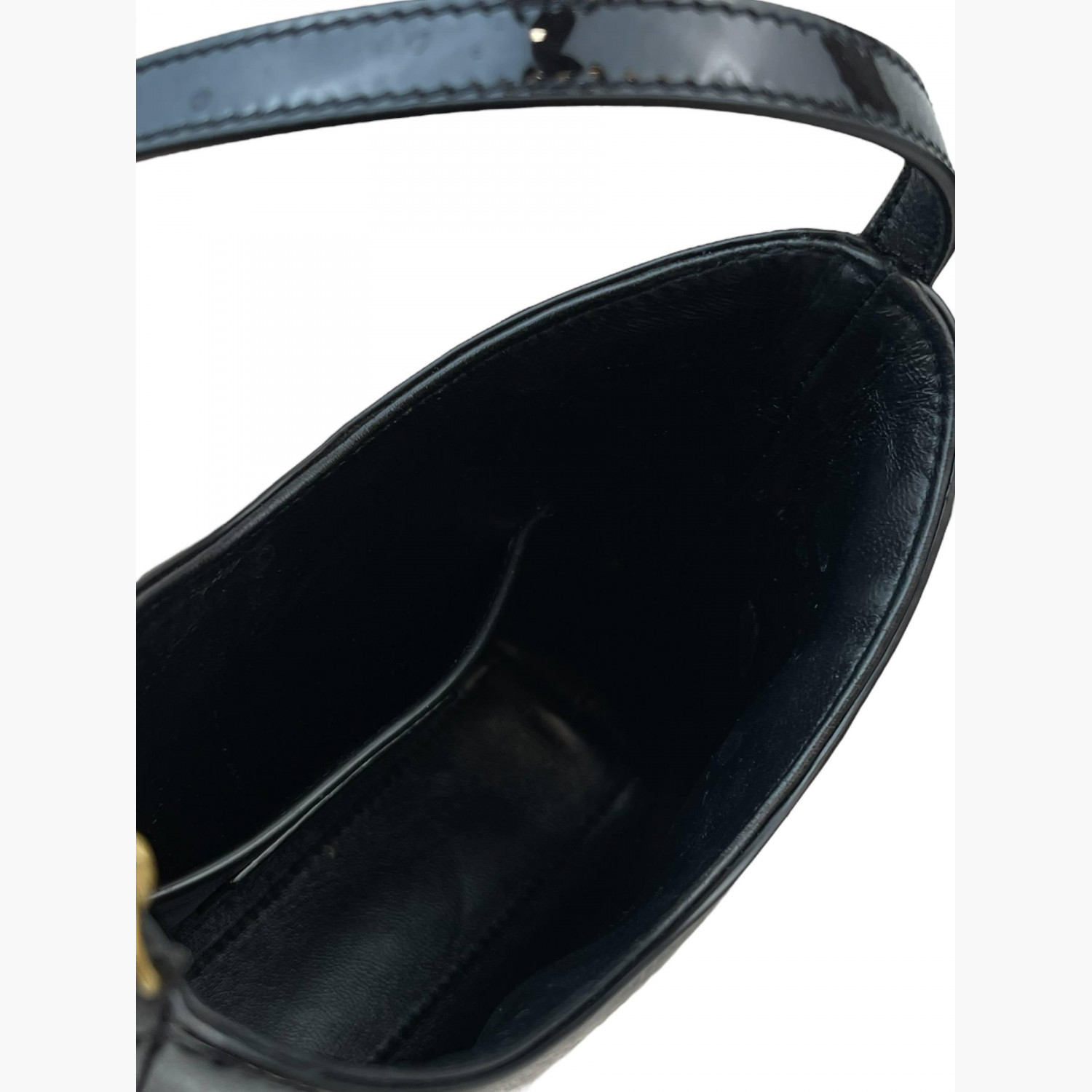Black patent leather bag with a short strap. Inside, there is one main compartment with a flat open pocket.In good condition, with stains and scratches.