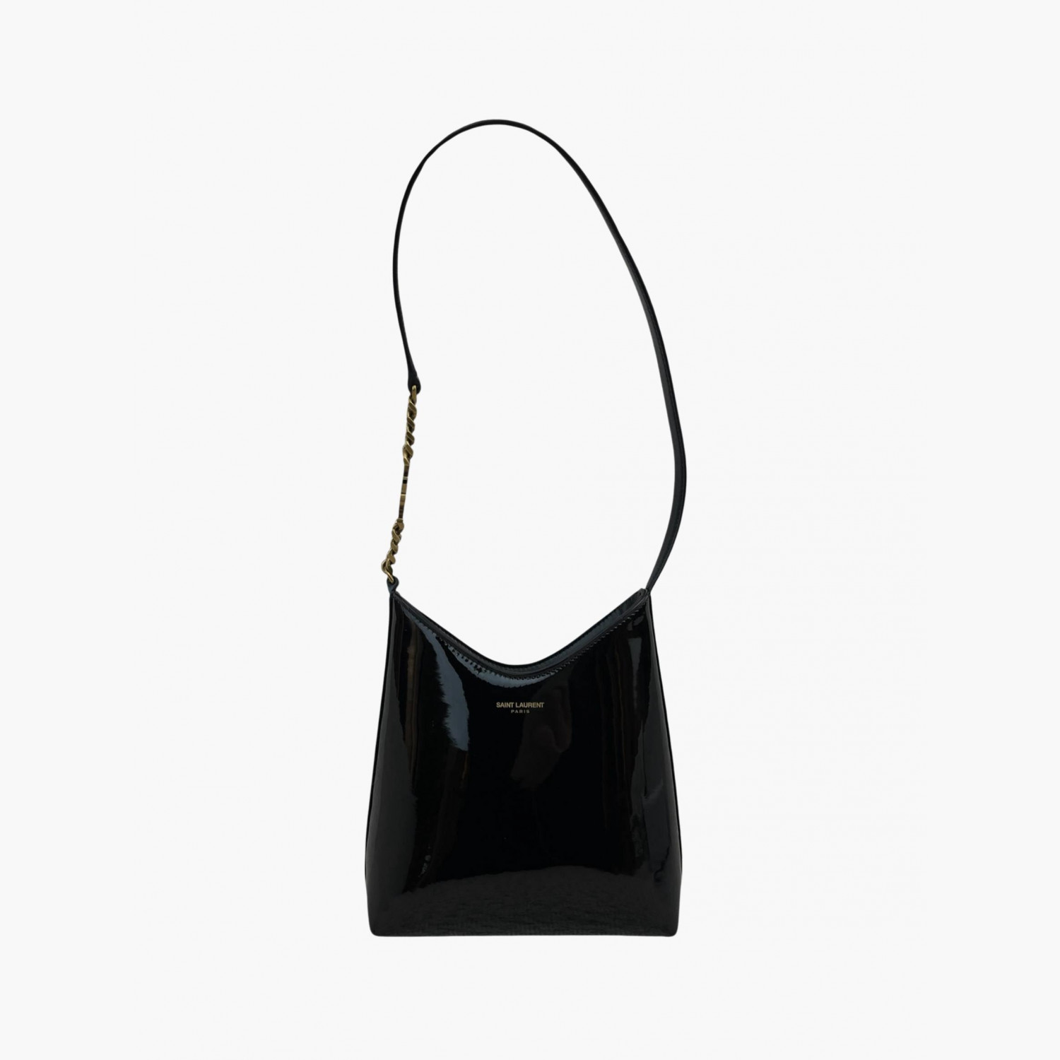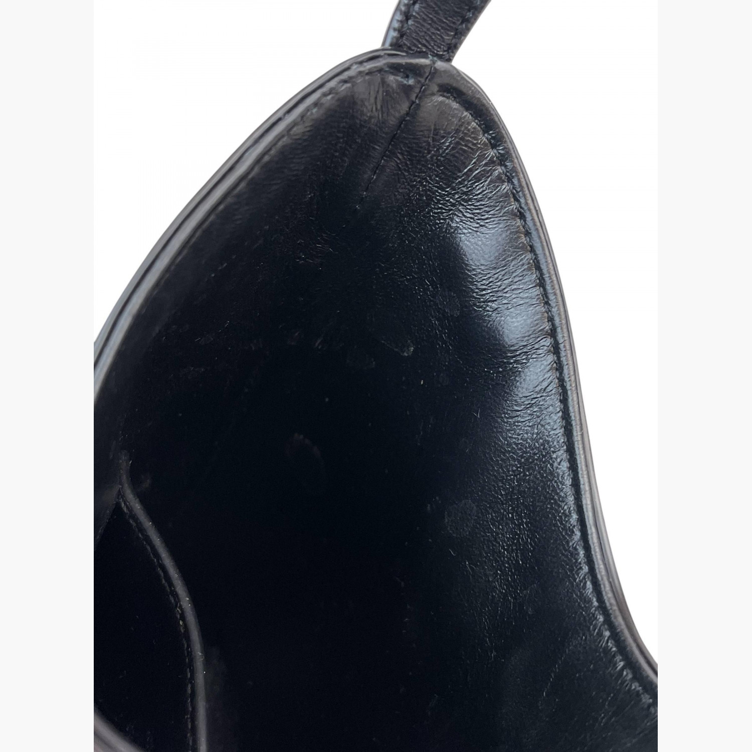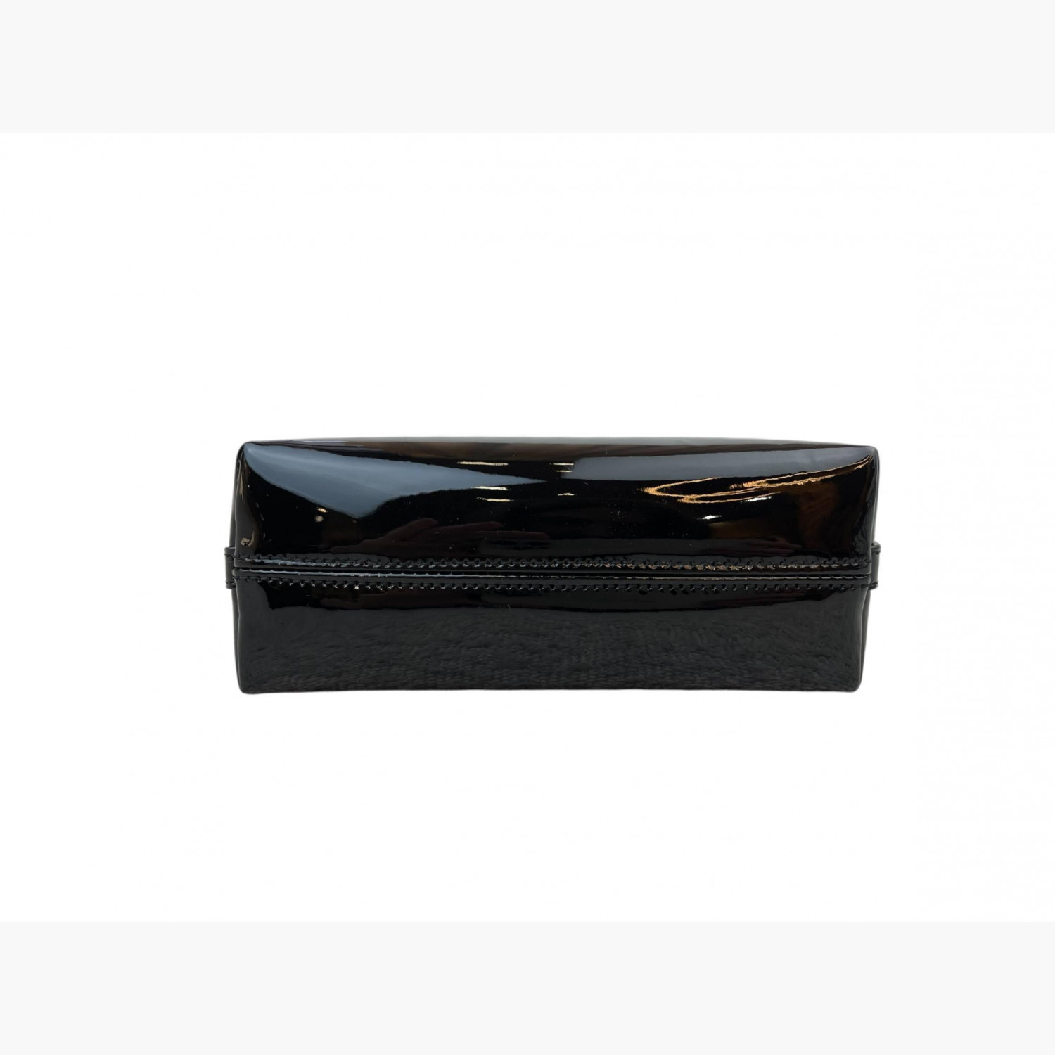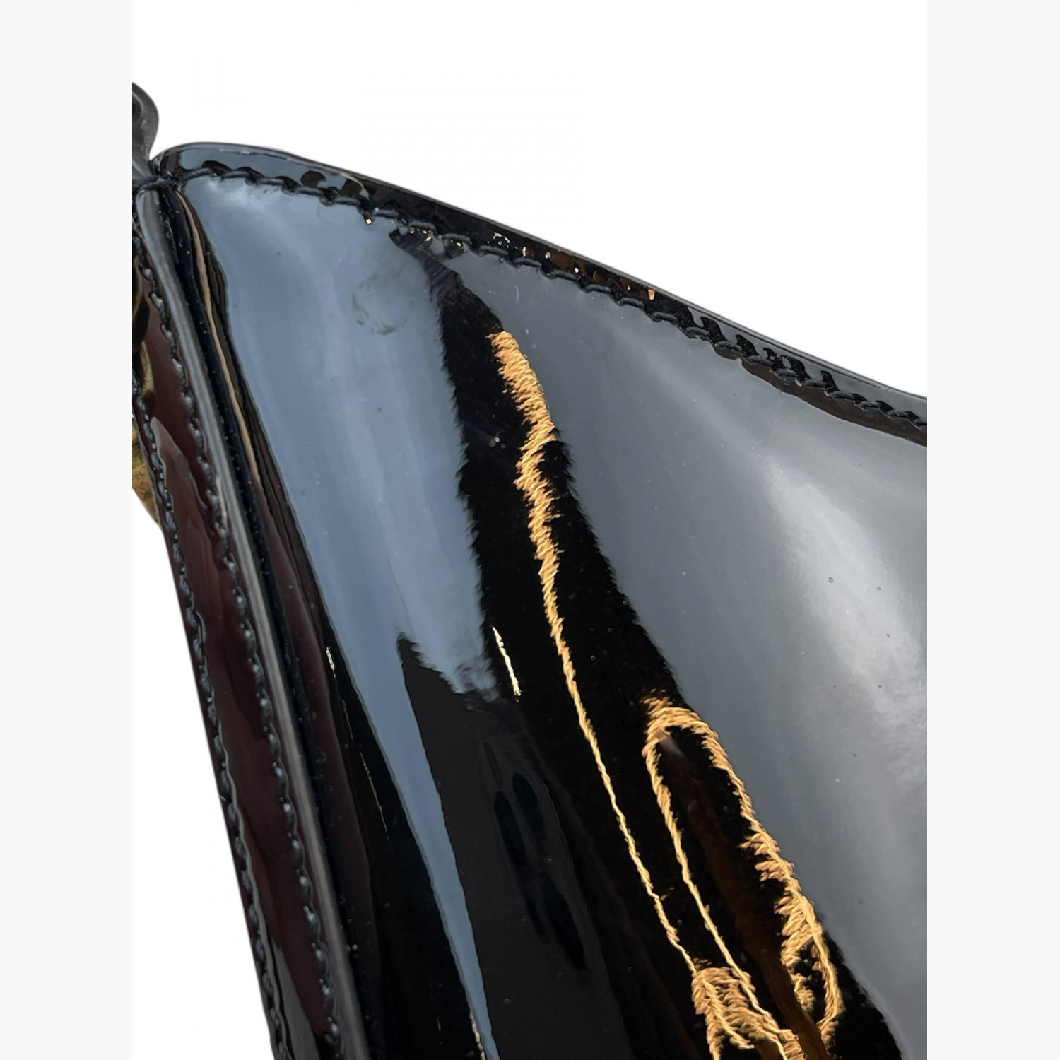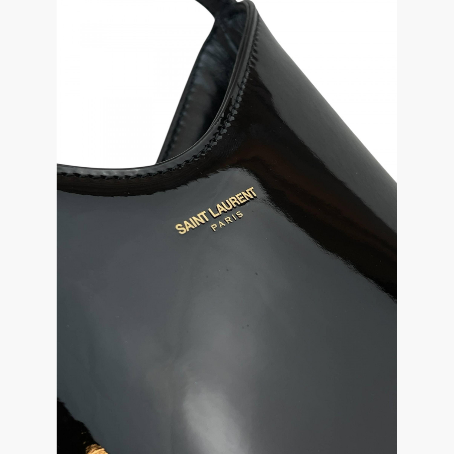 Black patent leather bag with a short strap. Inside, there is one main compartment with a flat open pocket.In good condition, with stains and scratches.