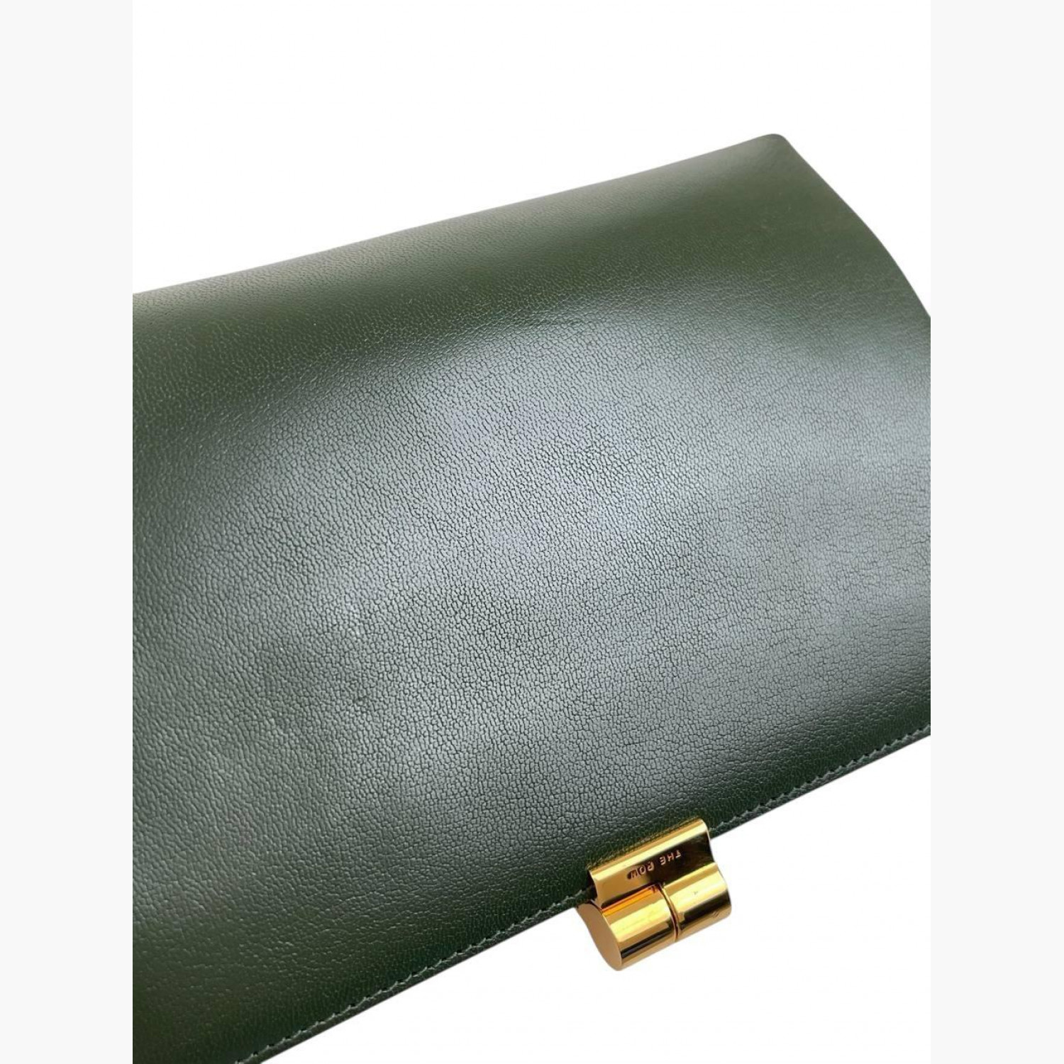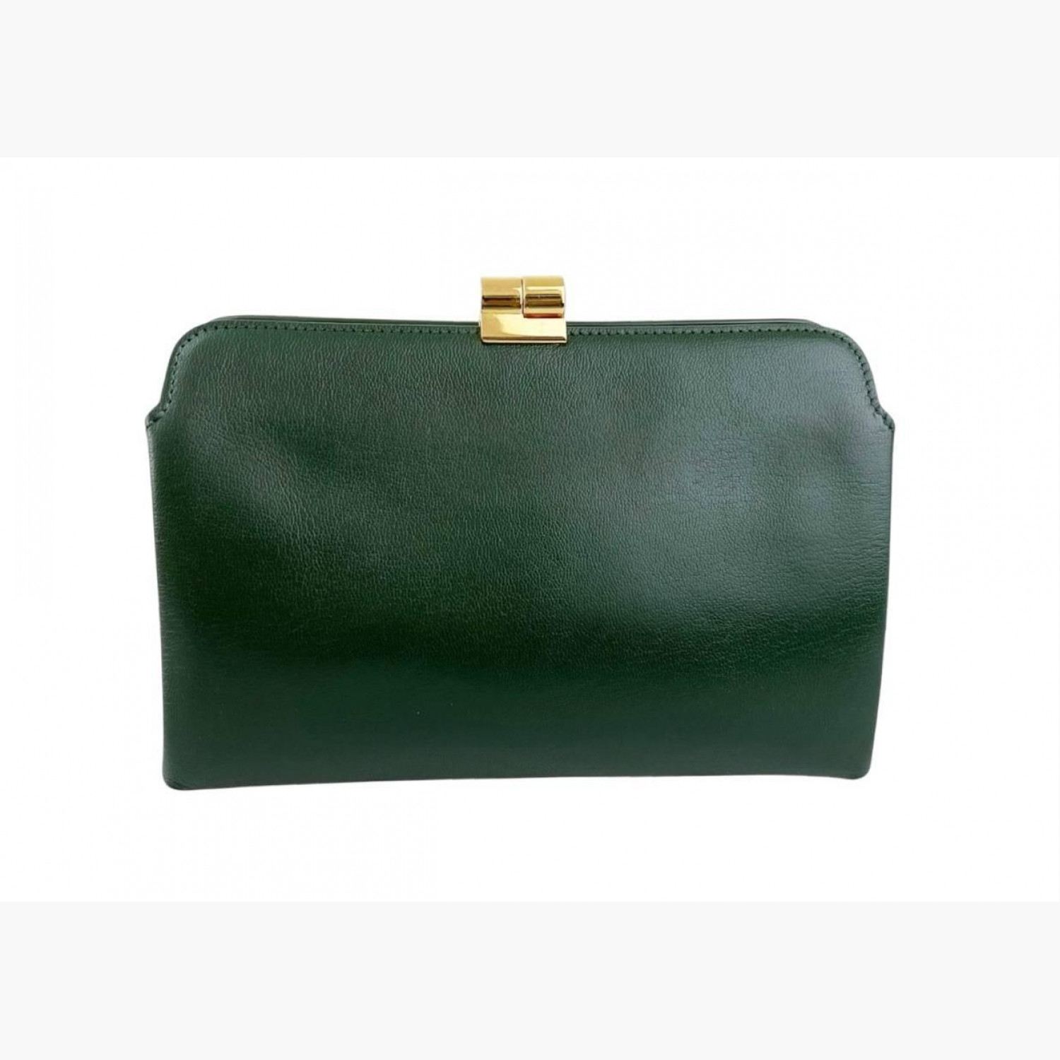 Green leather clutch. Two main compartments inside. In good condition with wear marks and scuffs.