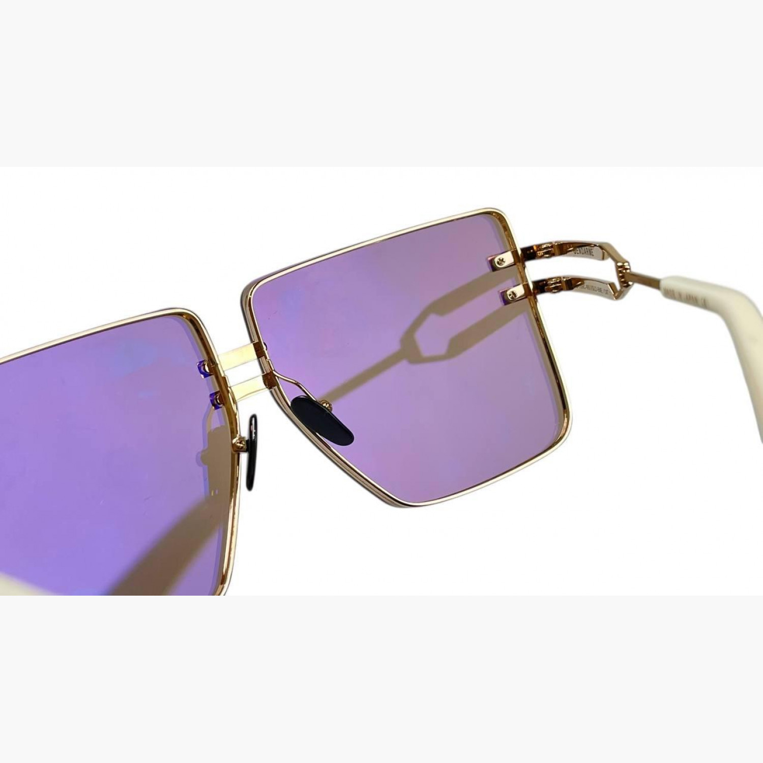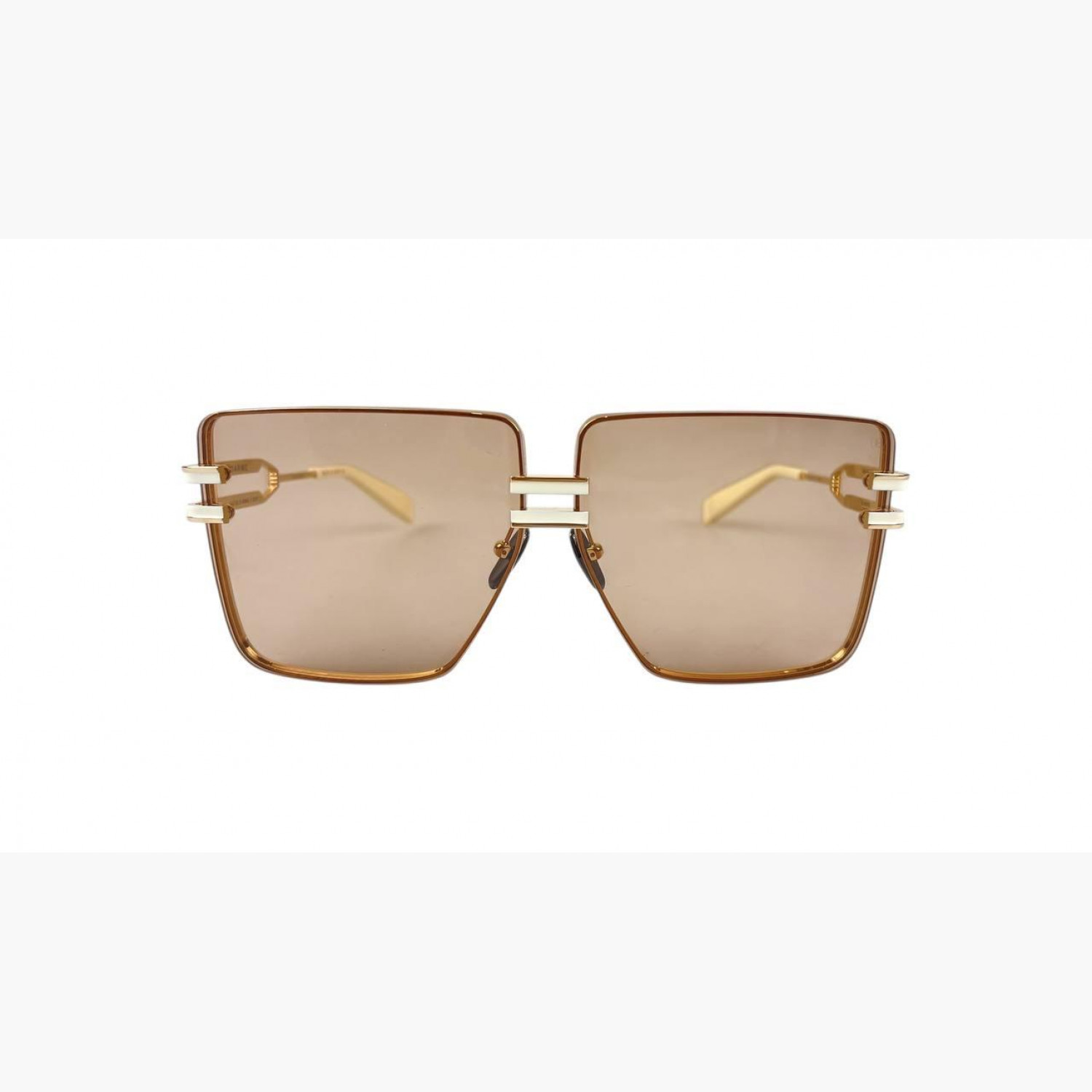 Beige sunglasses with large square lenses. Comes with a case and a cleaning cloth. In good condition, with minor wear marks.