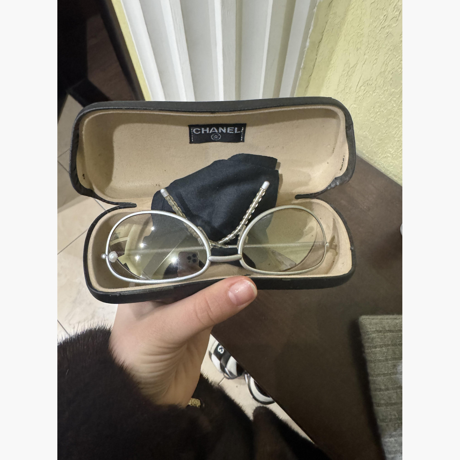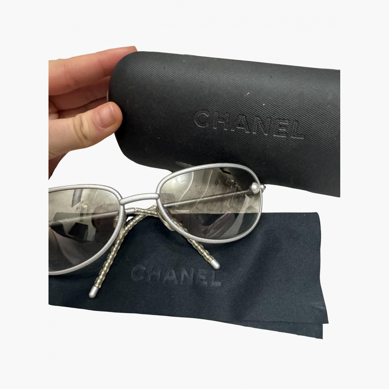Round sunglasses with thin silver-tone metal temples and pearl detailing at the corners of the lenses.The set includes the original case and a cleaning cloth.In excellent condition, with no significant signs of wear.