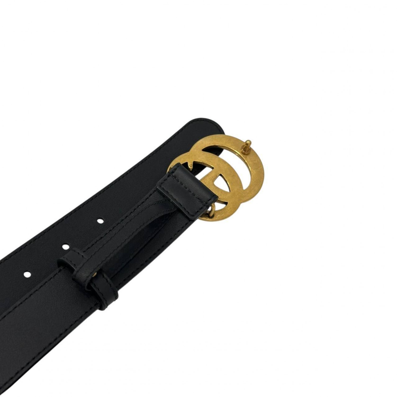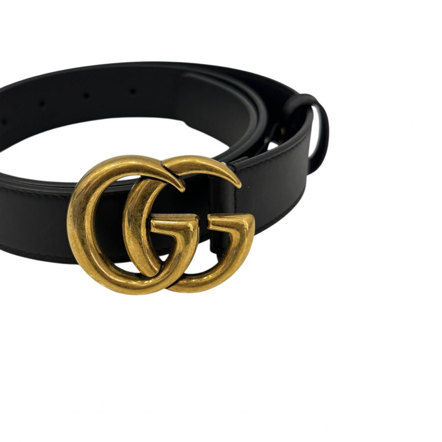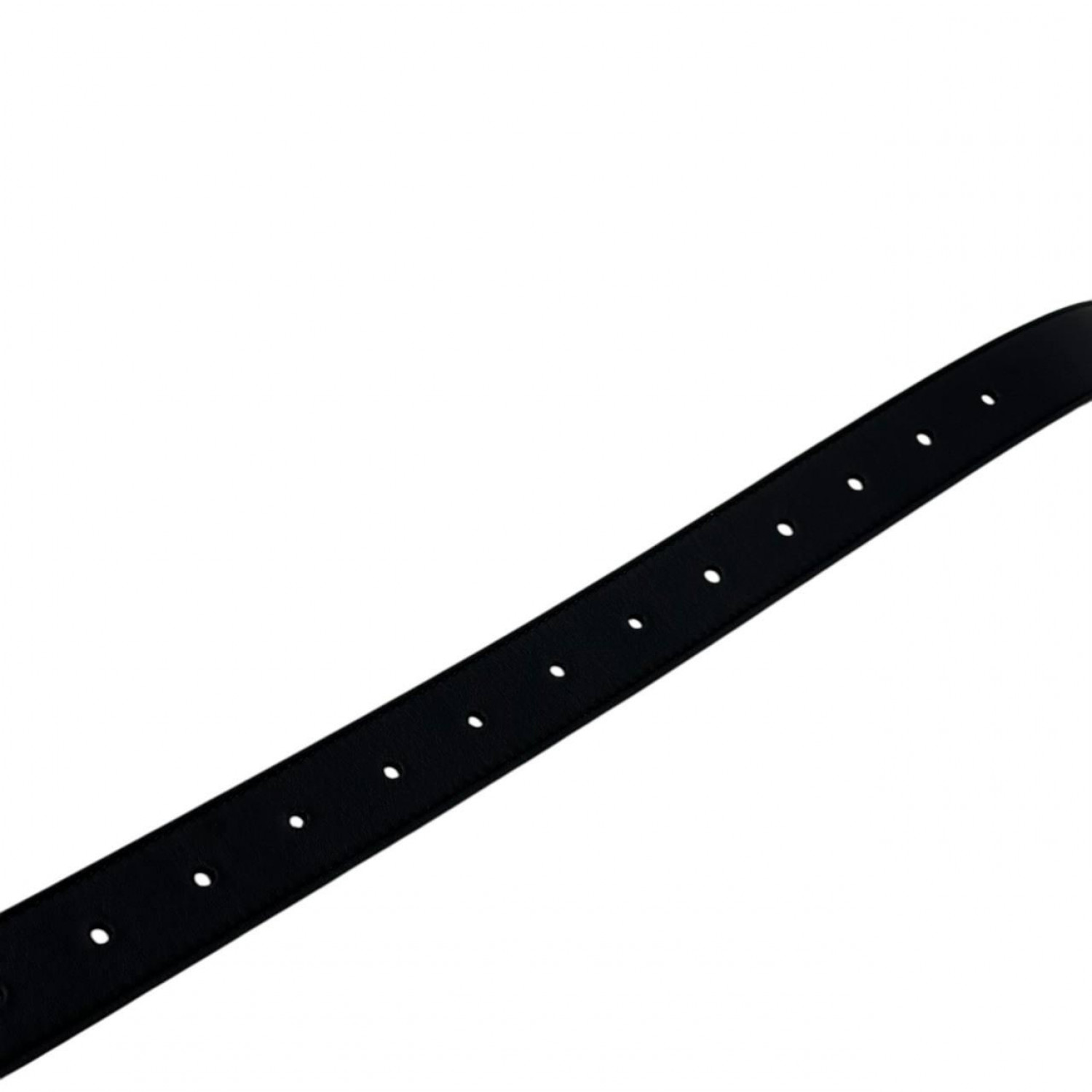 Black leather belt with a gold-tone buckle. In excellent condition with scuffs. Additional holes have been punched.