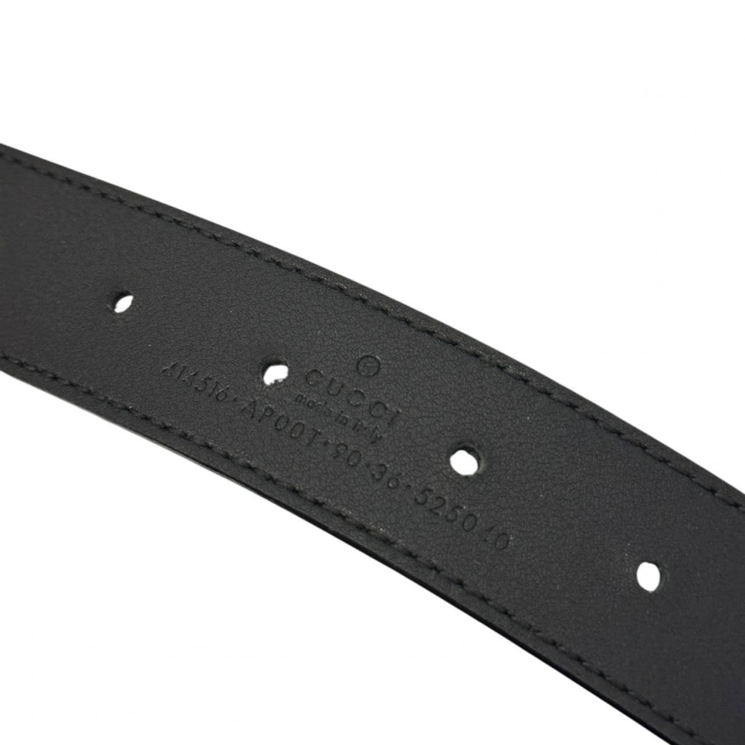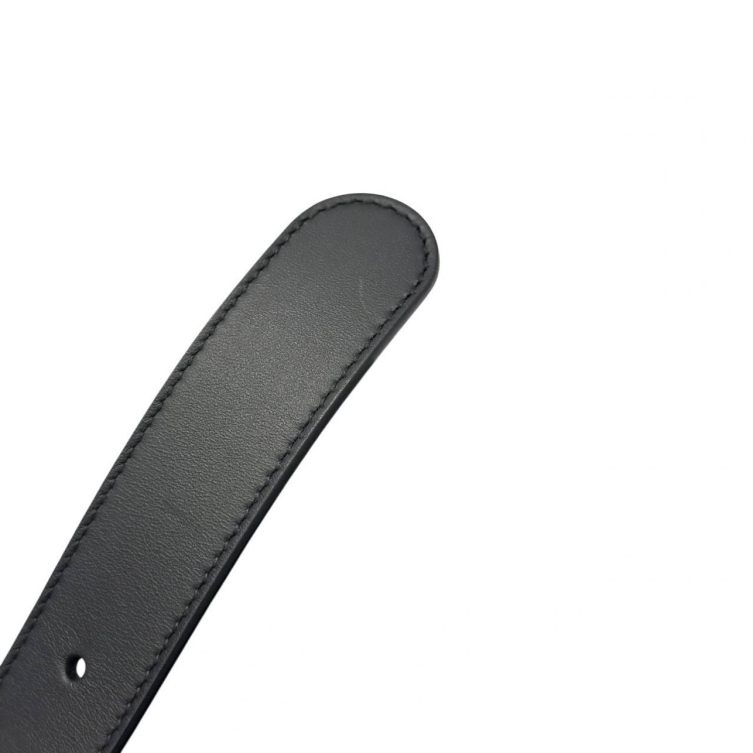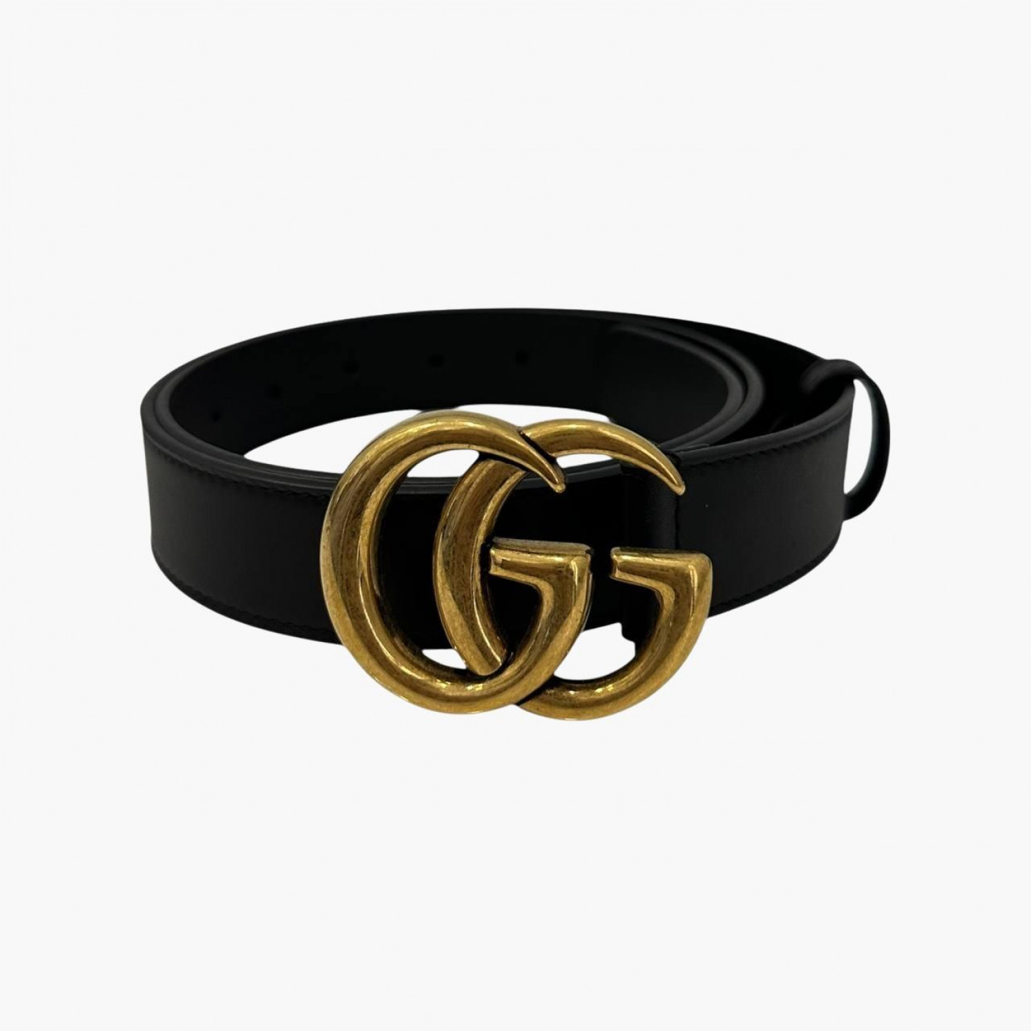 Black leather belt with a gold-tone buckle. In excellent condition with scuffs. Additional holes have been punched.