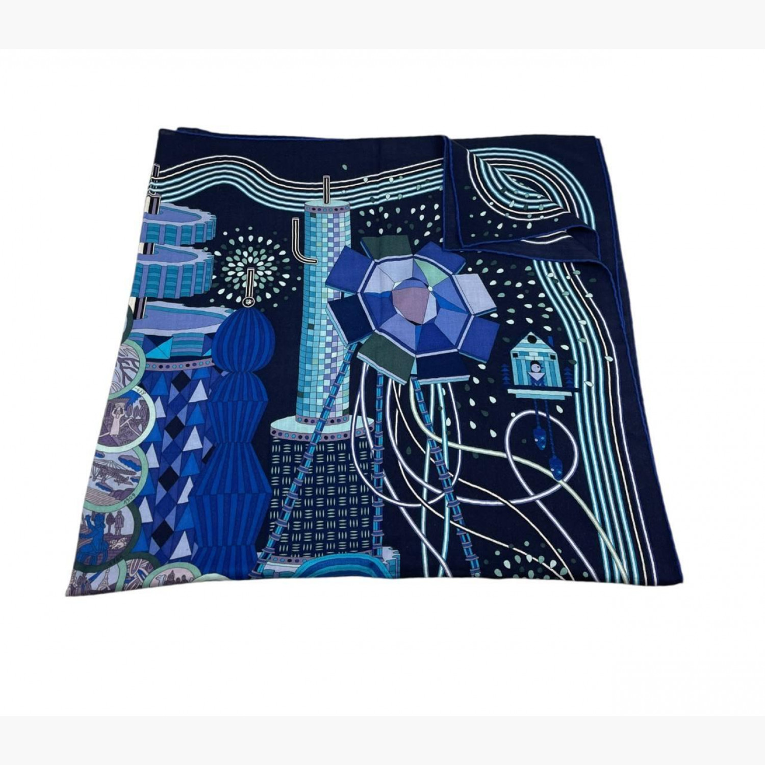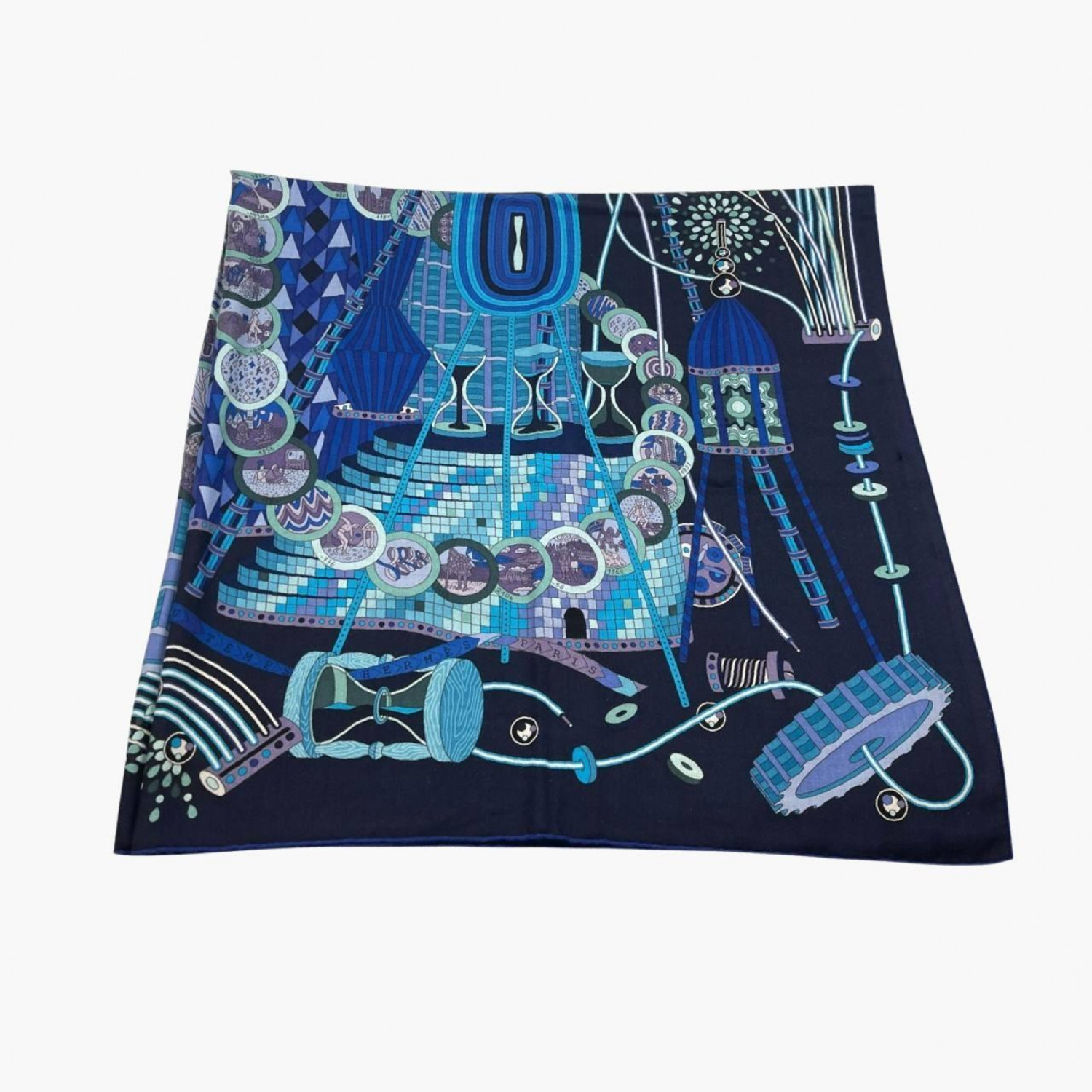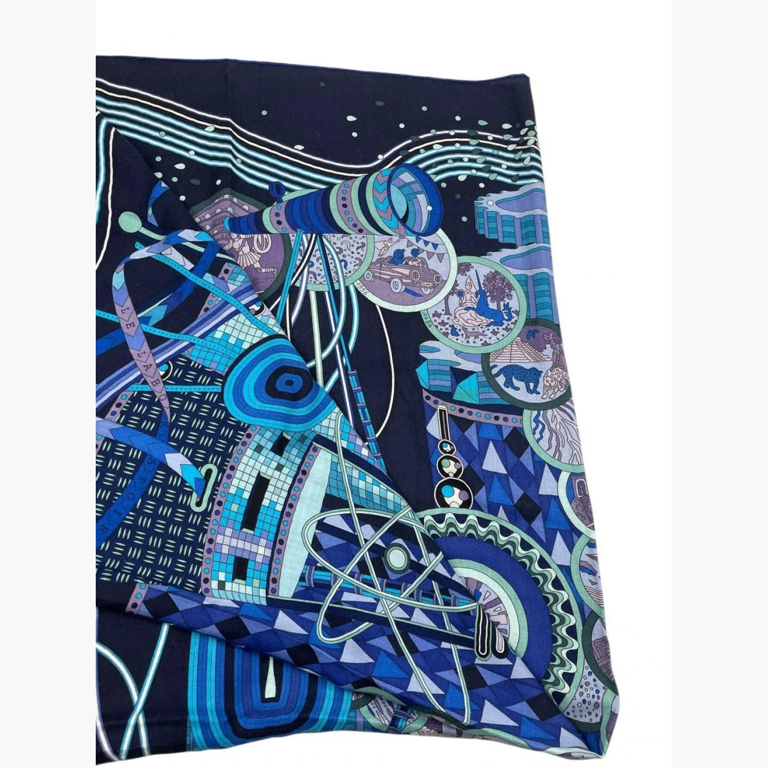 Blue shawl with the “Le Laboratoire du Temps” pattern. Composition: 65% cashmere, 35% silk. In good condition, with a minor defect and a small stain.