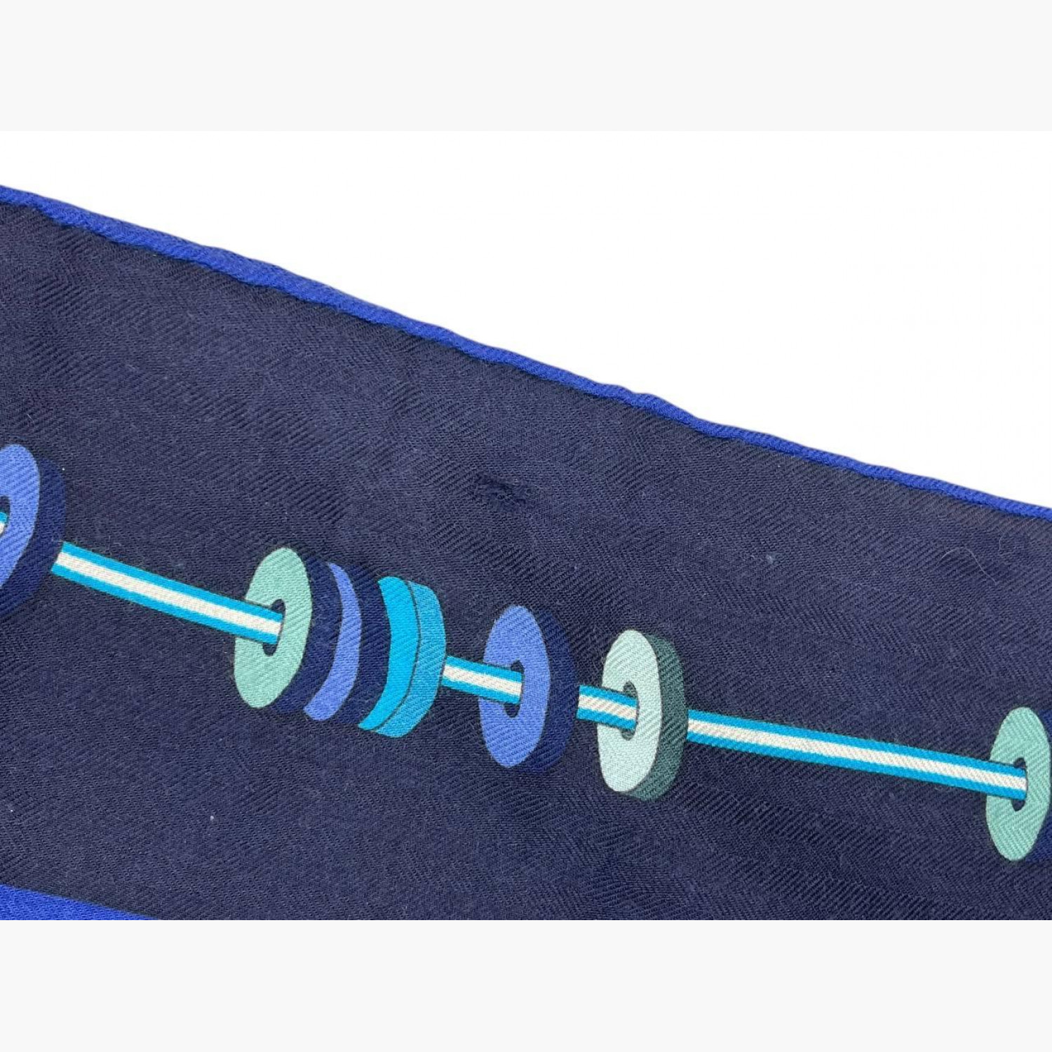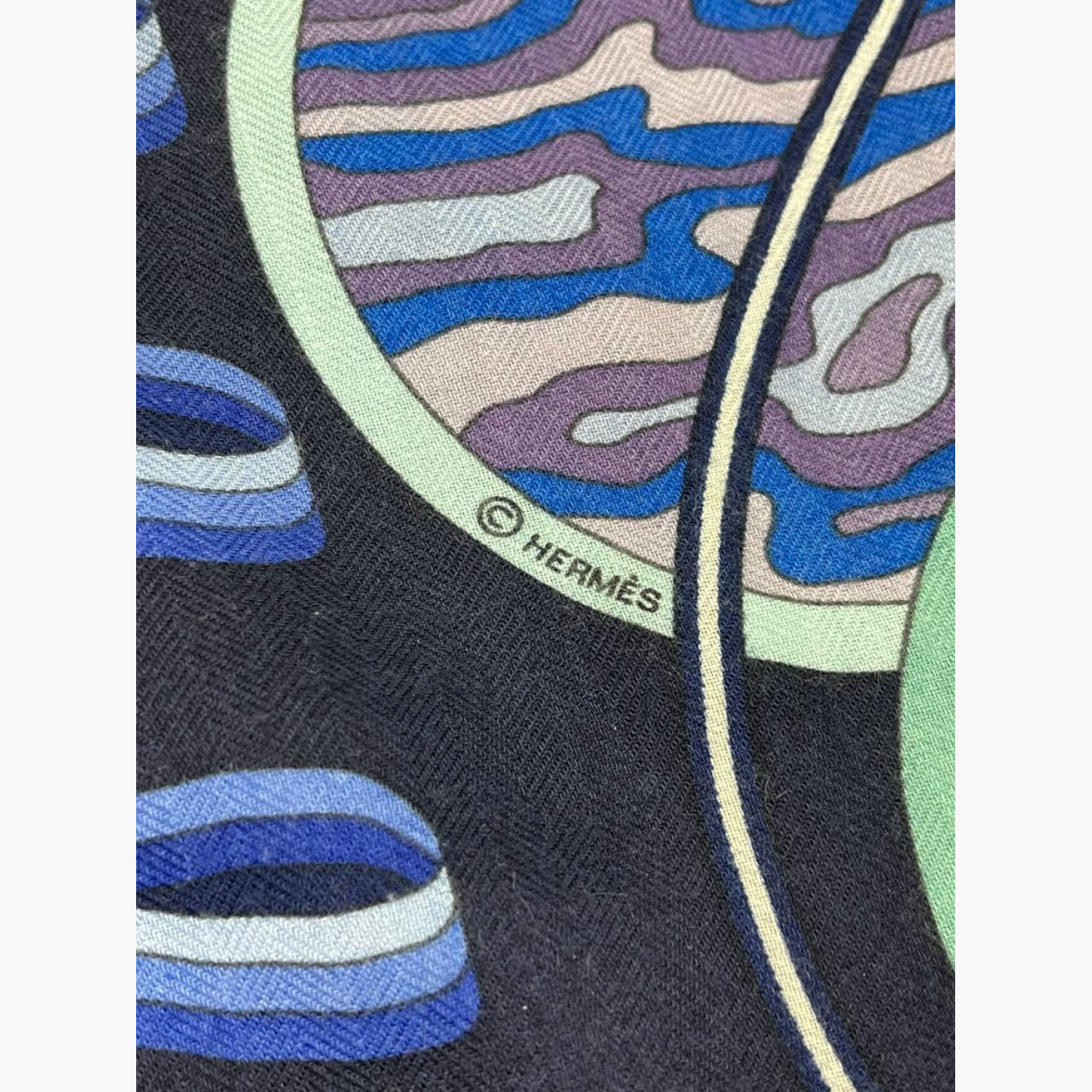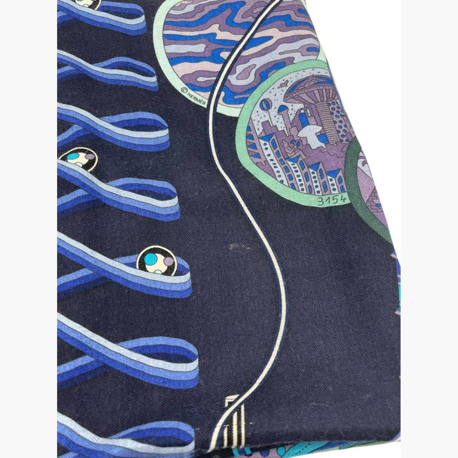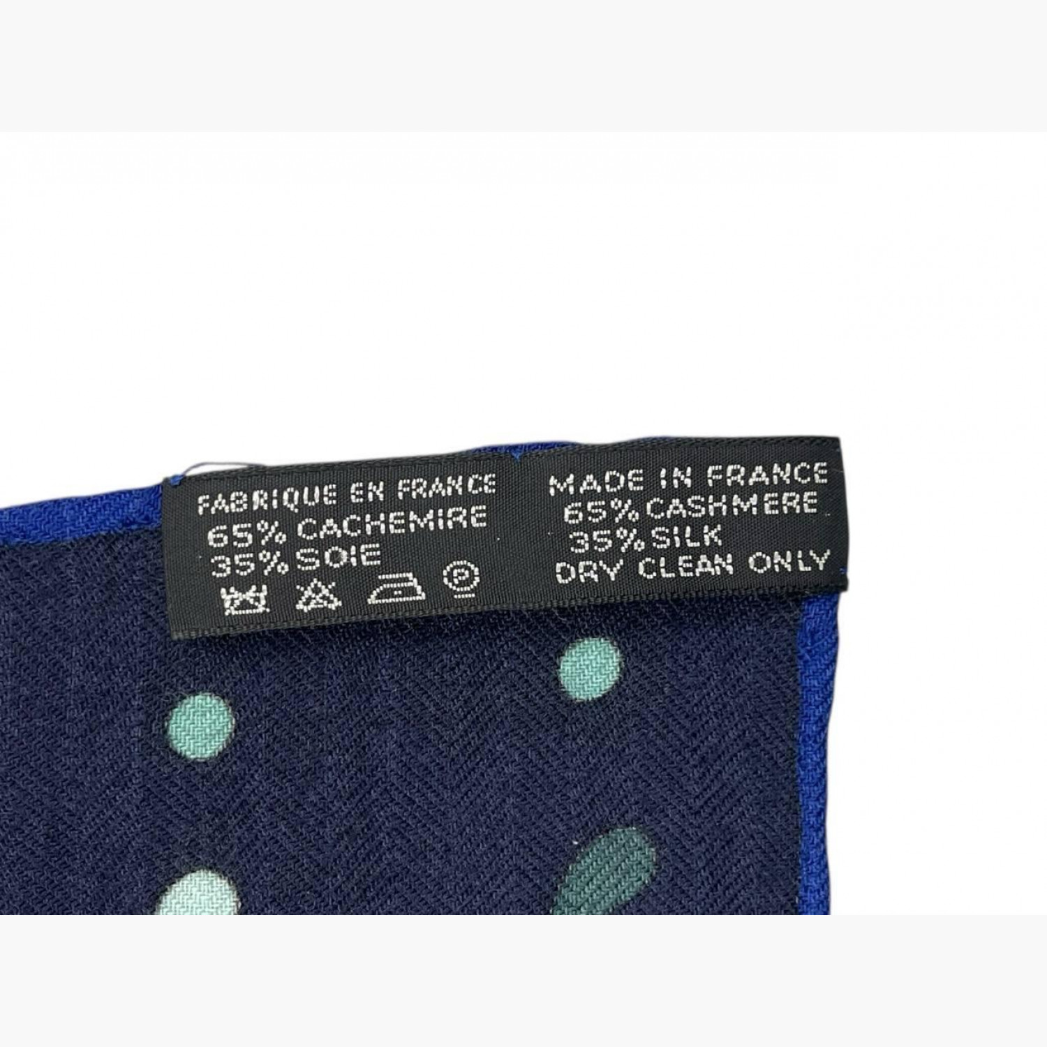 Blue shawl with the “Le Laboratoire du Temps” pattern. Composition: 65% cashmere, 35% silk. In good condition, with a minor defect and a small stain.