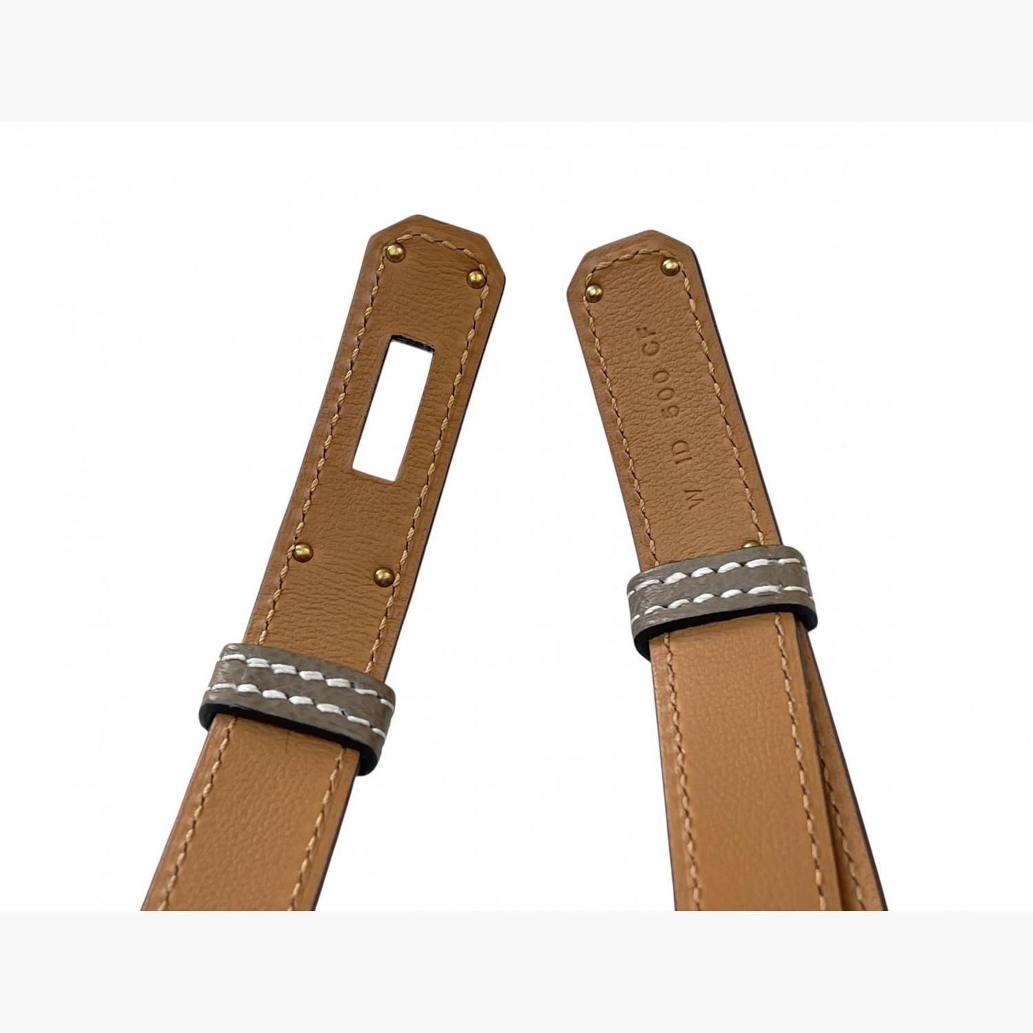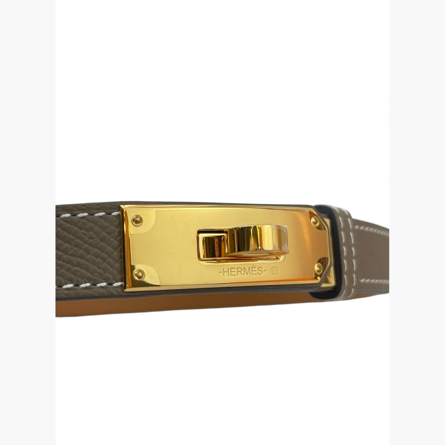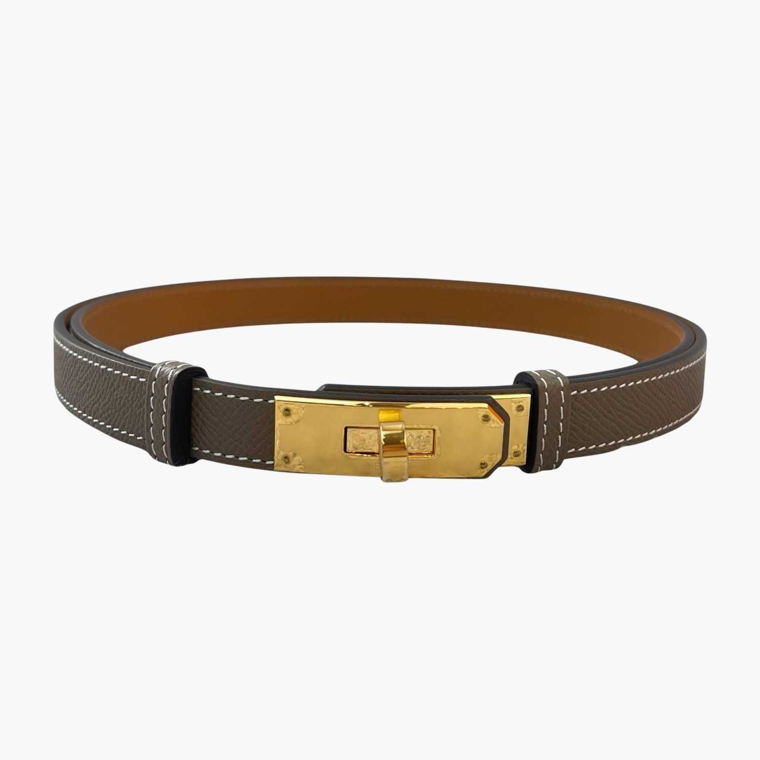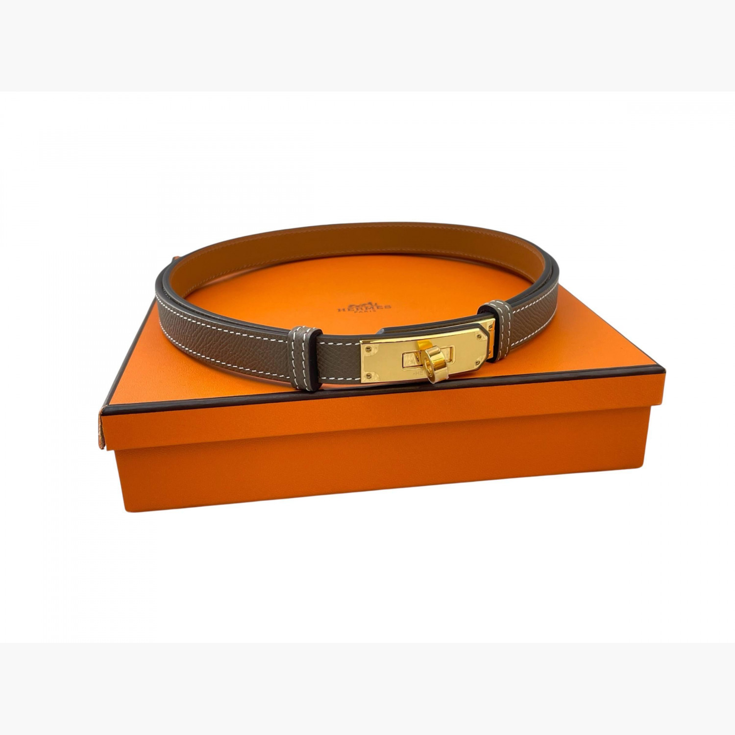 Dark brown leather belt with a metal buckle featuring a gold-tone Kelly lock.The size is adjustable.Absolutely new.