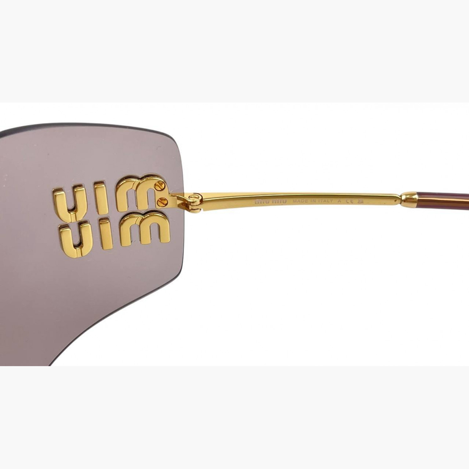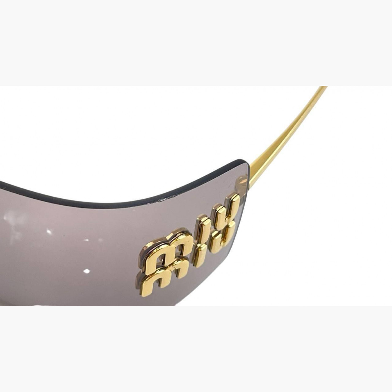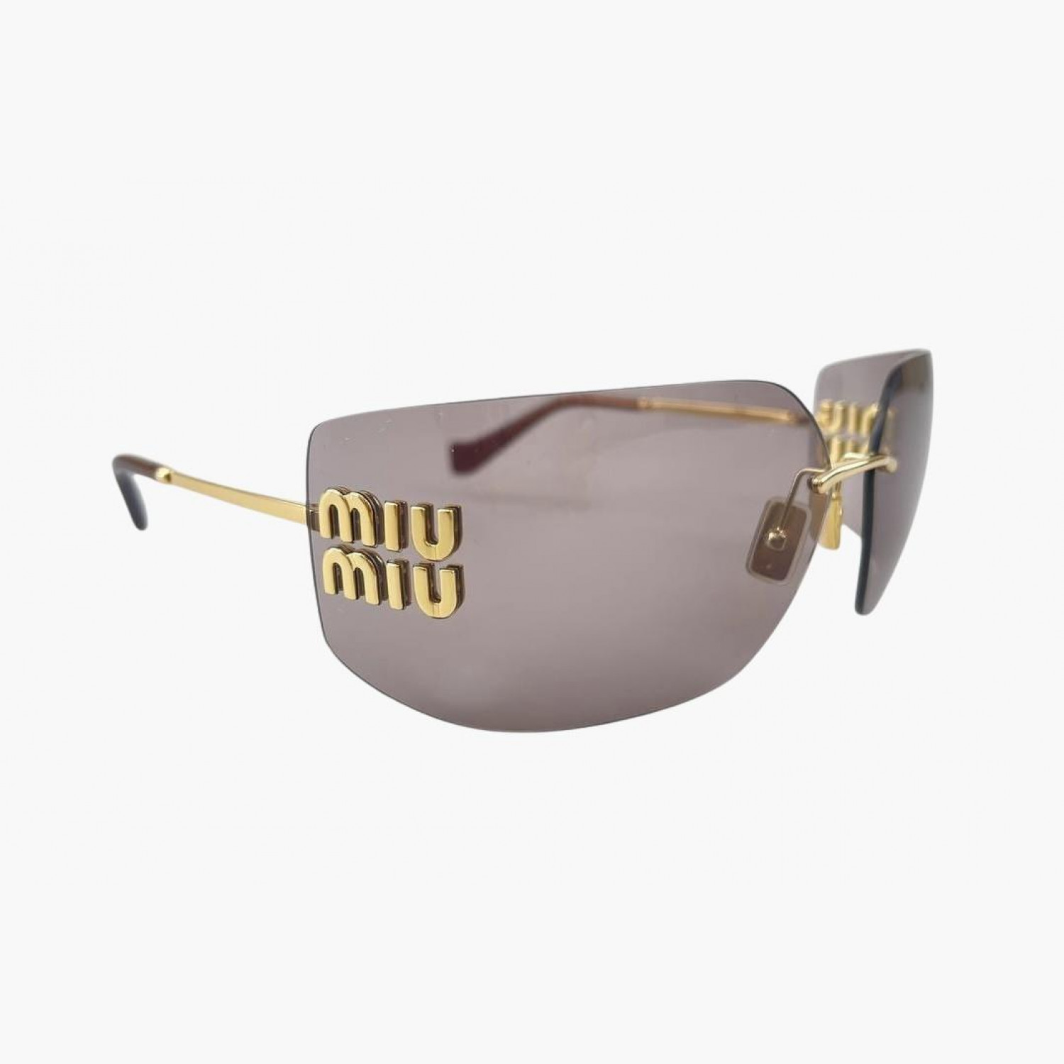 Purple rimless sunglasses with gold temples and logo on the lenses. Comes with a microfiber cloth. In excellent condition, no wear marks.