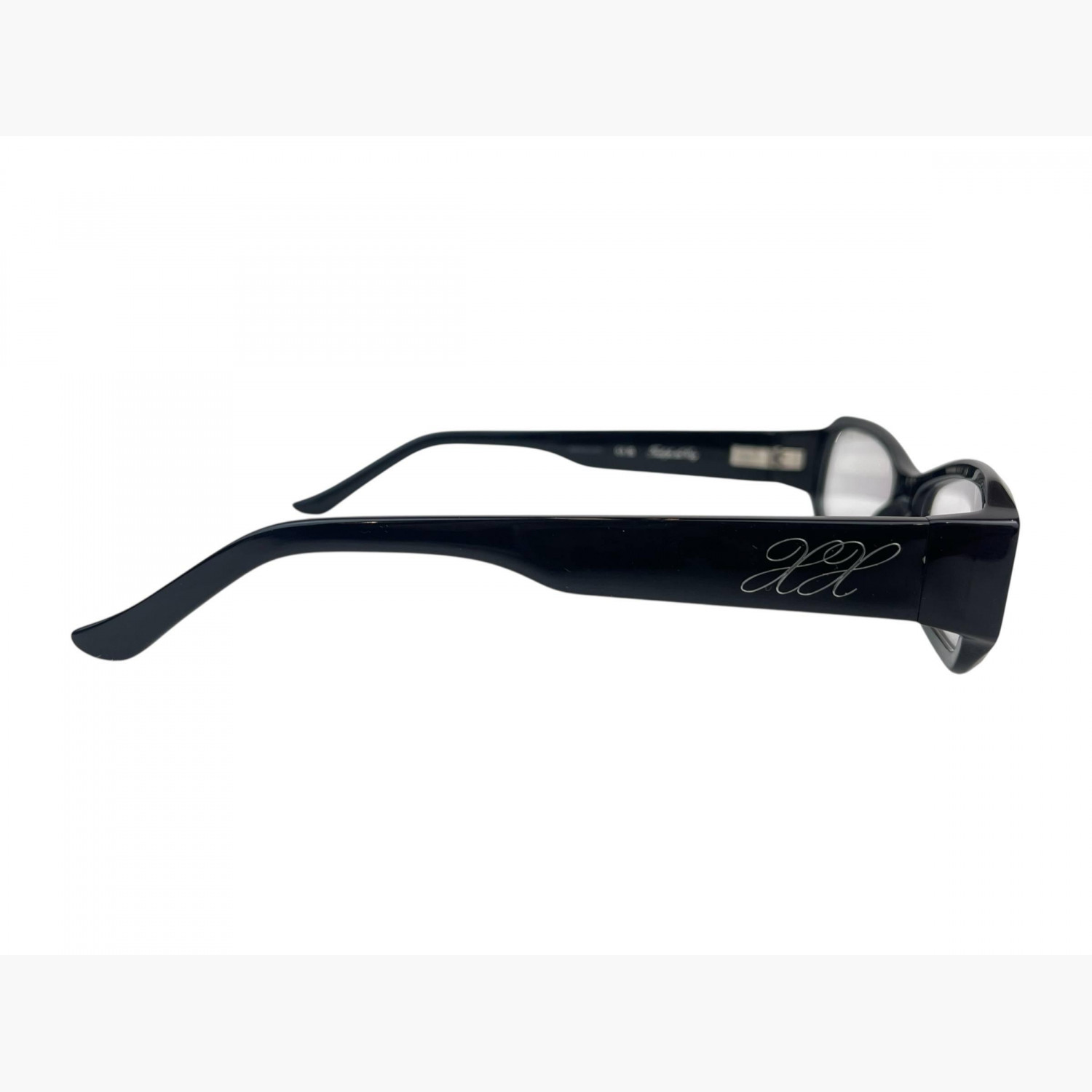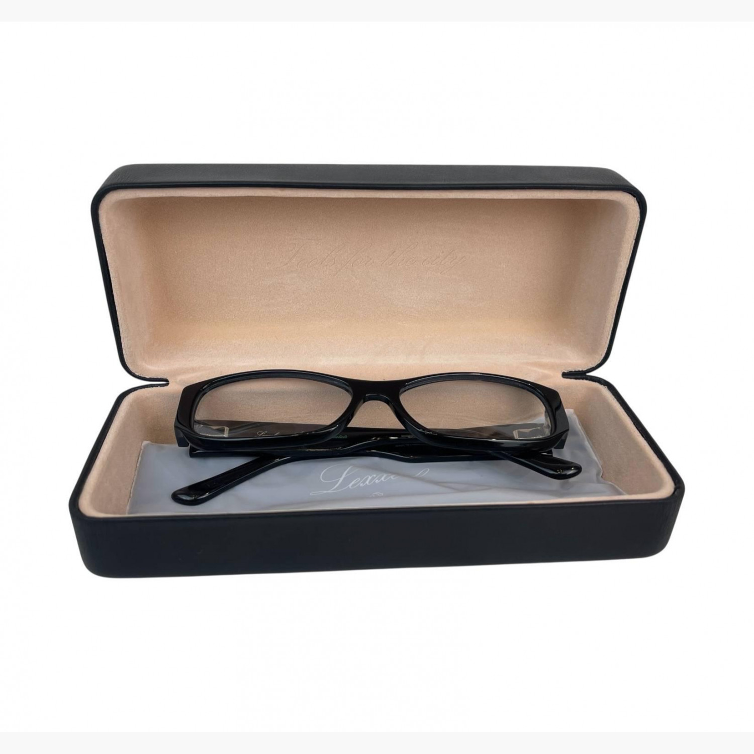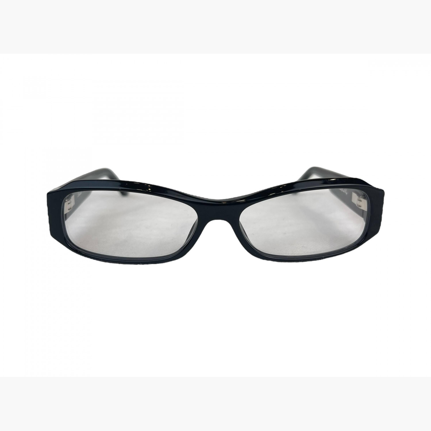 Narrow black plastic glasses with clear rectangular lenses. The set includes a branded case and a cleaning cloth.In excellent condition, with no signs of wear.