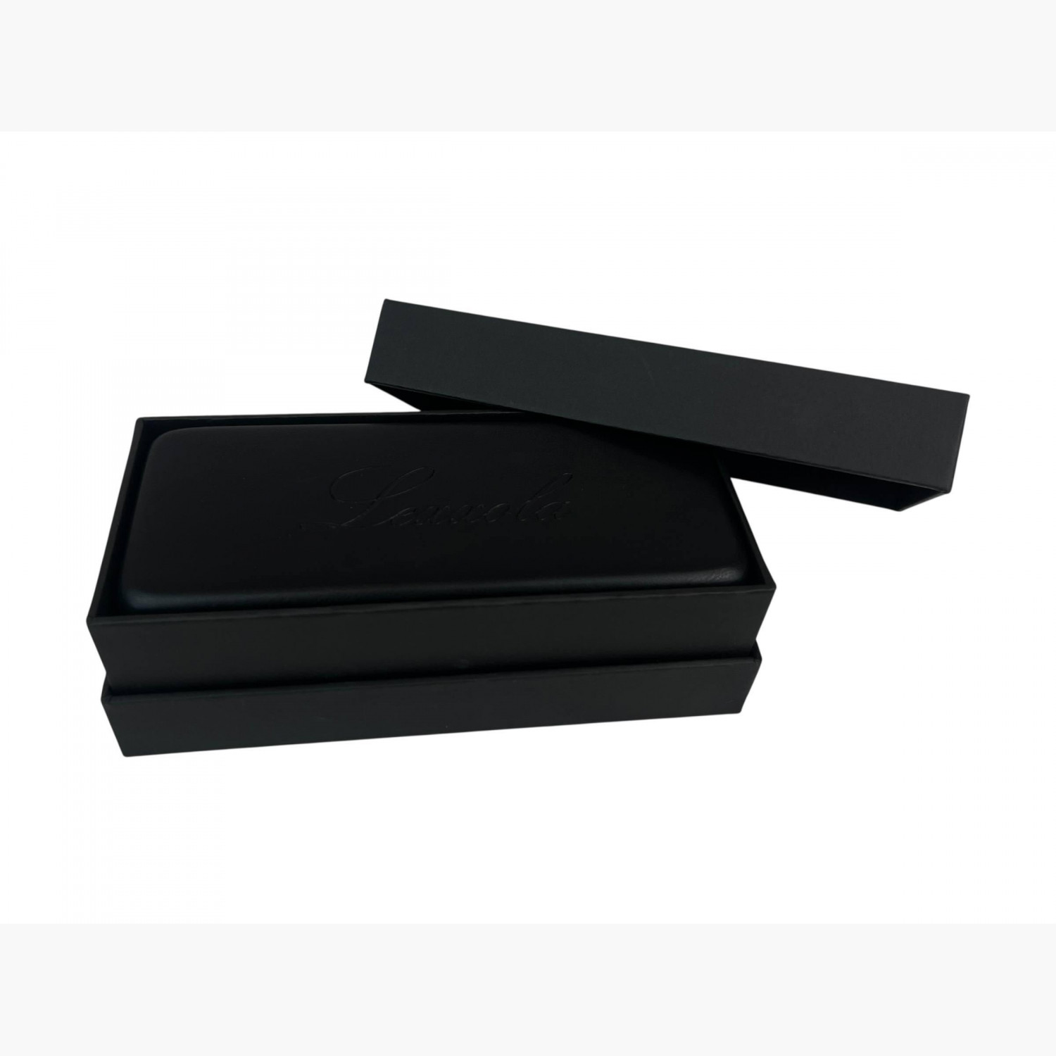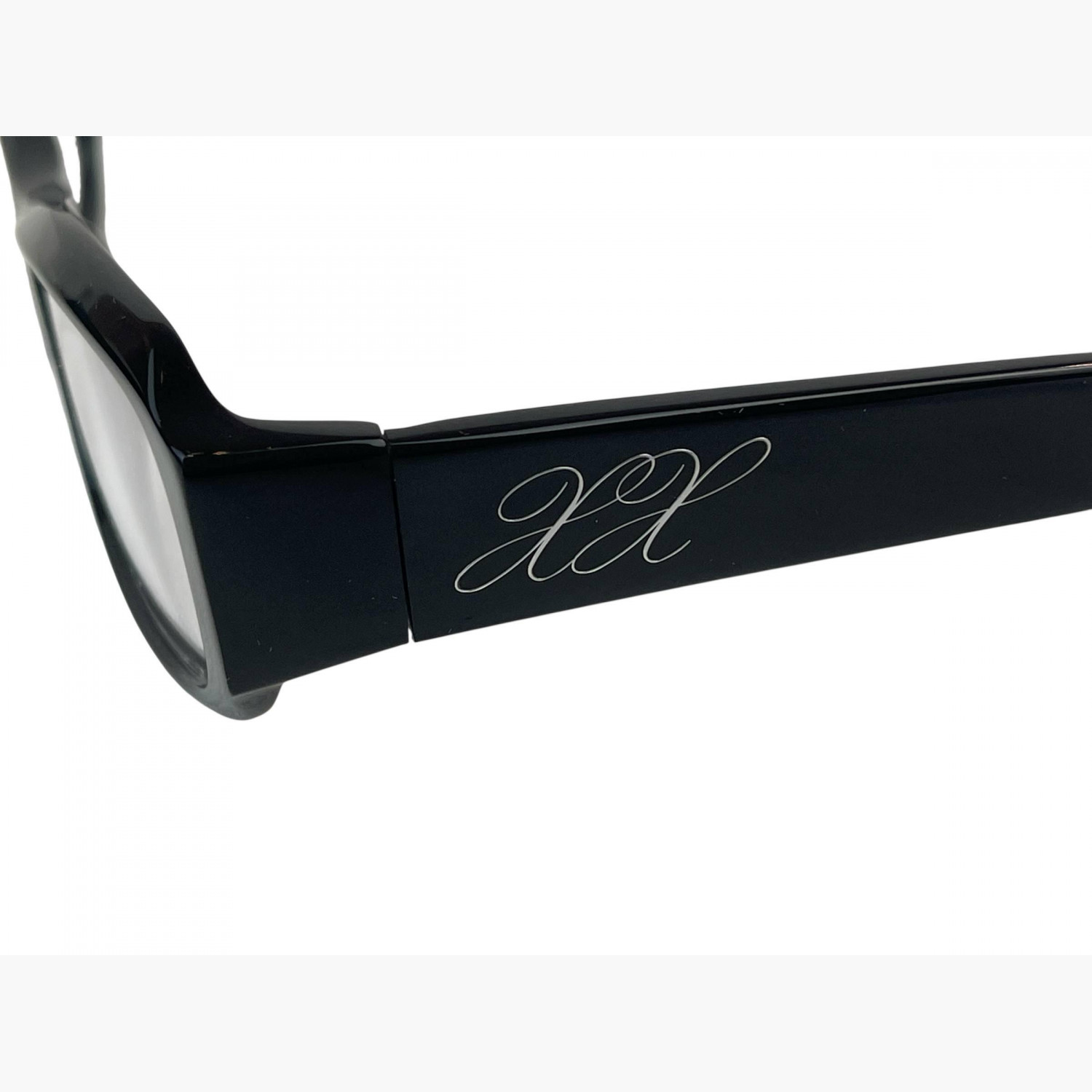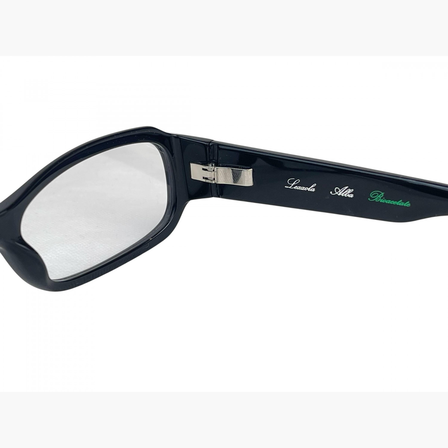 Narrow black plastic glasses with clear rectangular lenses. The set includes a branded case and a cleaning cloth.In excellent condition, with no signs of wear.