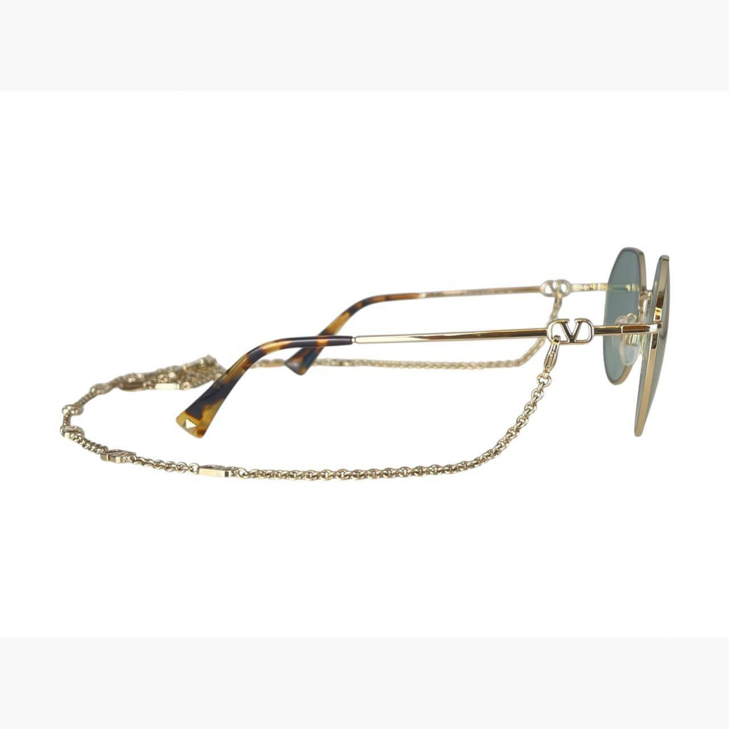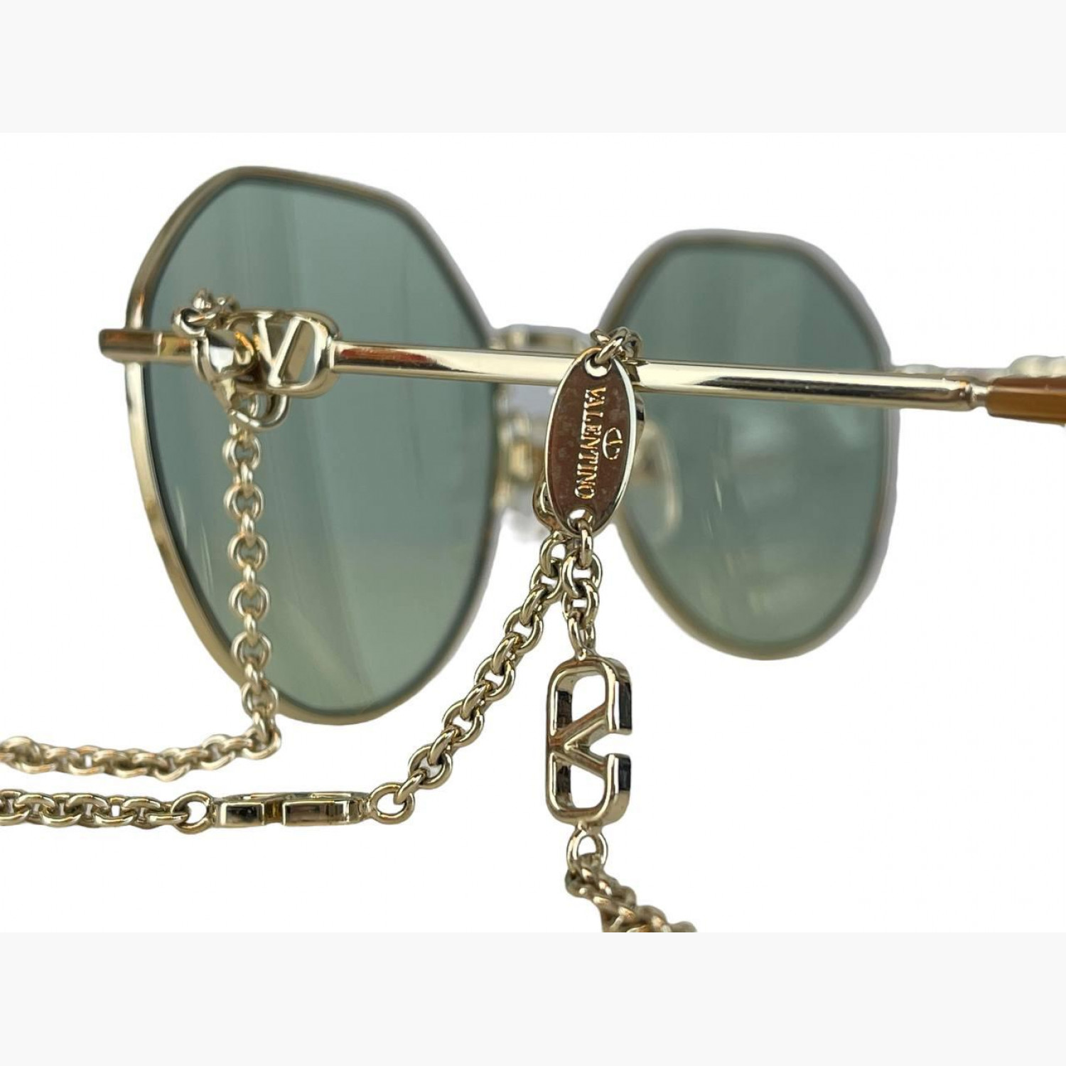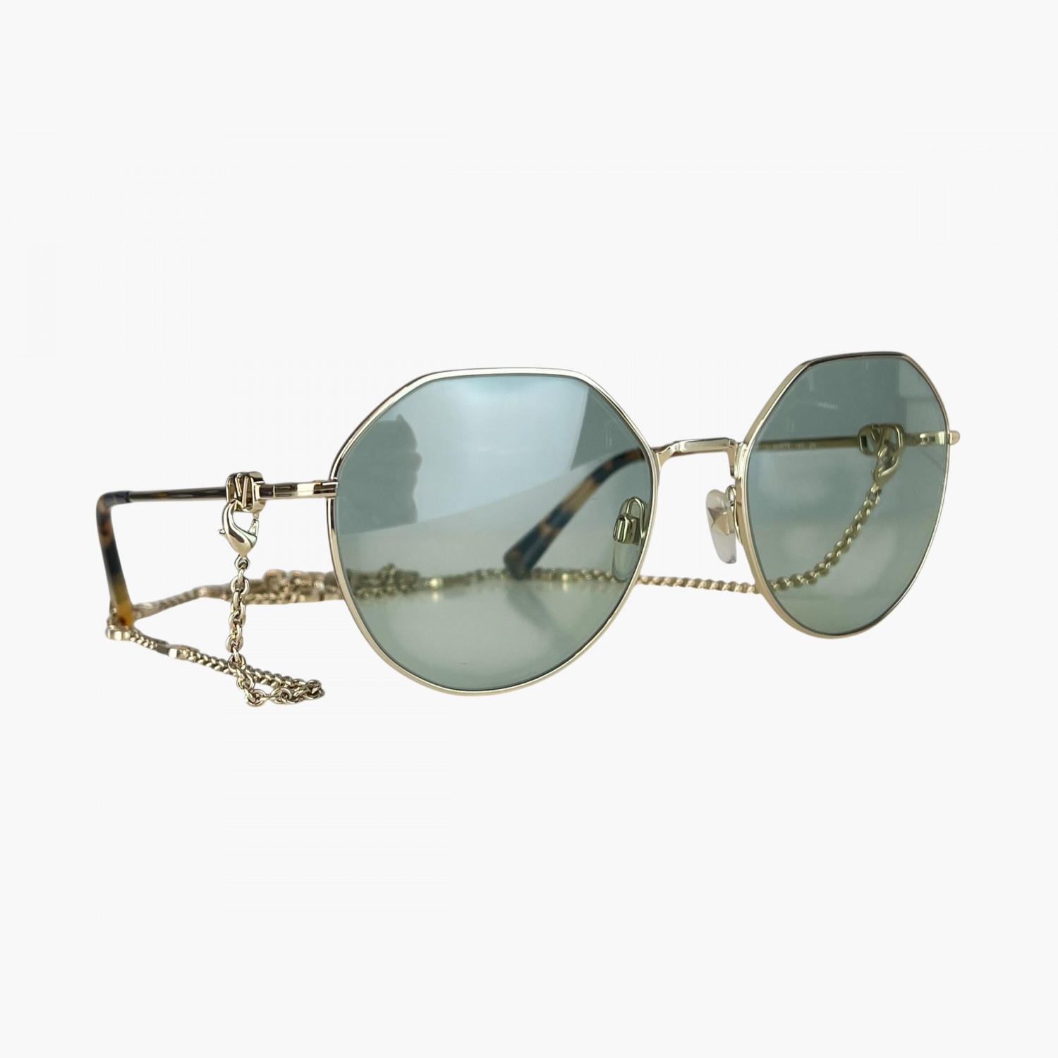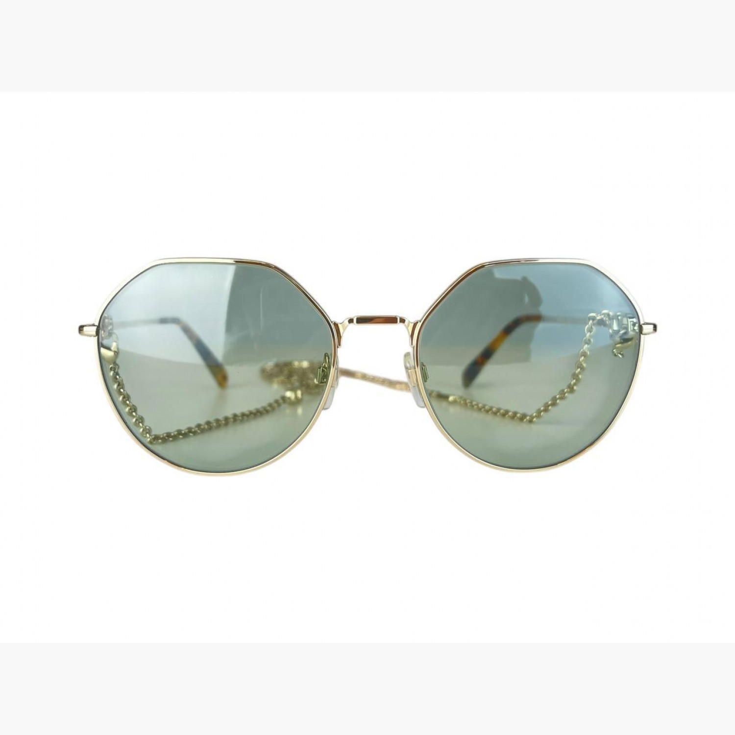 Blue sunglasses with a metal frame, thin temples, and a gold logo chain. Comes with the original case. In excellent condition, without significant wear marks.