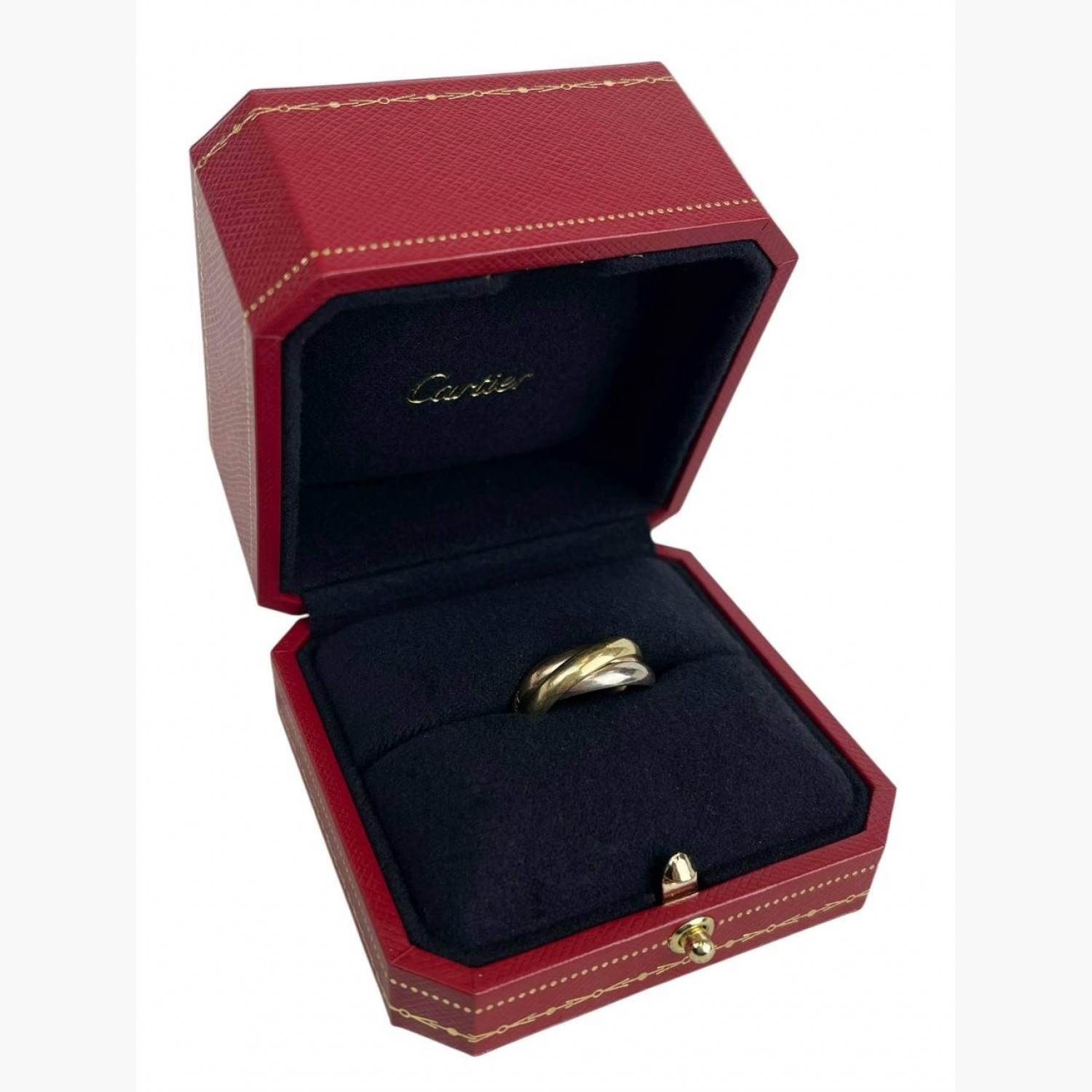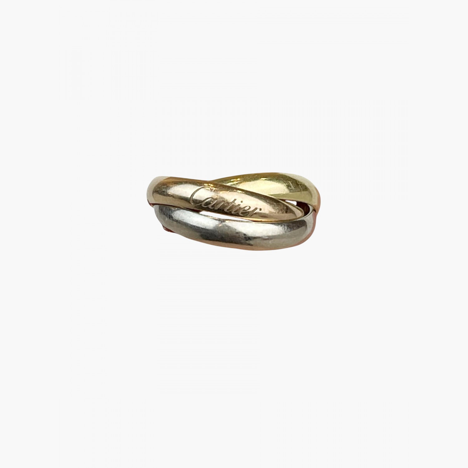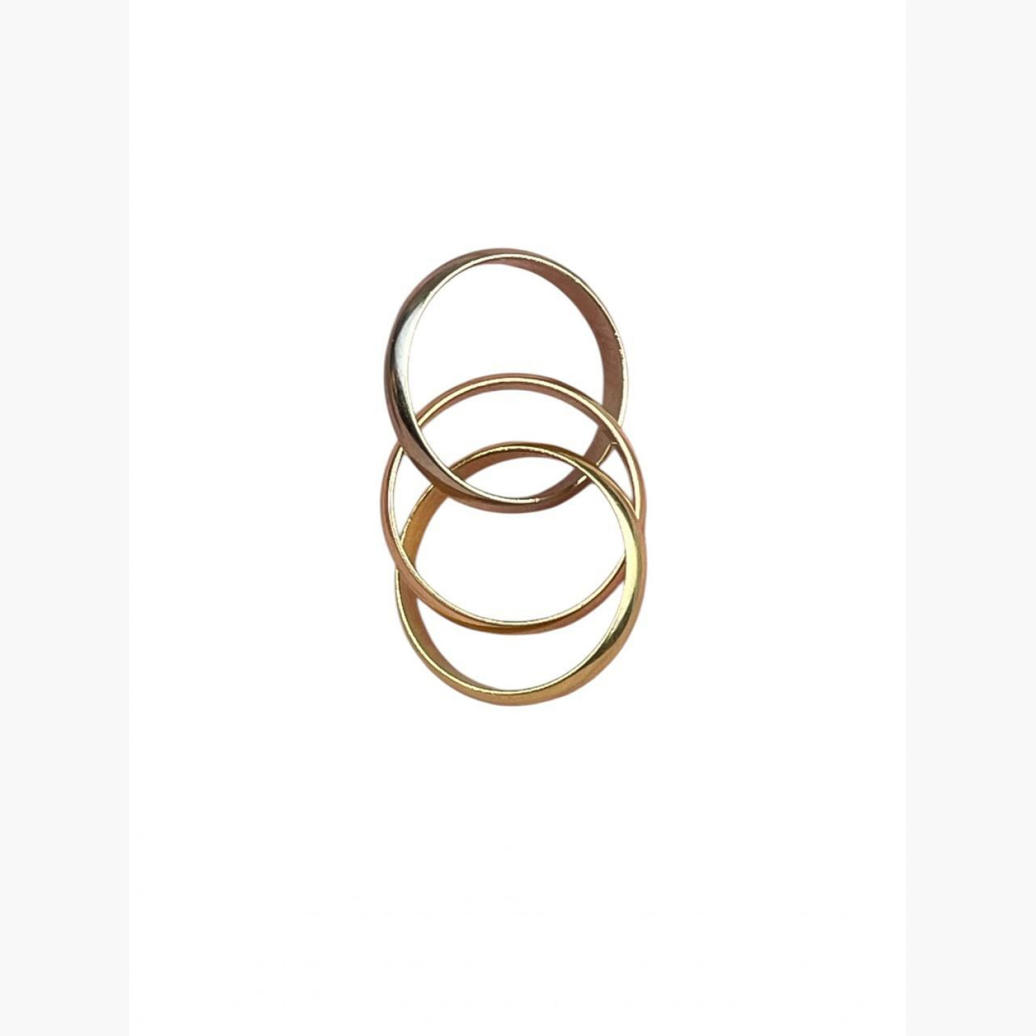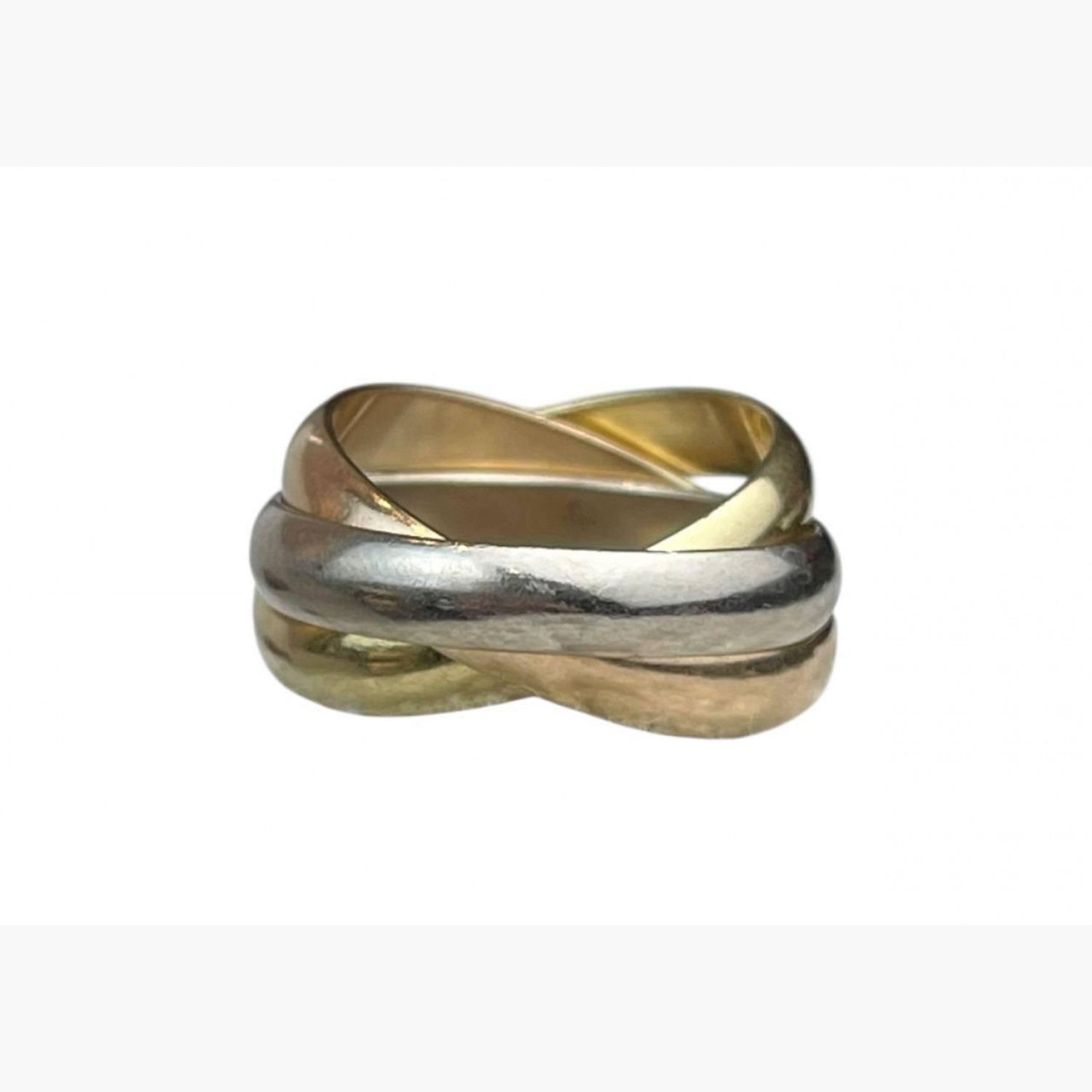 Gold ring made of three interwoven bands, crafted from three types of gold: yellow, rose, and white. Size 52. In good condition, with wear marks.