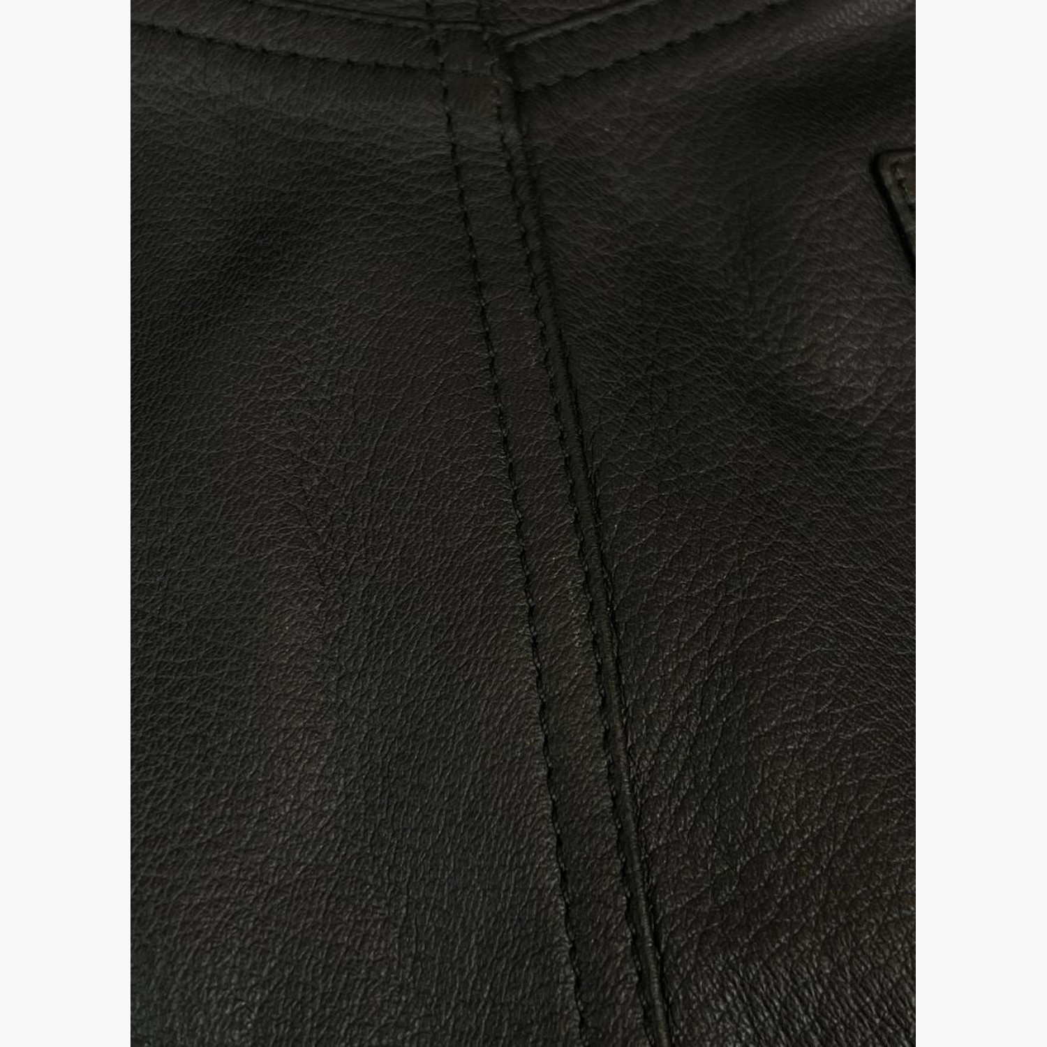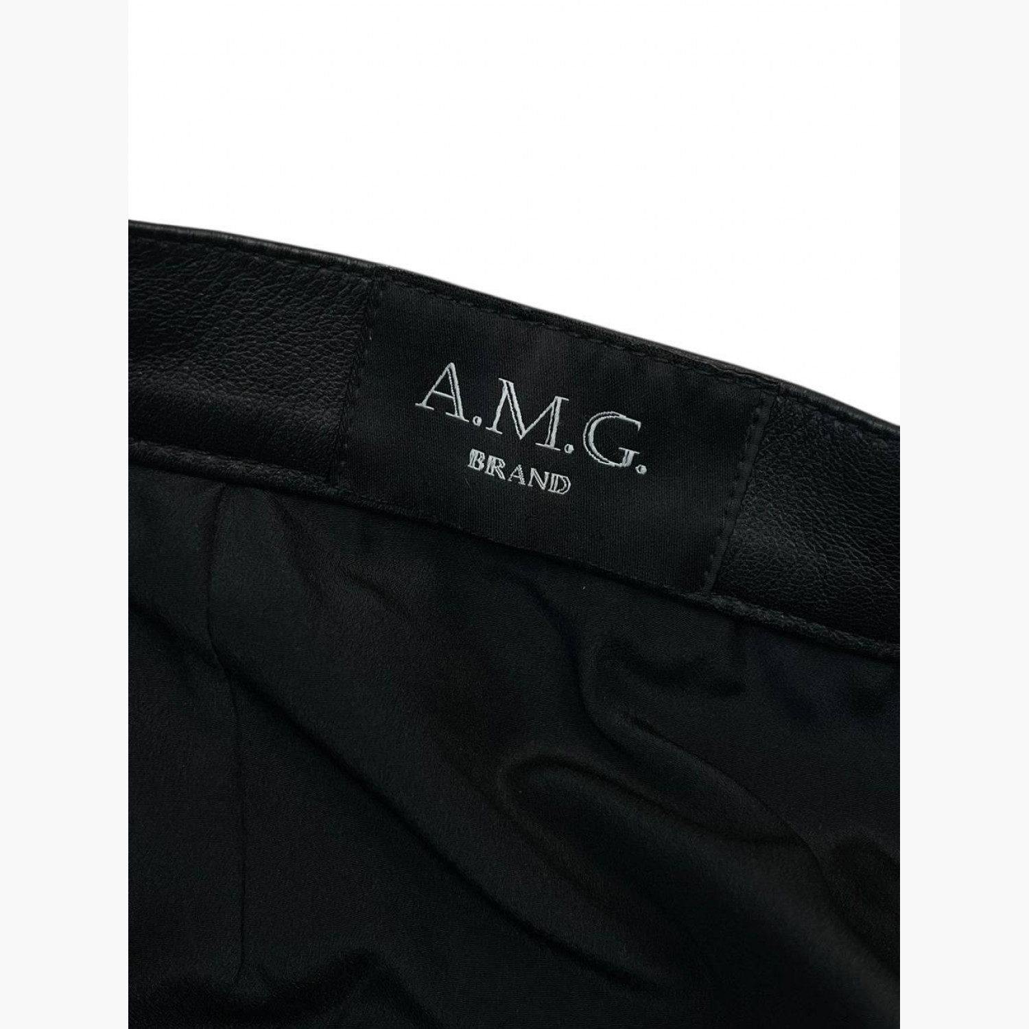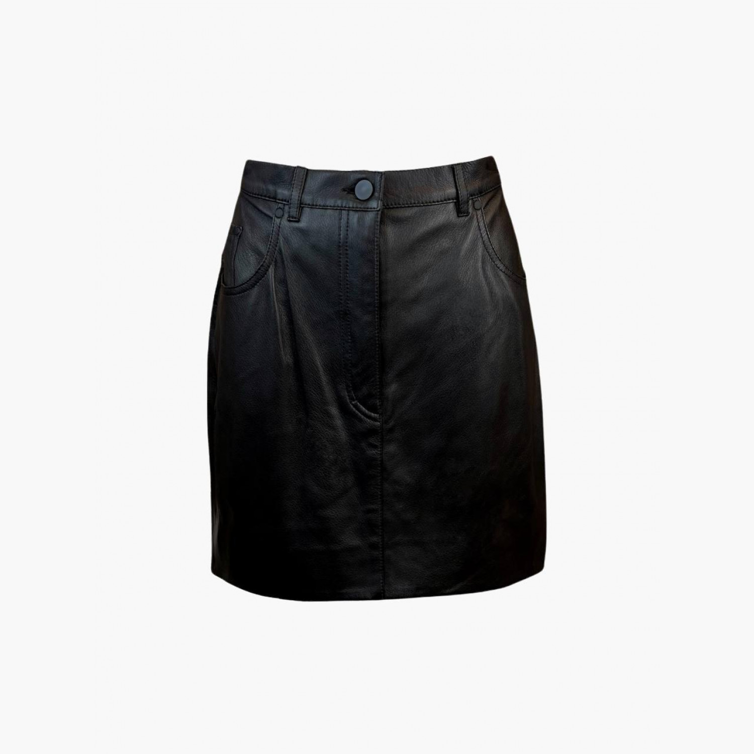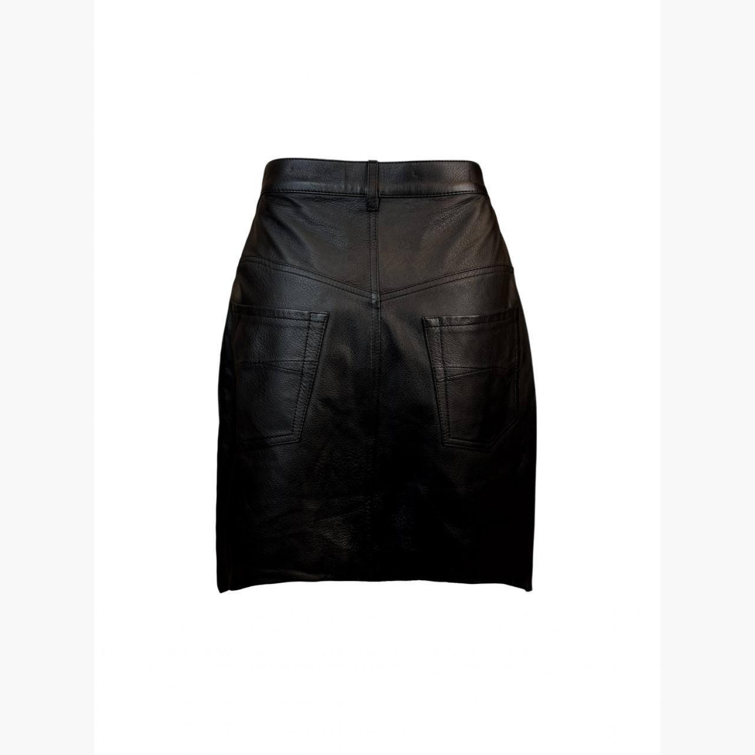 Black leather mini skirt. In good condition, size tag missing, with barely noticeable wear marks.