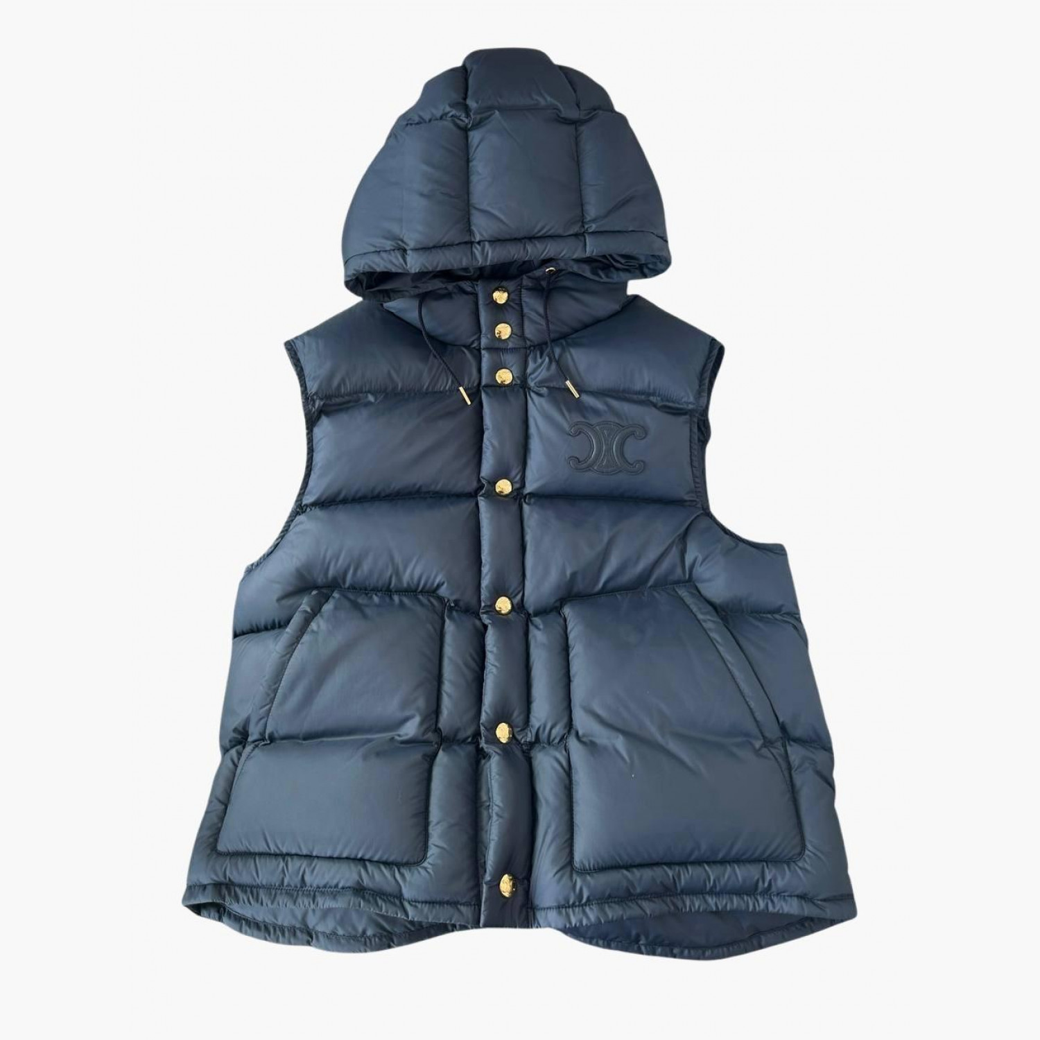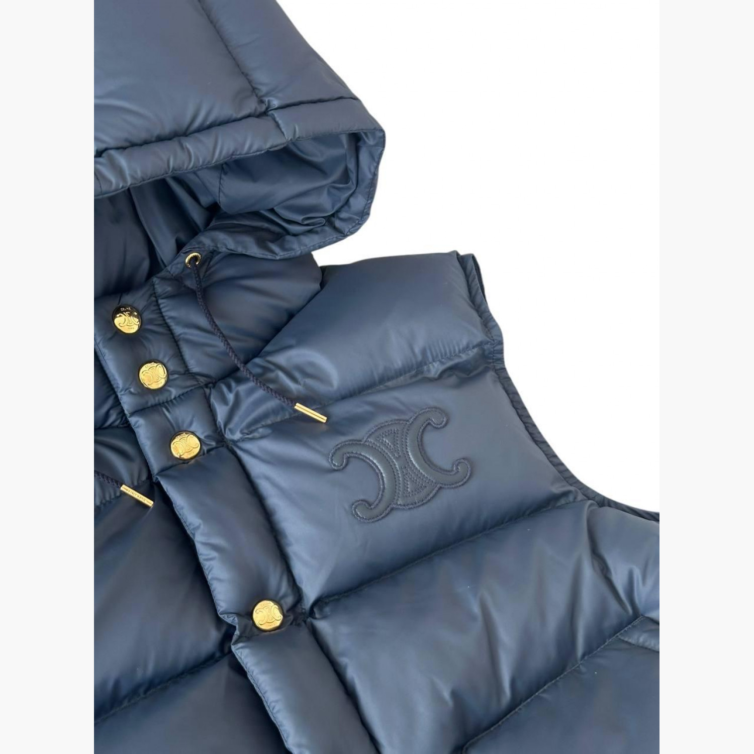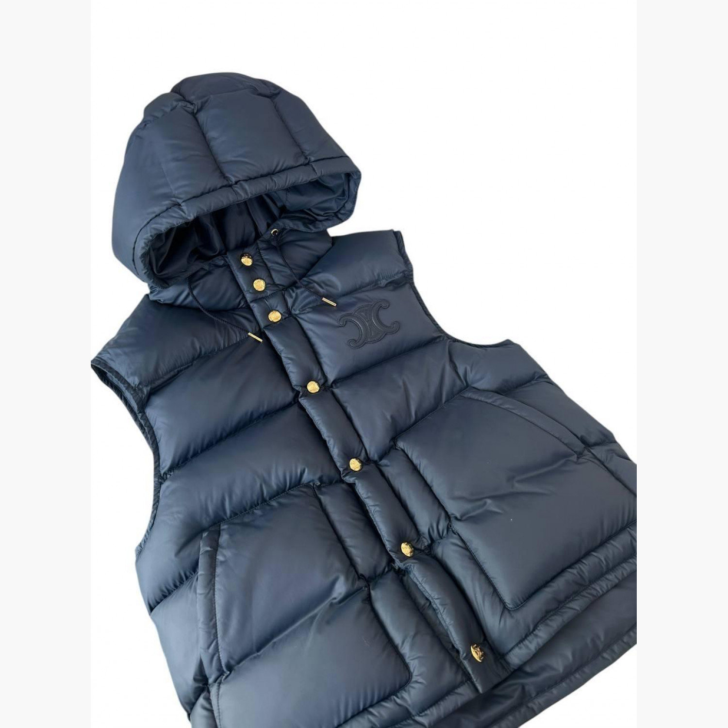 Blue waistcoat with a hood. Absolutely new, with a tag. Composition: 100% polyamide.