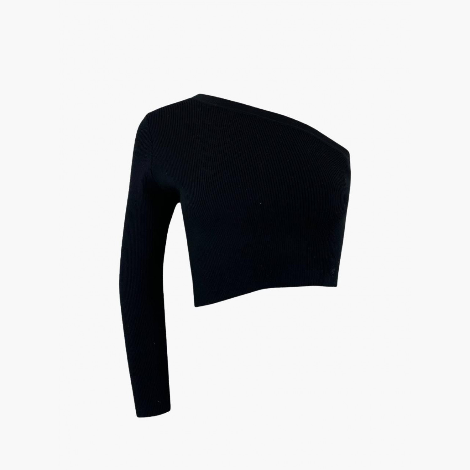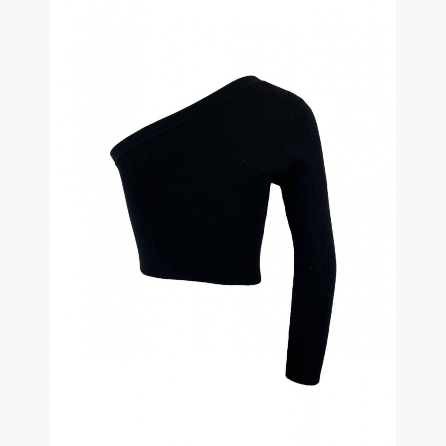 Black fine-knit one-shoulder top with long sleeve. Composition: 80% wool, 19% polyamide, 1% elastane. In excellent condition, no wear marks.