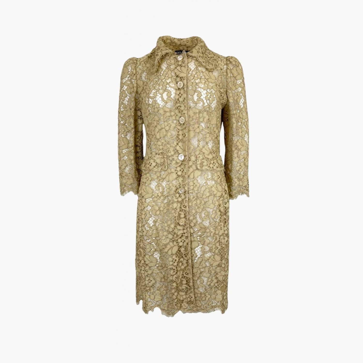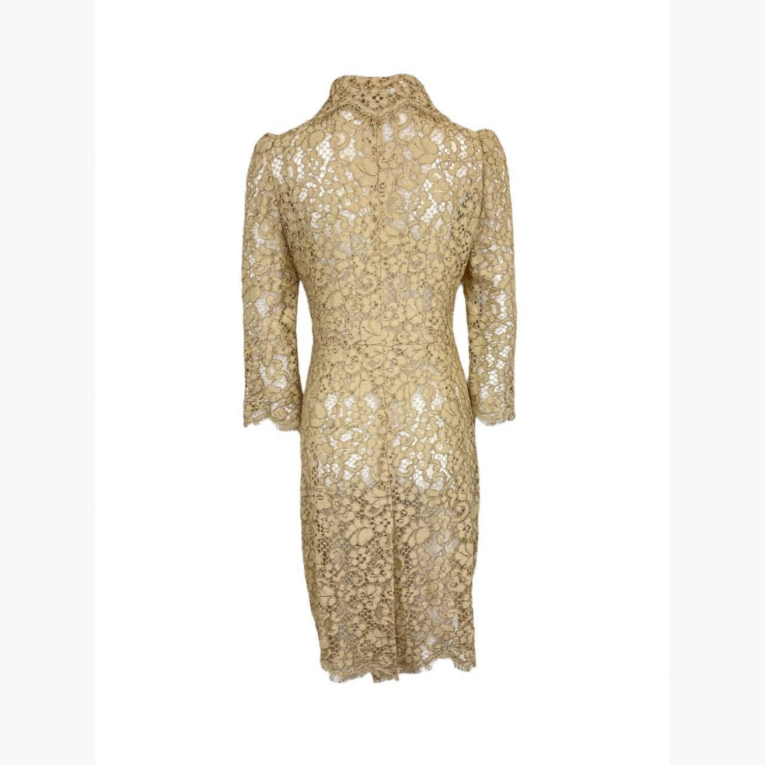 Mustard lace dress with button closure. Composition: main material — 55% cotton, 25% viscose, 20% polyamide; lining — 100% polyamide. In excellent condition, with slight wear marks.