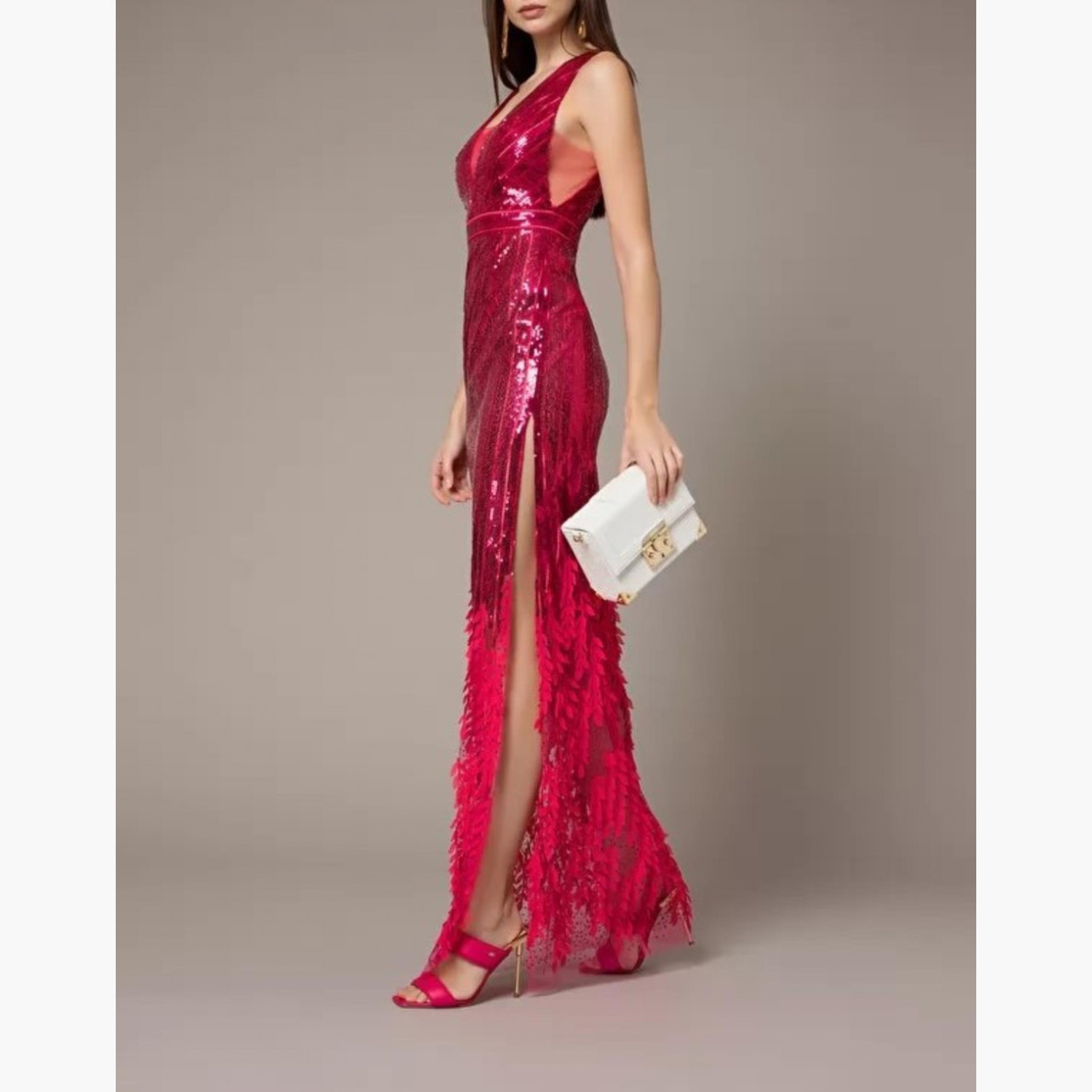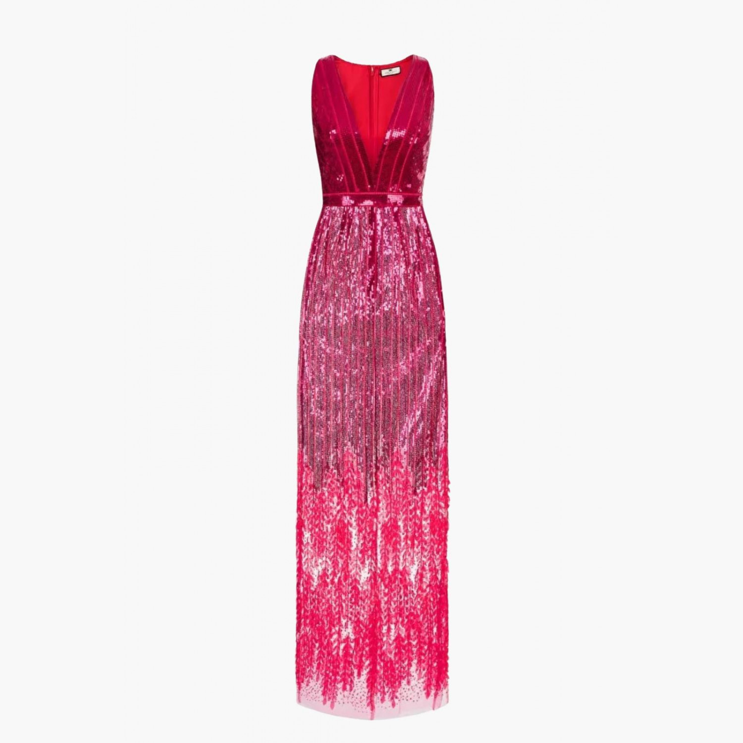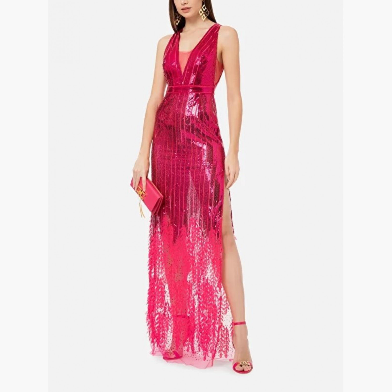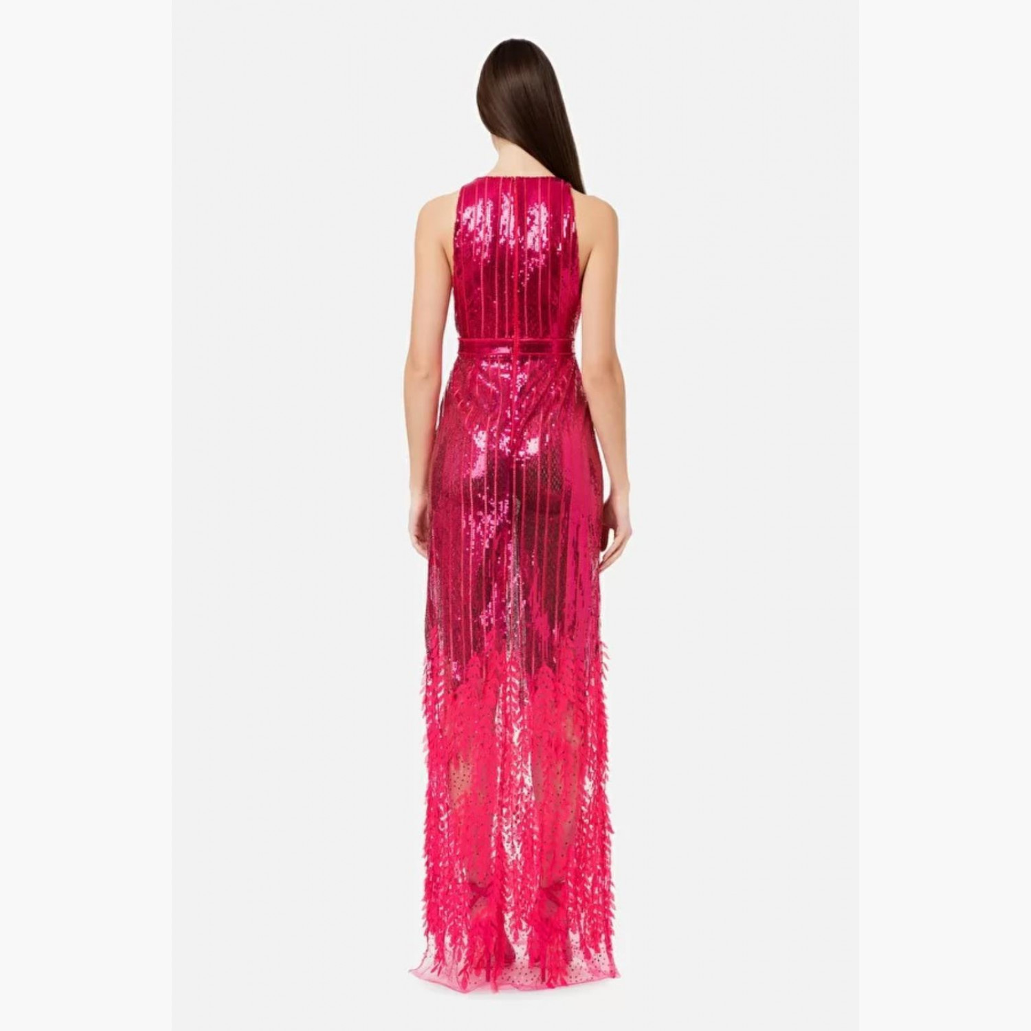 Long pink dress fully embellished with sequins and featuring a tulle hem.