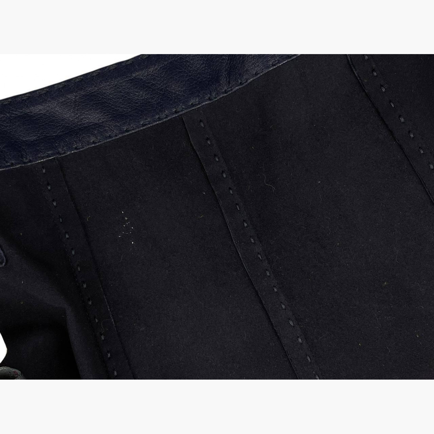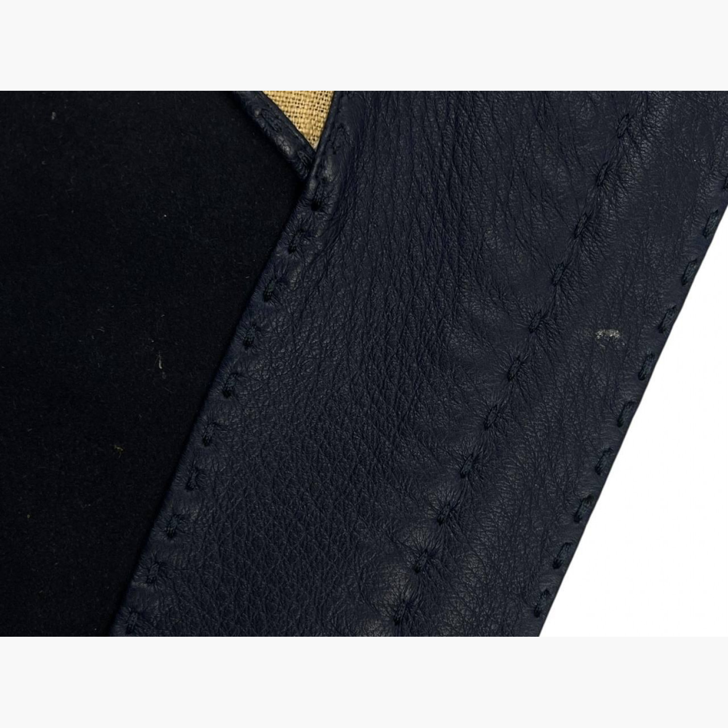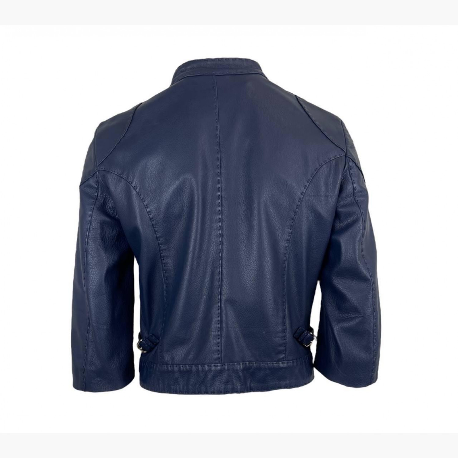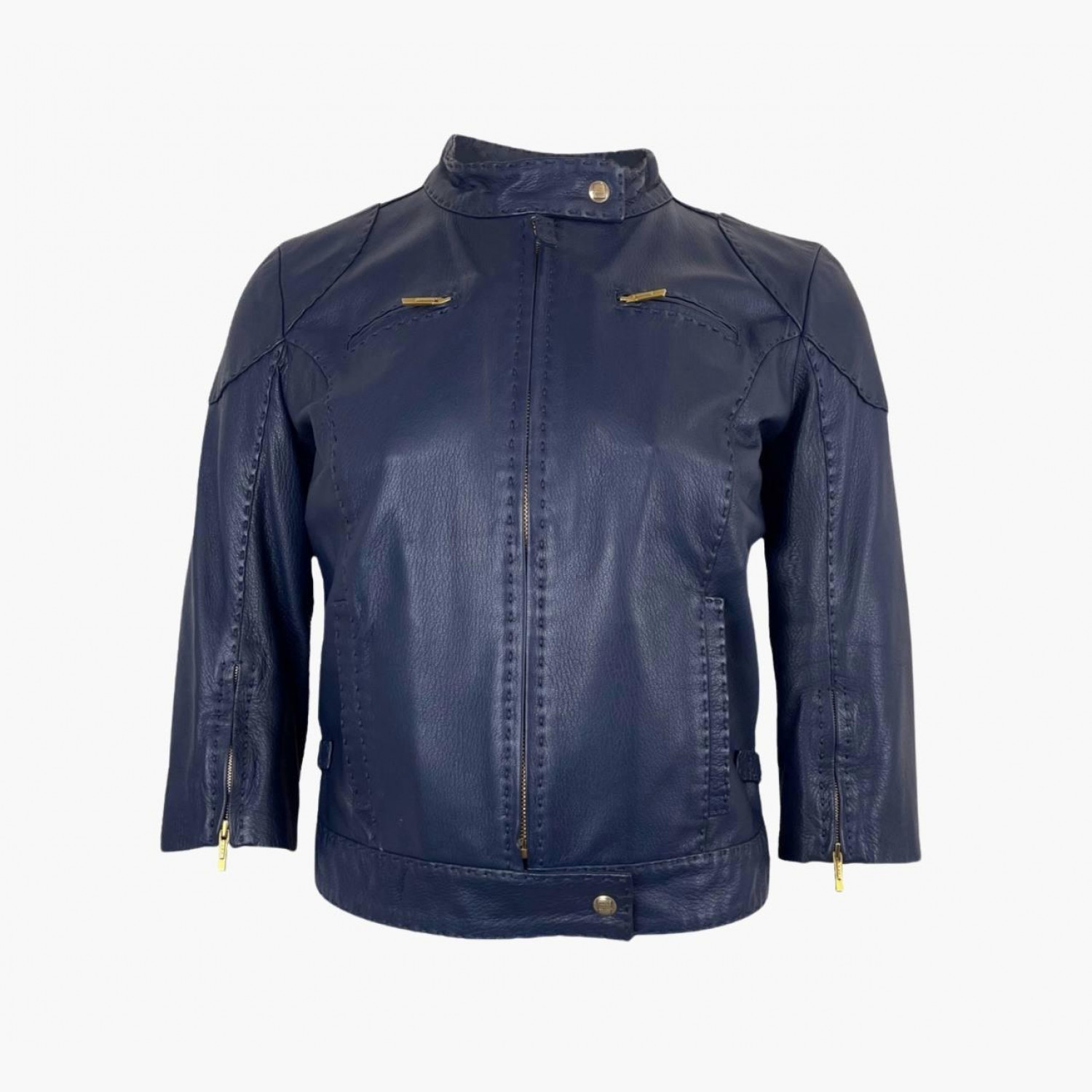 Blue cropped jacket with three-quarter sleeves. Composition: main material — 100% natural leather; lining — 100% linen. In good condition with wear marks.
