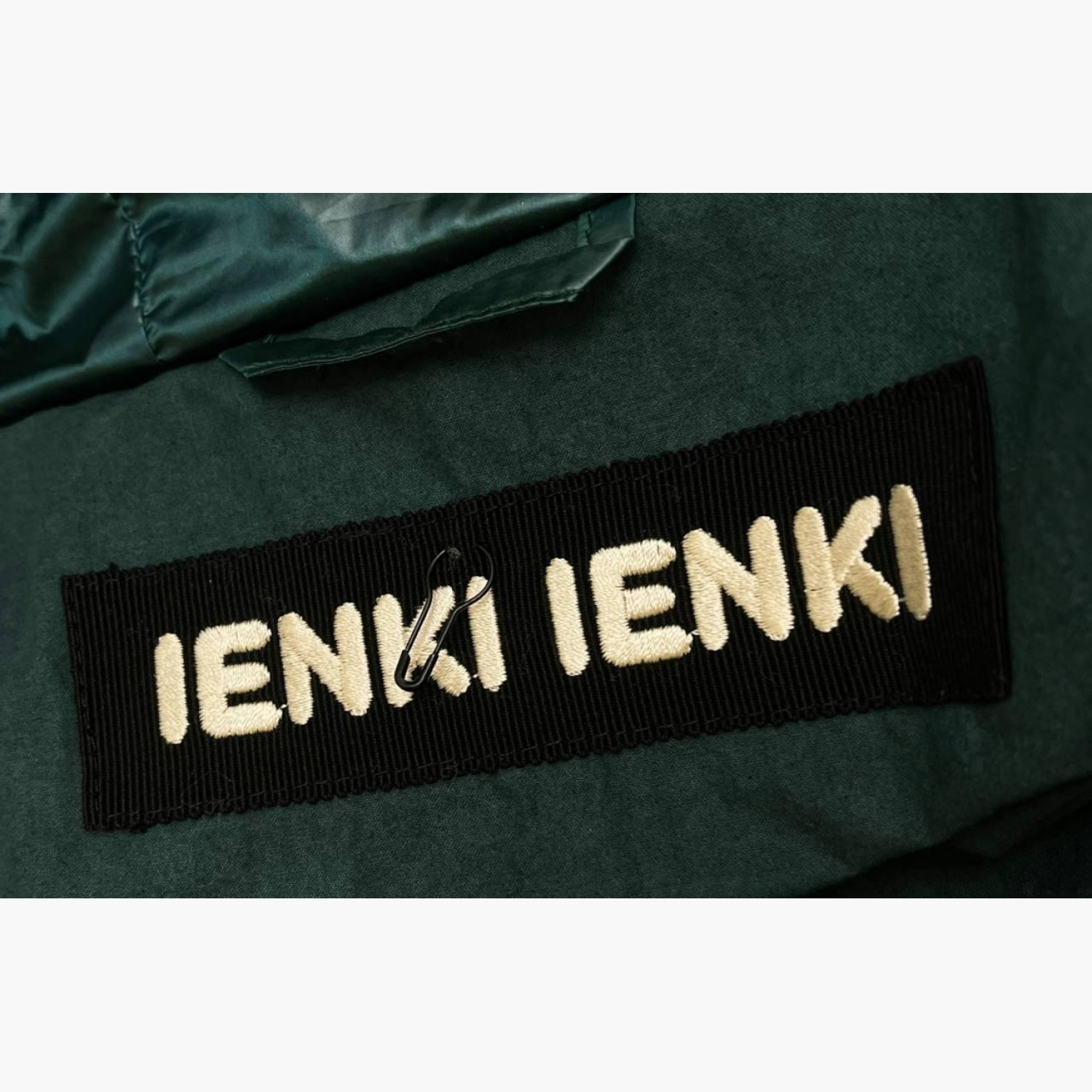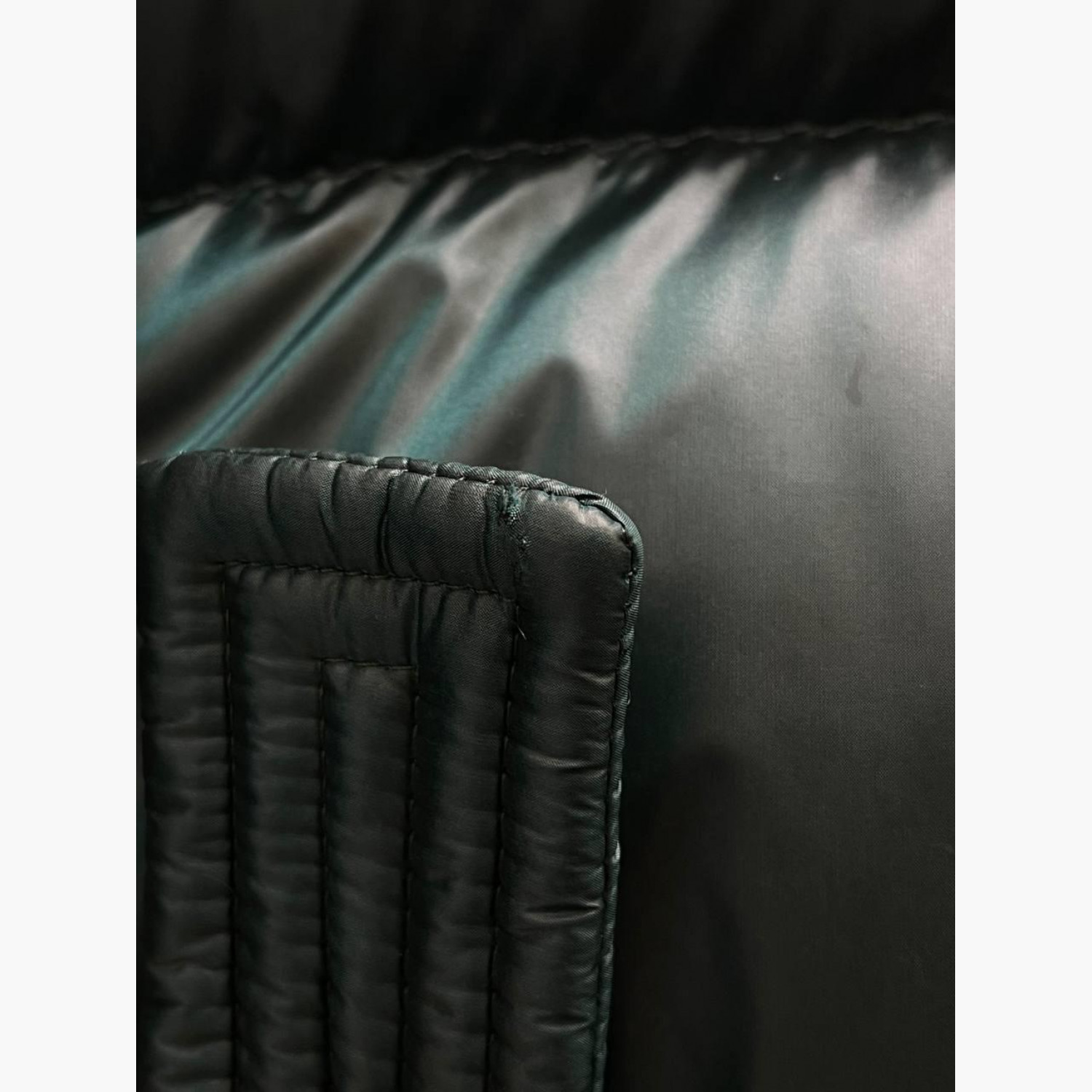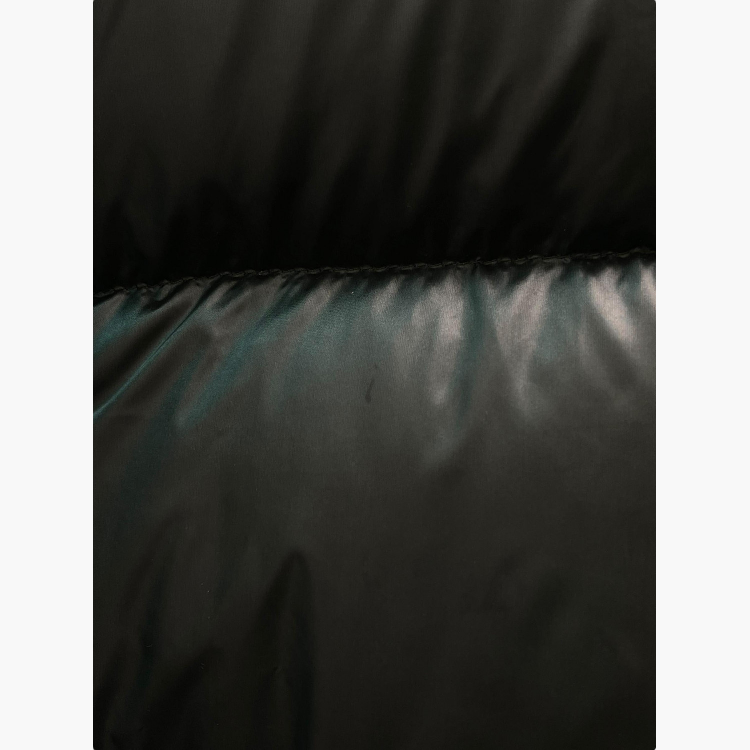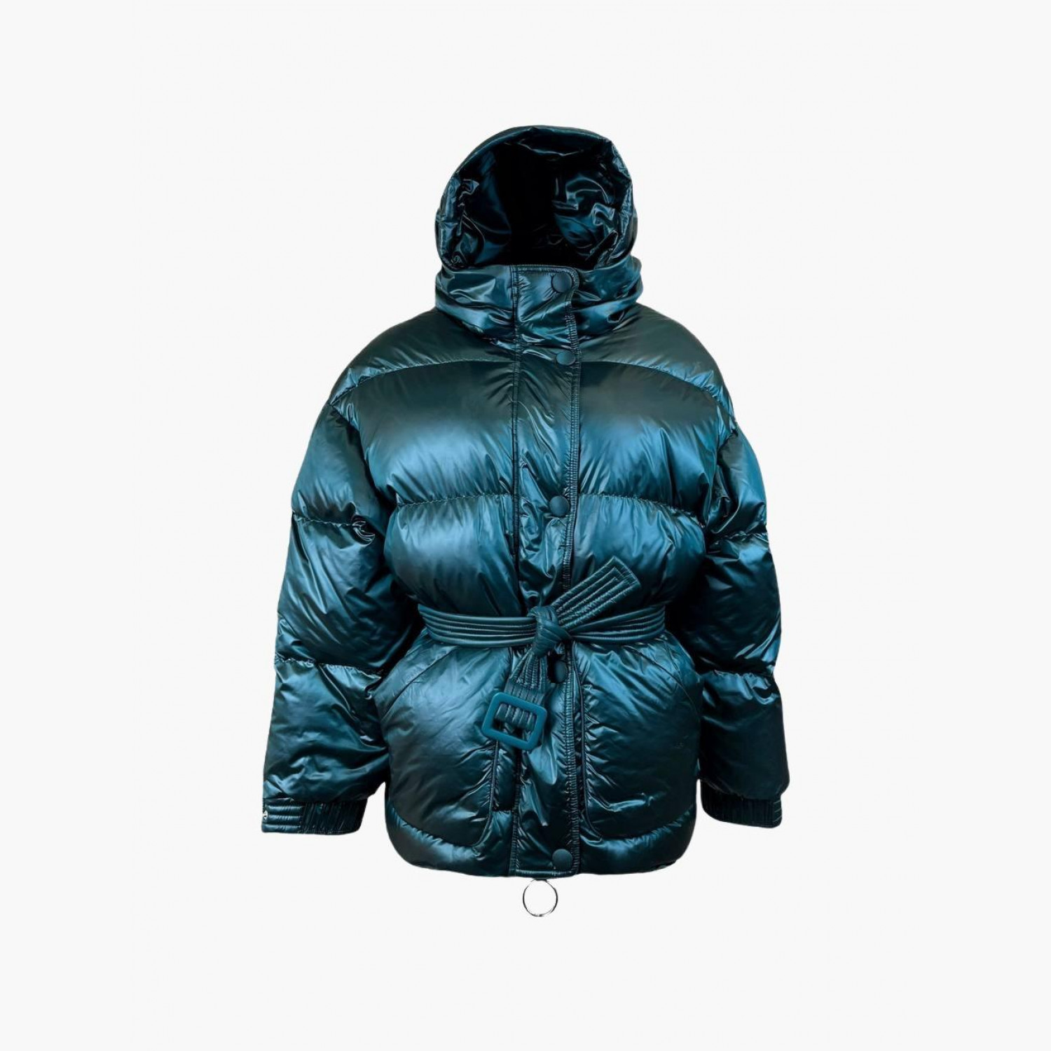 Dark green down jacket with a hood, zip closure, and belt. Composition: outer material — 100% nylon; lining — 100% cotton. In good condition, with wear marks.