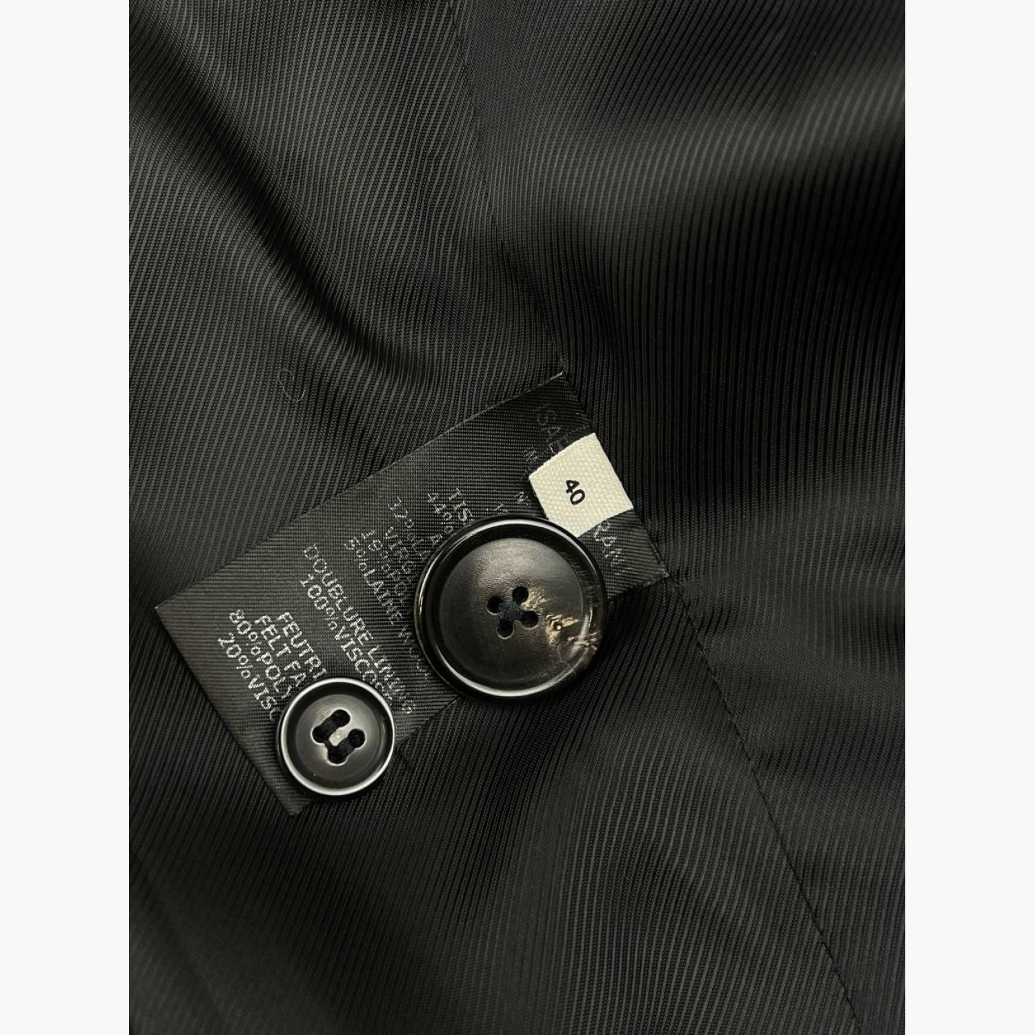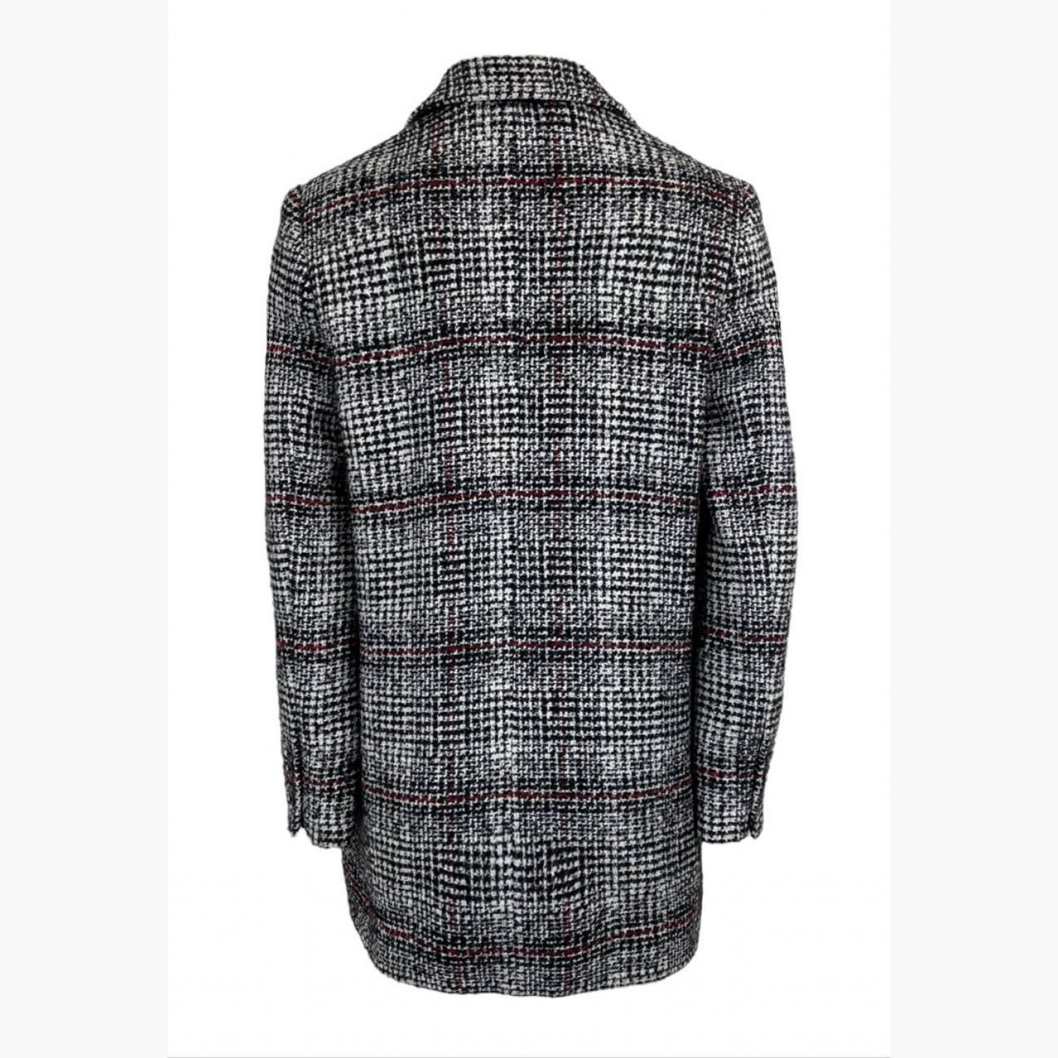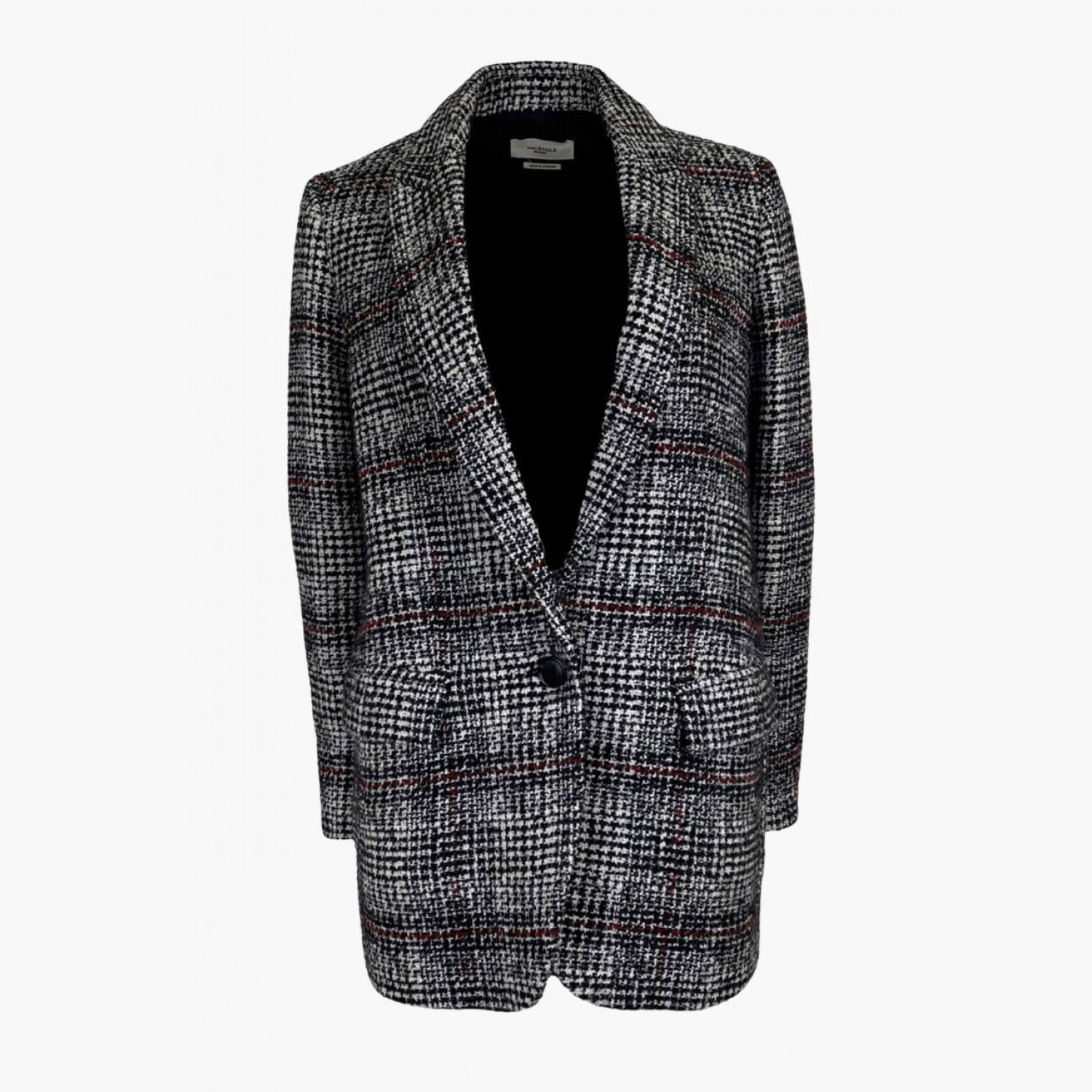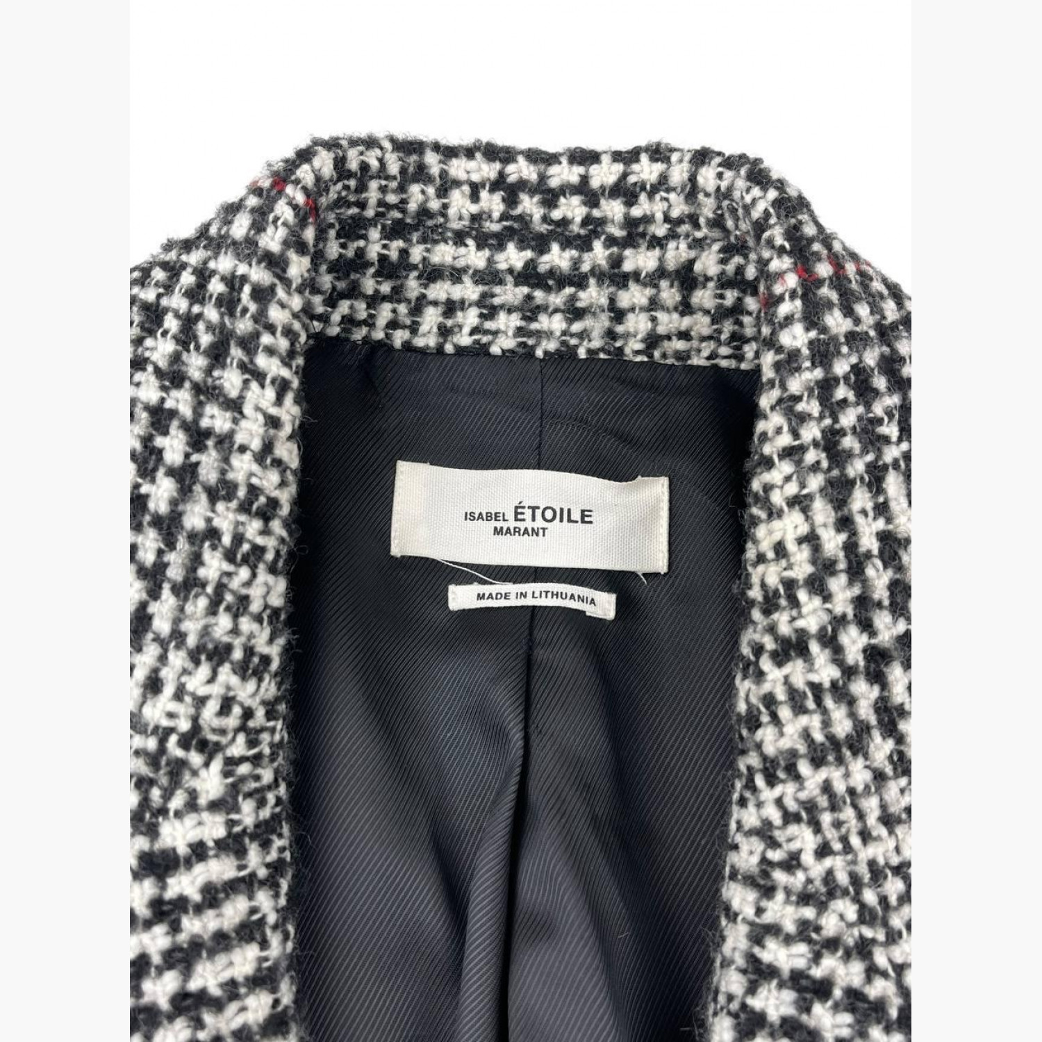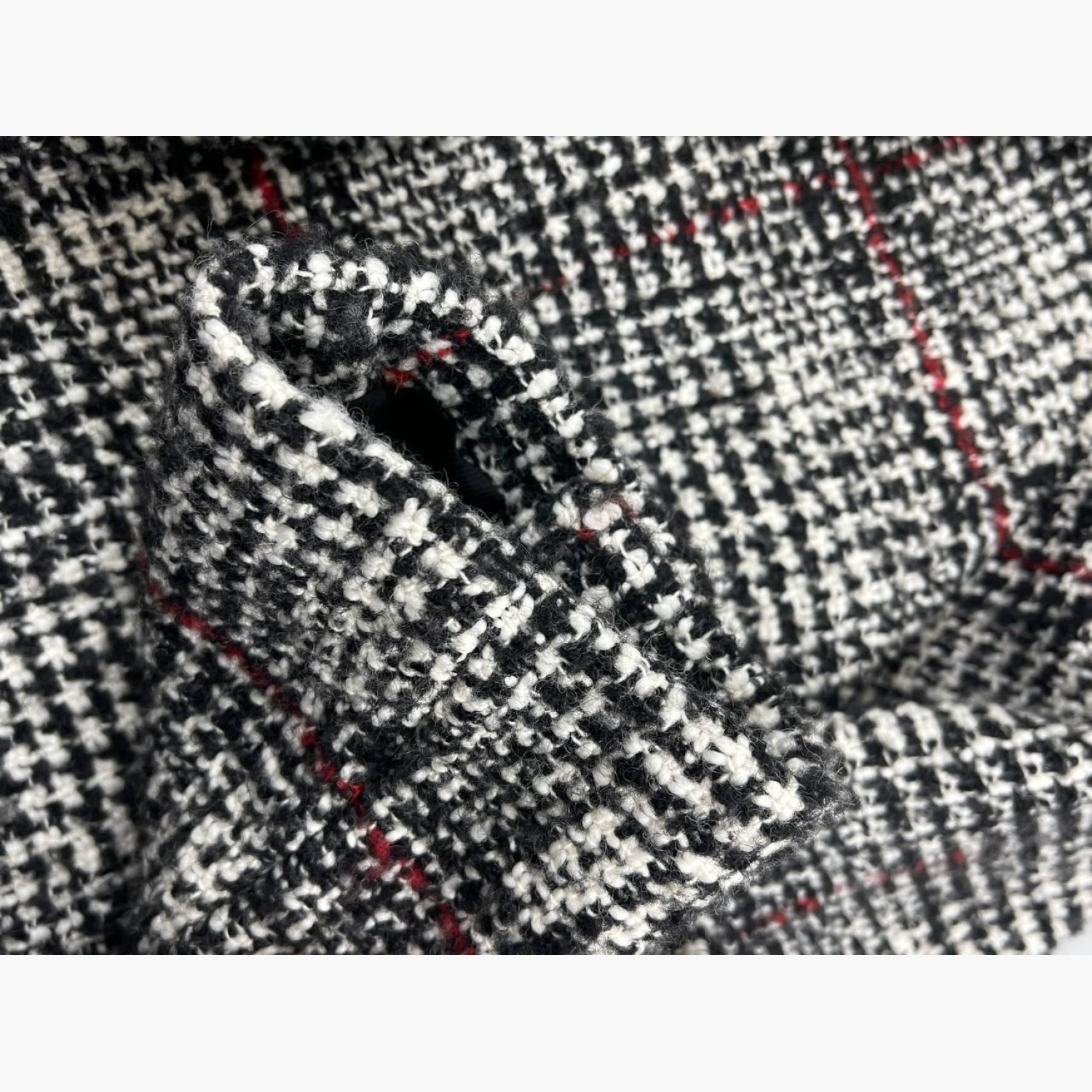 Tweed jacket in black, white, and red stripes. Composition: main material — 44% acrylic, 32% wool, 19% polyester, 5% wool; lining — 100% viscose; felt — 80% polyester, 20% viscose. Two spare buttons on the tag. In excellent condition, minor wear marks inside.