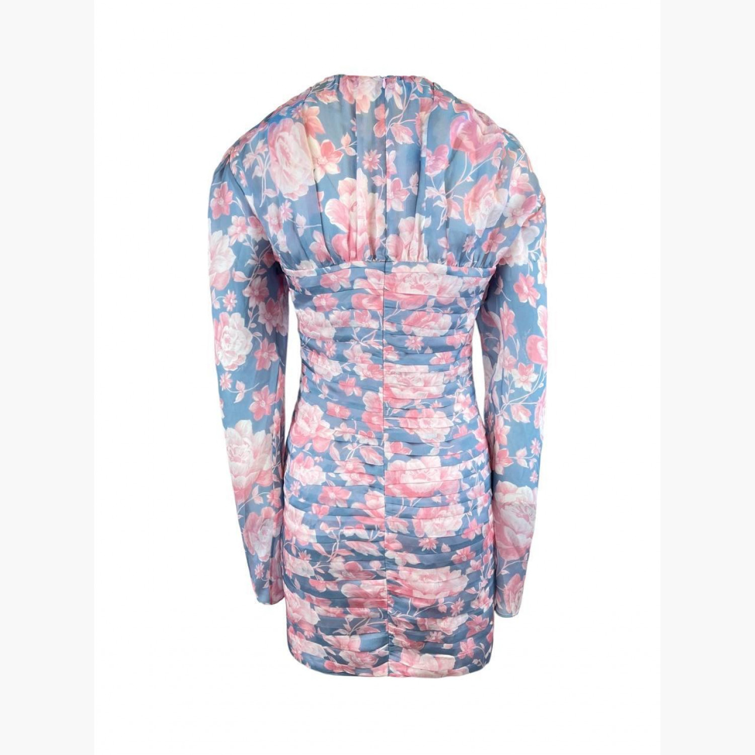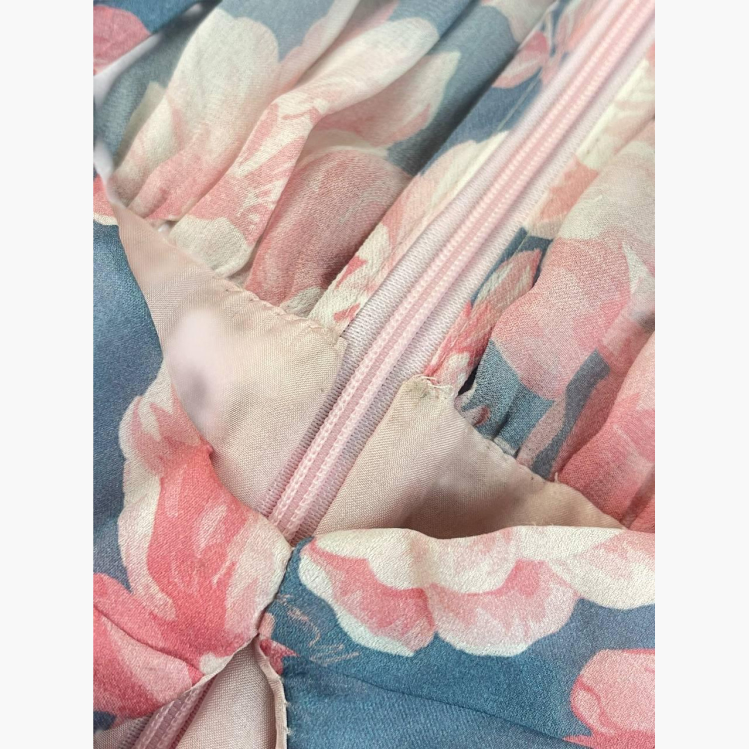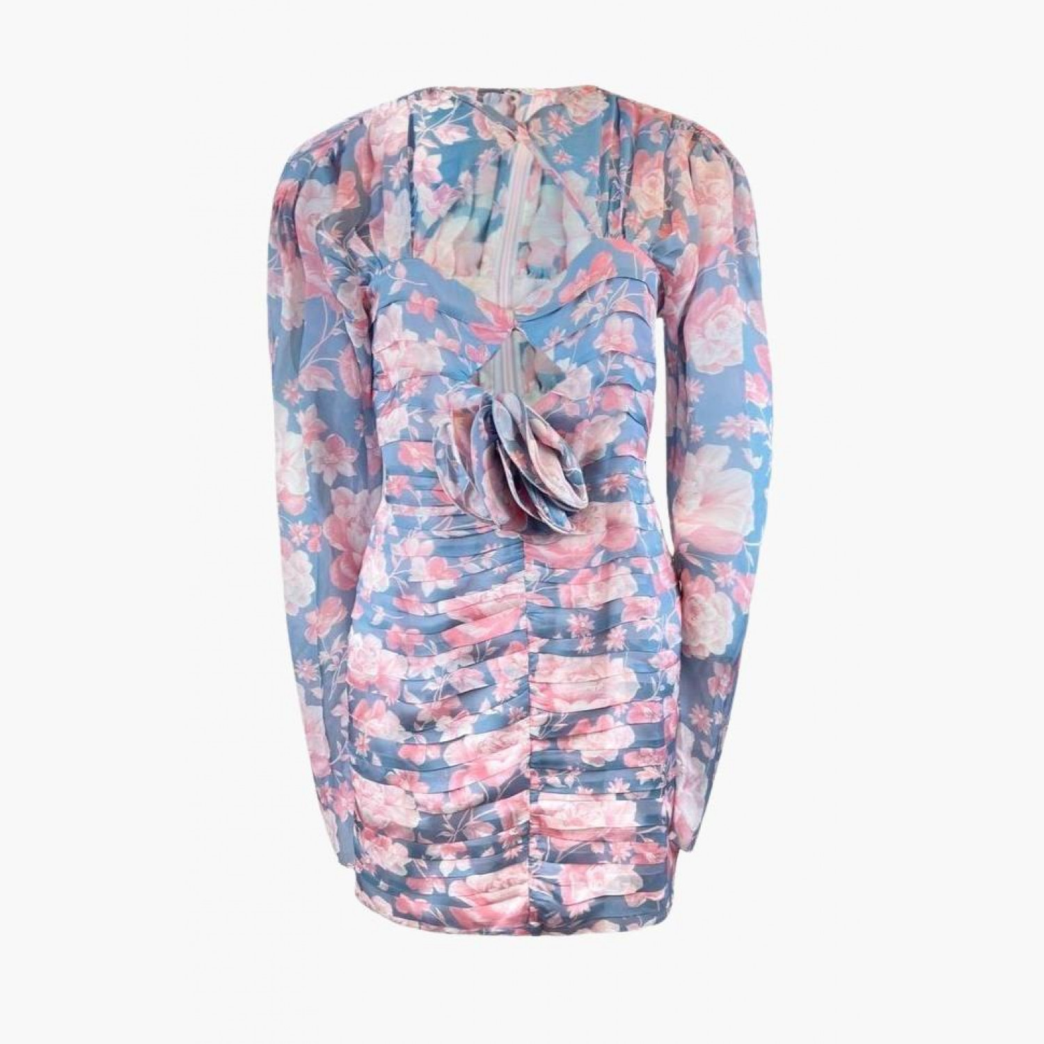 Silk dress with gathers and a removable decorative flower on a pin. In good condition, with wear marks.